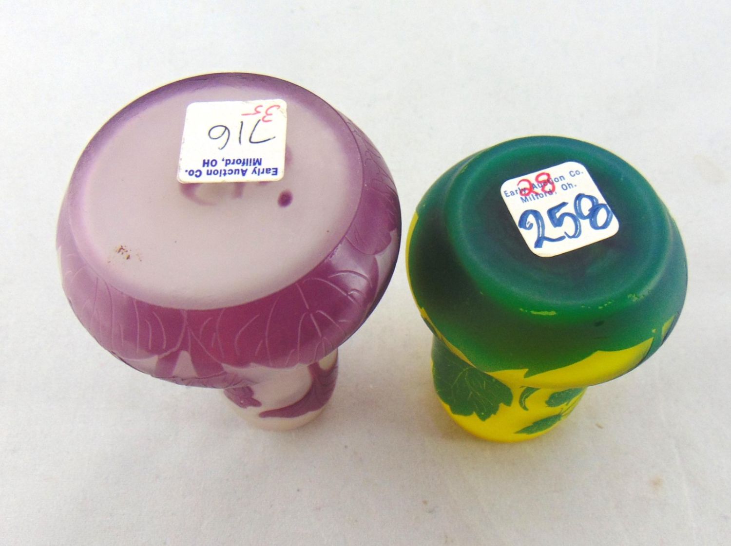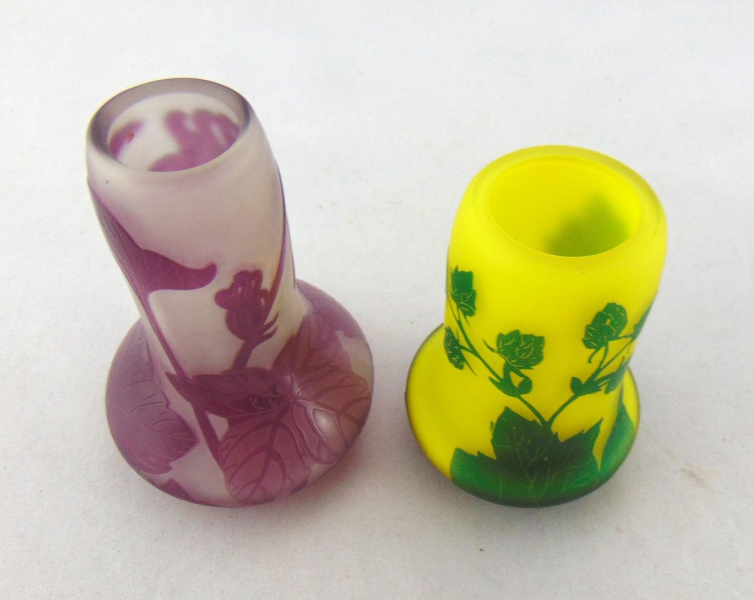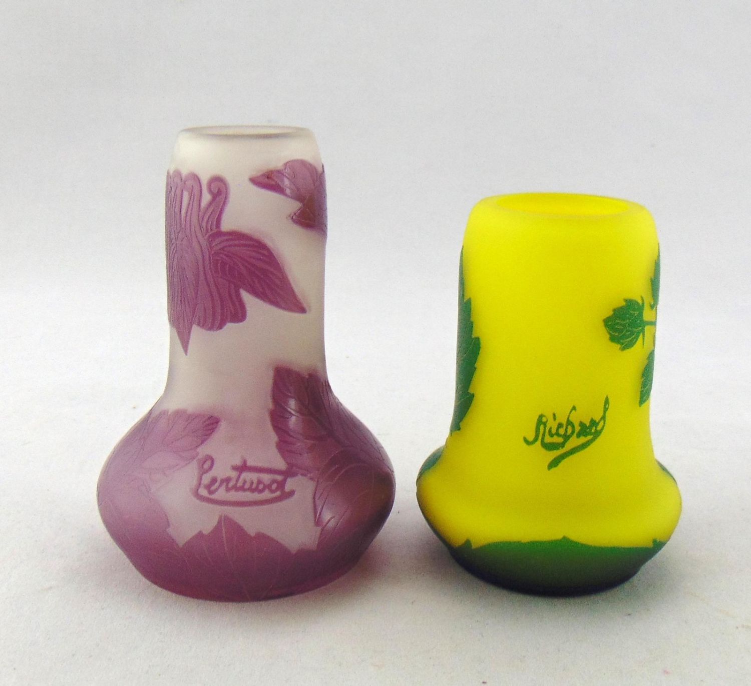 Including a Richard in yellow glass with blue leaves and seedpods, signed Richard, together with a signed Pertusot vase with purple leaves, tallest 3 3/4" ht. Condition: good with no defects found.