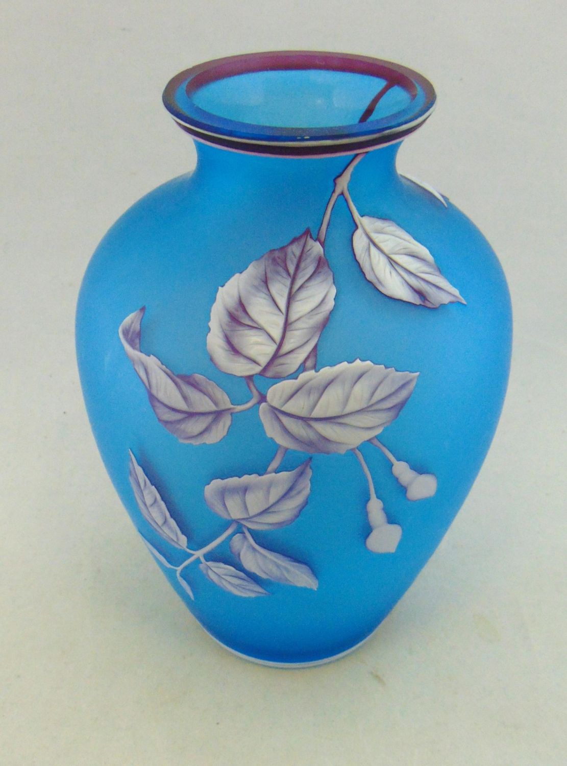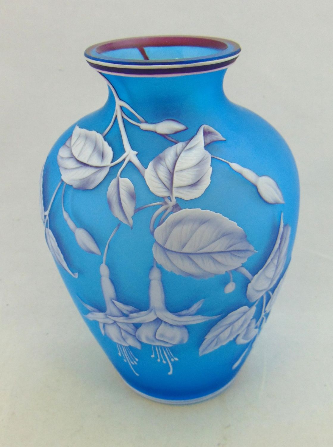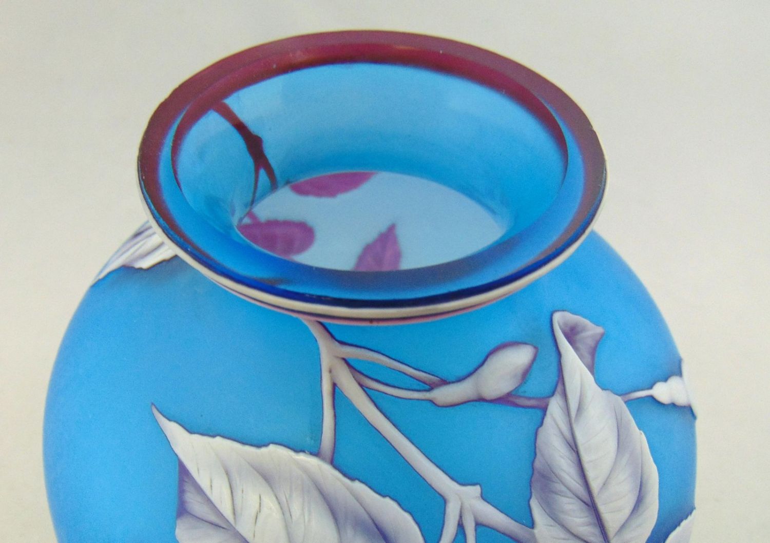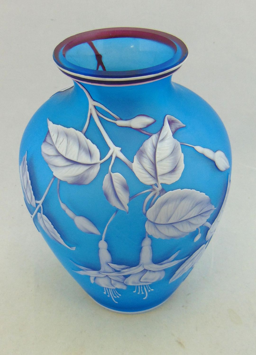 Shouldered form Prussian blue cameo vase decorated with a white over blue cascading Fuchsia, 7 1/2" ht. Condition: good with no defects found.