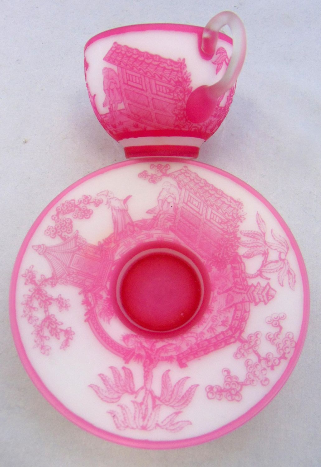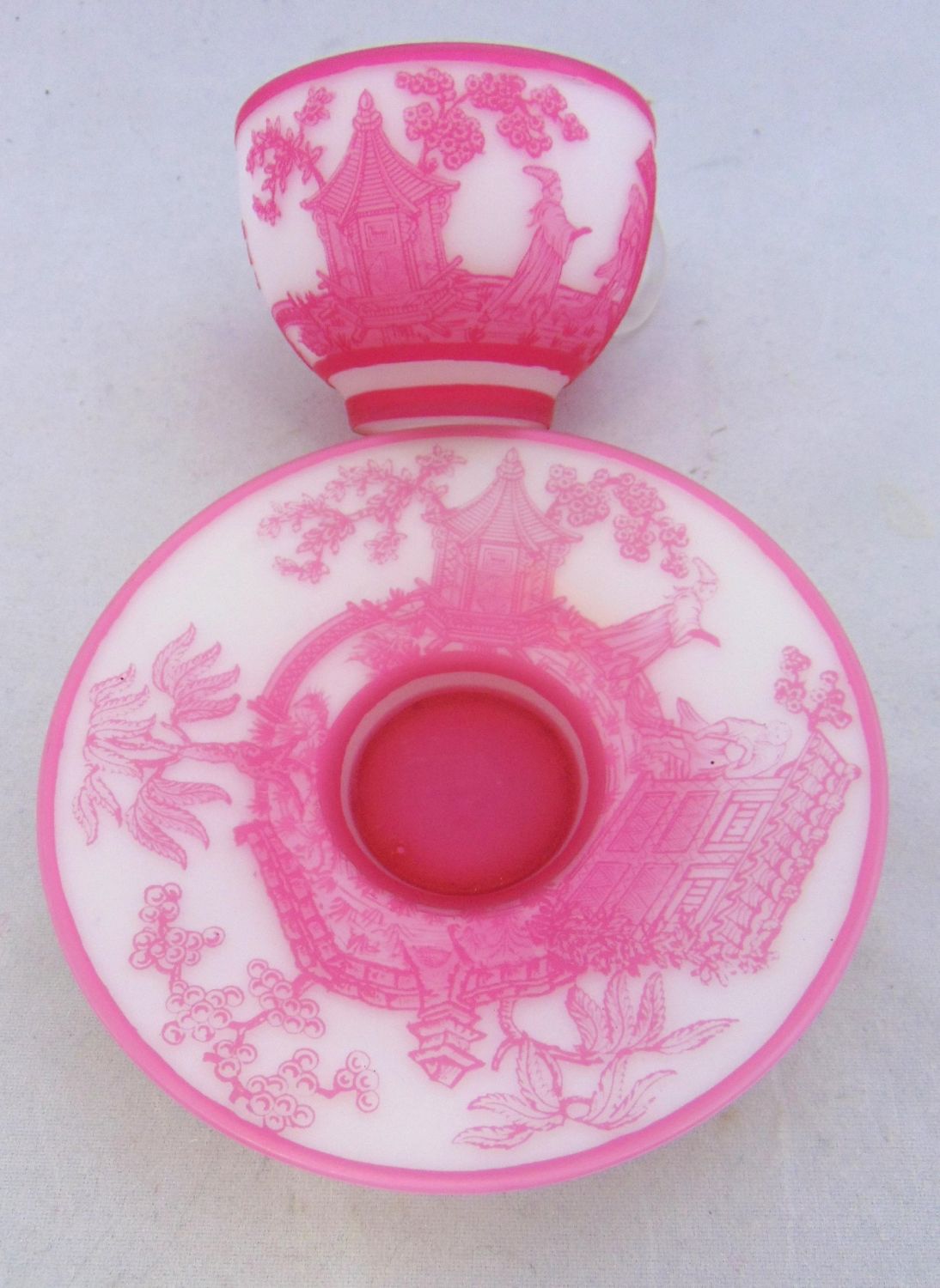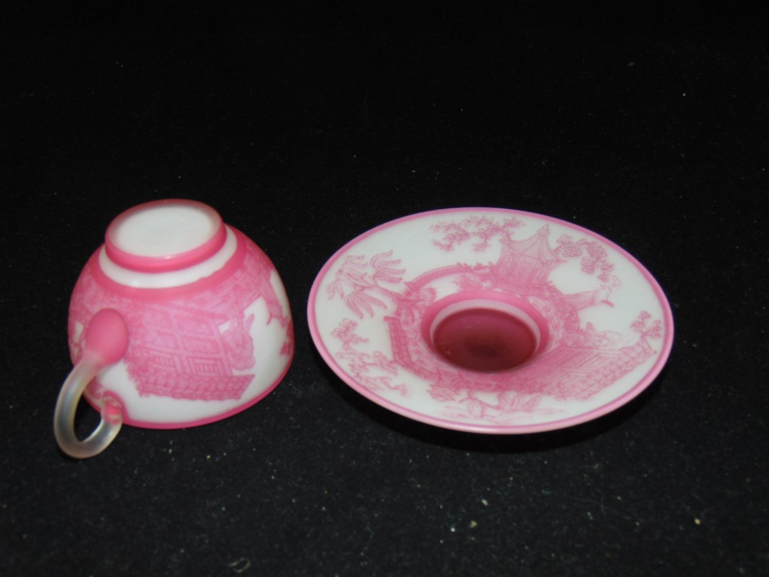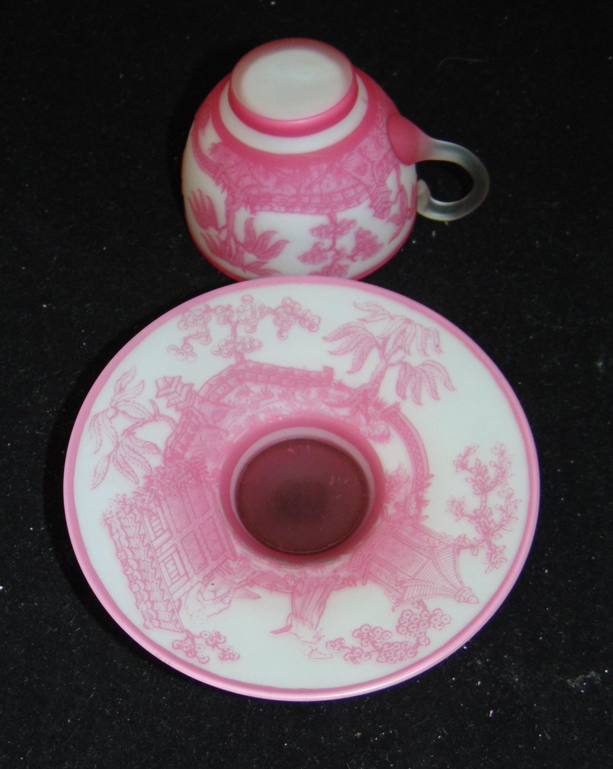 Rare English cameo Rose du Berry over white cup and saucer with matching scenes of Oriental life on the cup and saucer, saucer with acid stamp Webb, 4 1/2" wide. Condition: good, manufacturing skip on the interior of the cup, the signature is after market.