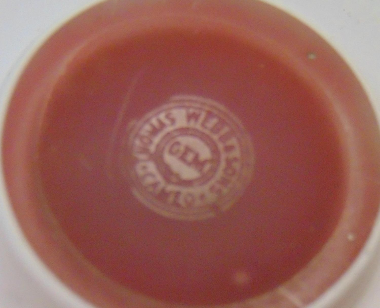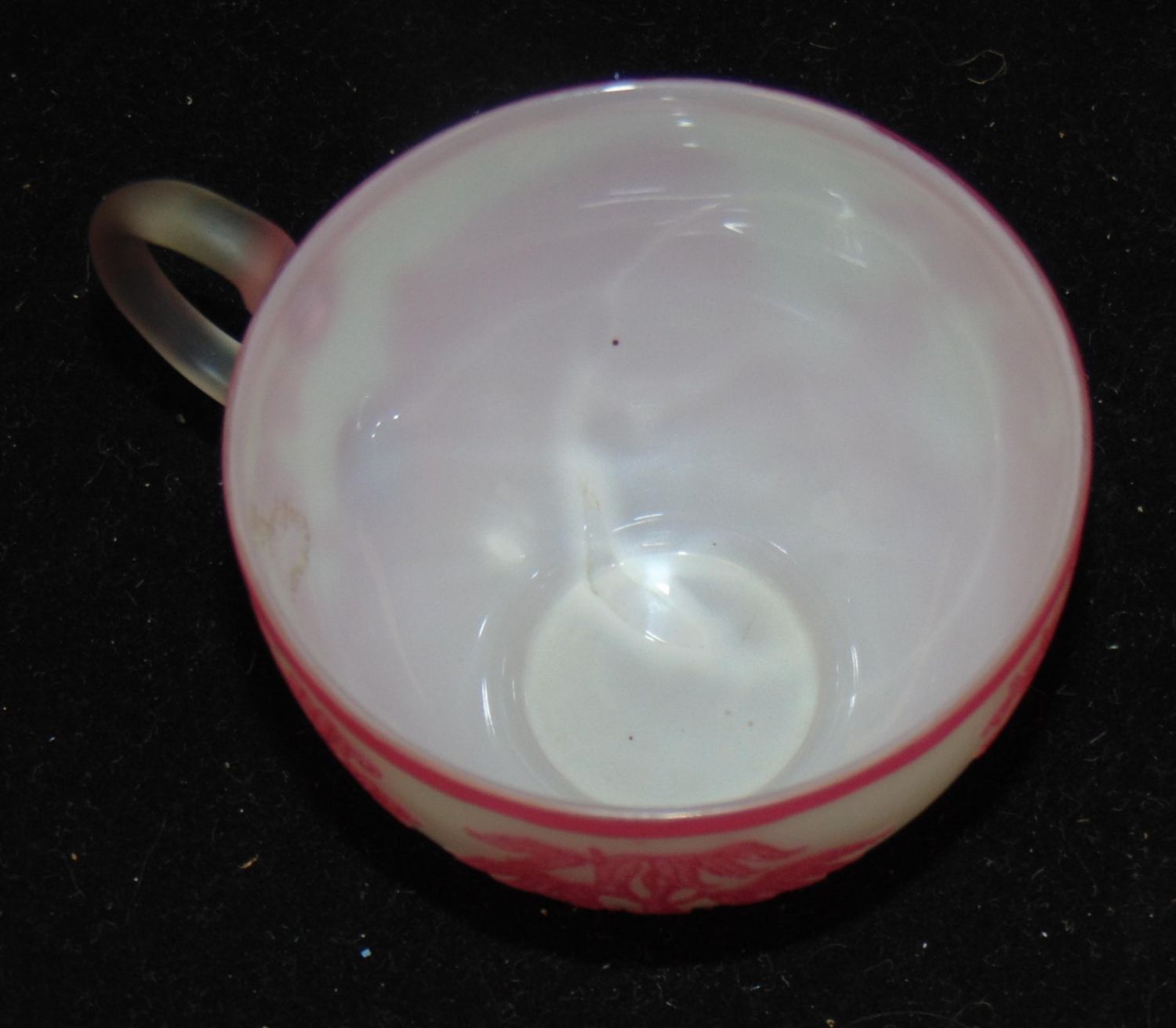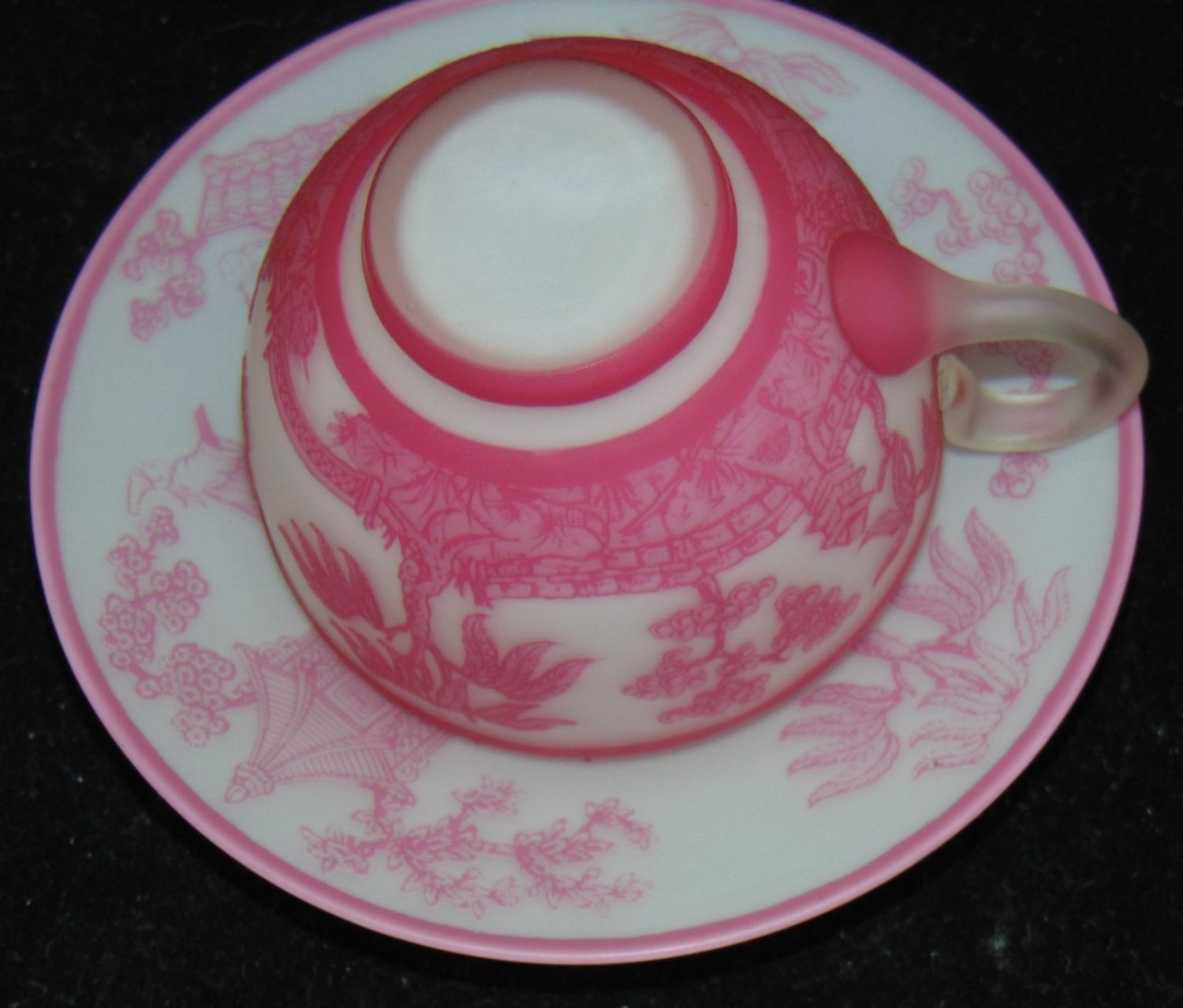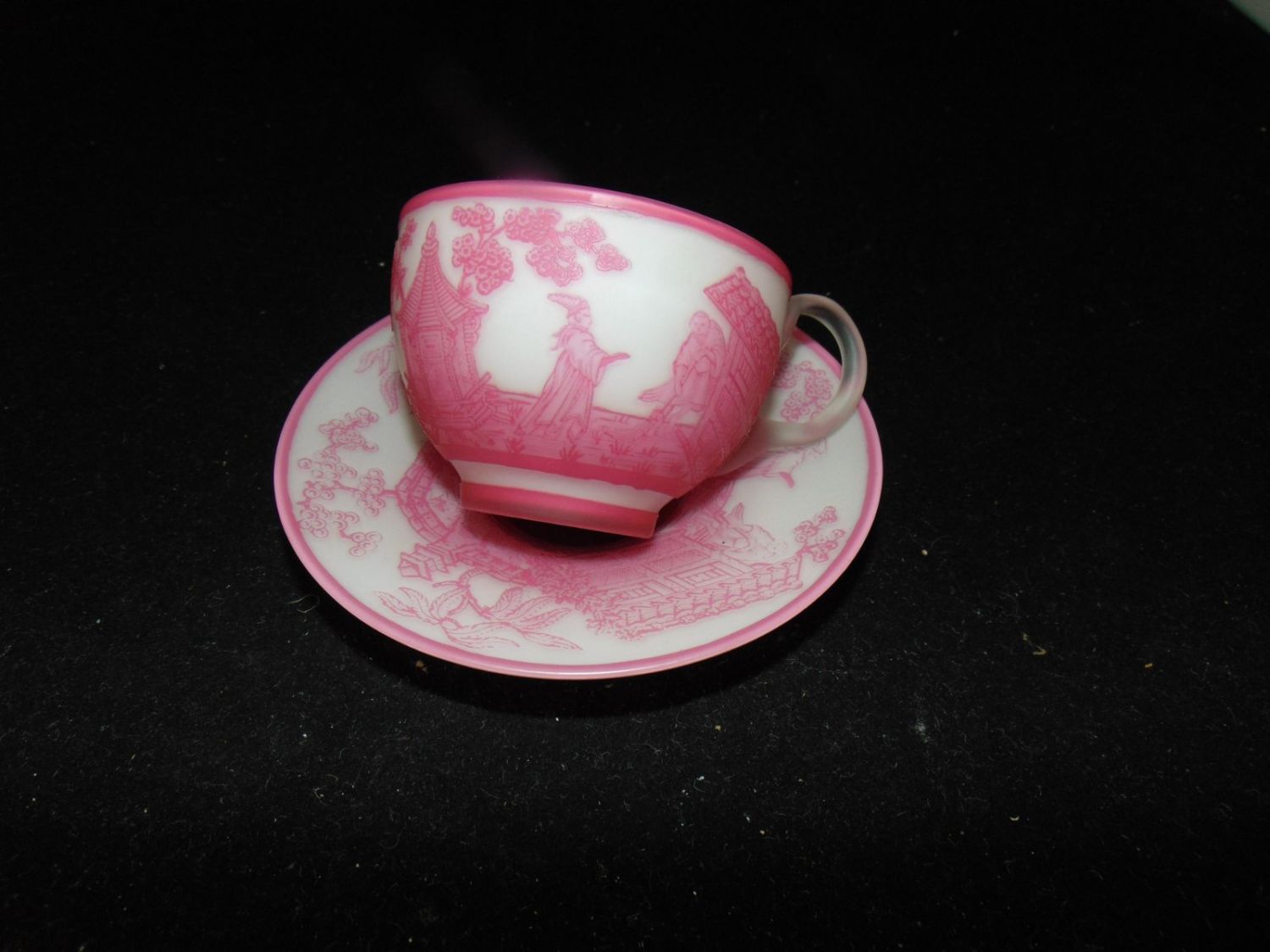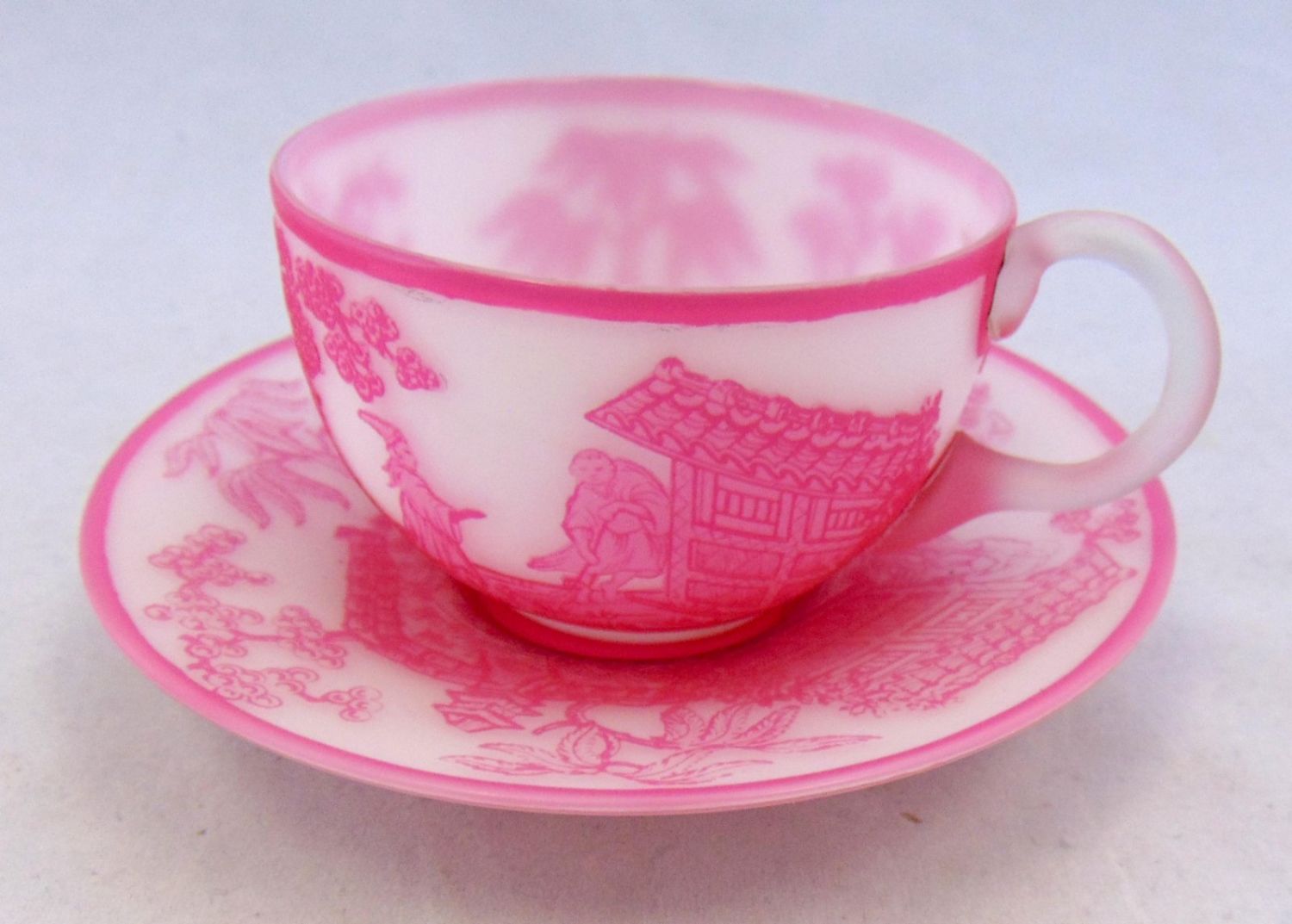 Rare English cameo Rose du Berry over white cup and saucer with matching scenes of Oriental life on the cup and saucer, saucer with acid stamp Webb, 4 1/2" wide. Condition: good, manufacturing skip on the interior of the cup, the signature is after market.