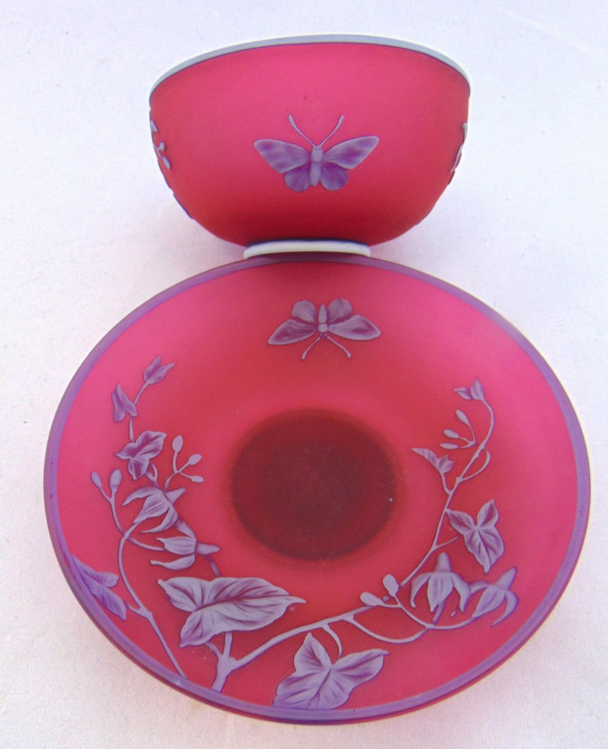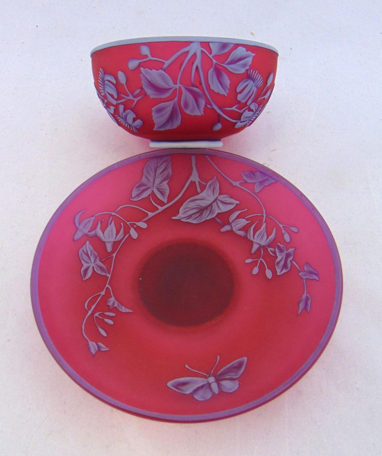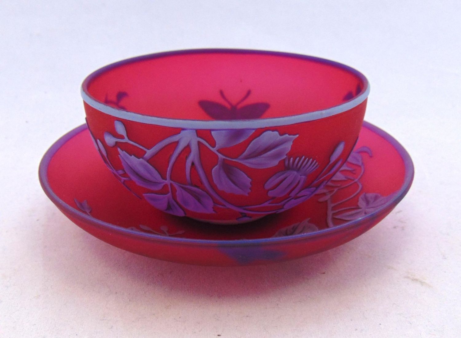 English cameo cup and saucer in red glass decorated with a blue over white flowering vine and butterfly, half moon Webb signature, 4 1/2" wide. Condition: good with no defects found