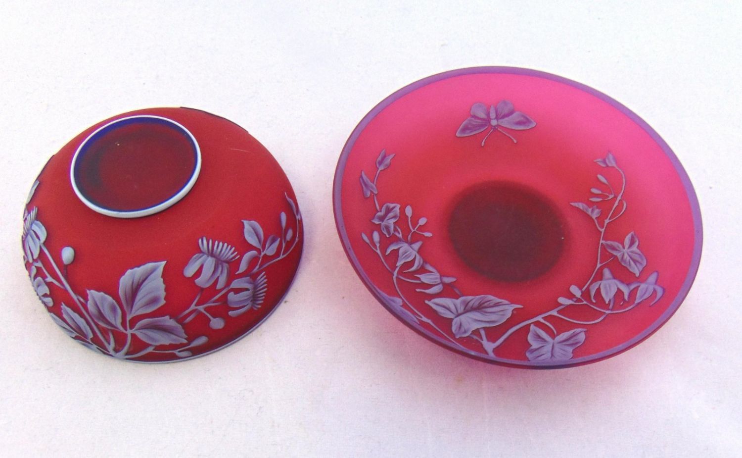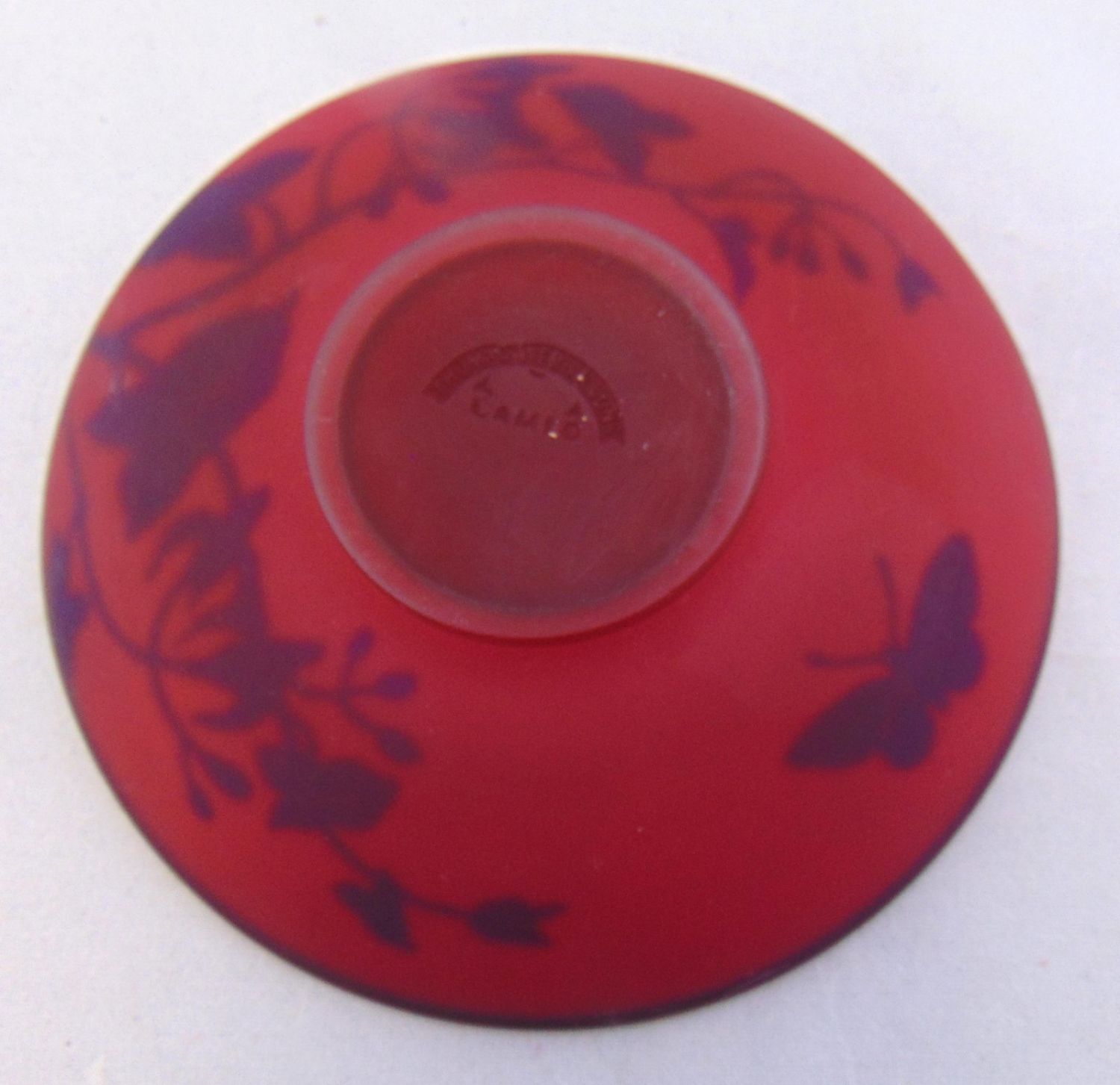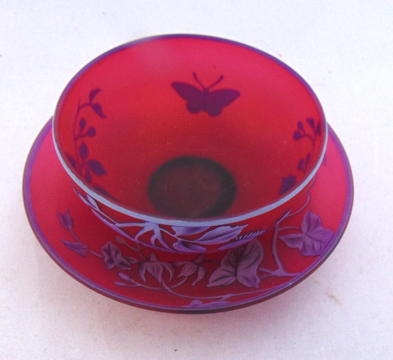 English cameo cup and saucer in red glass decorated with a blue over white flowering vine and butterfly, half moon Webb signature, 4 1/2" wide. Condition: good with no defects found