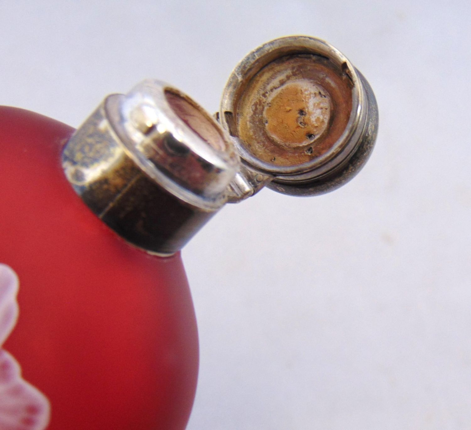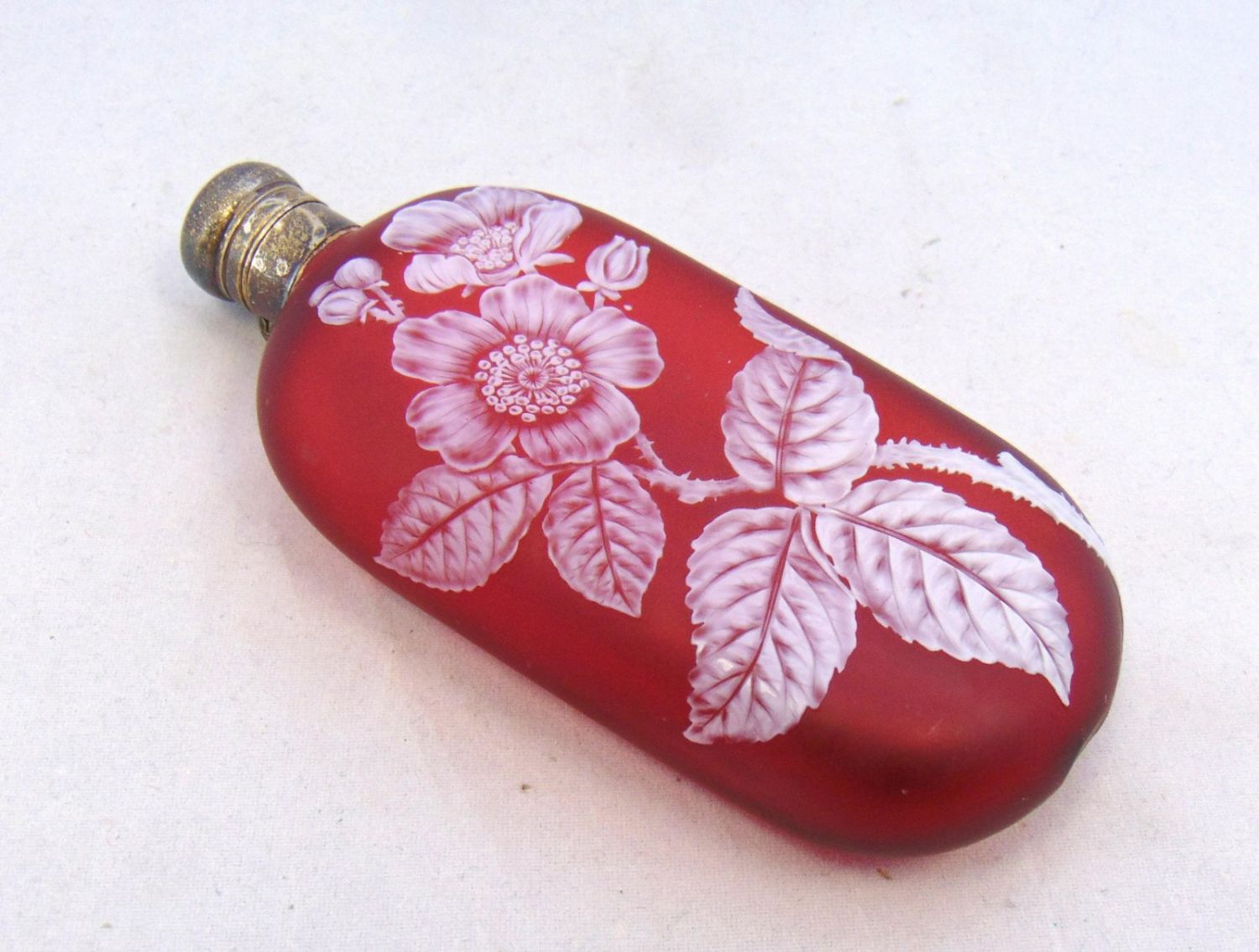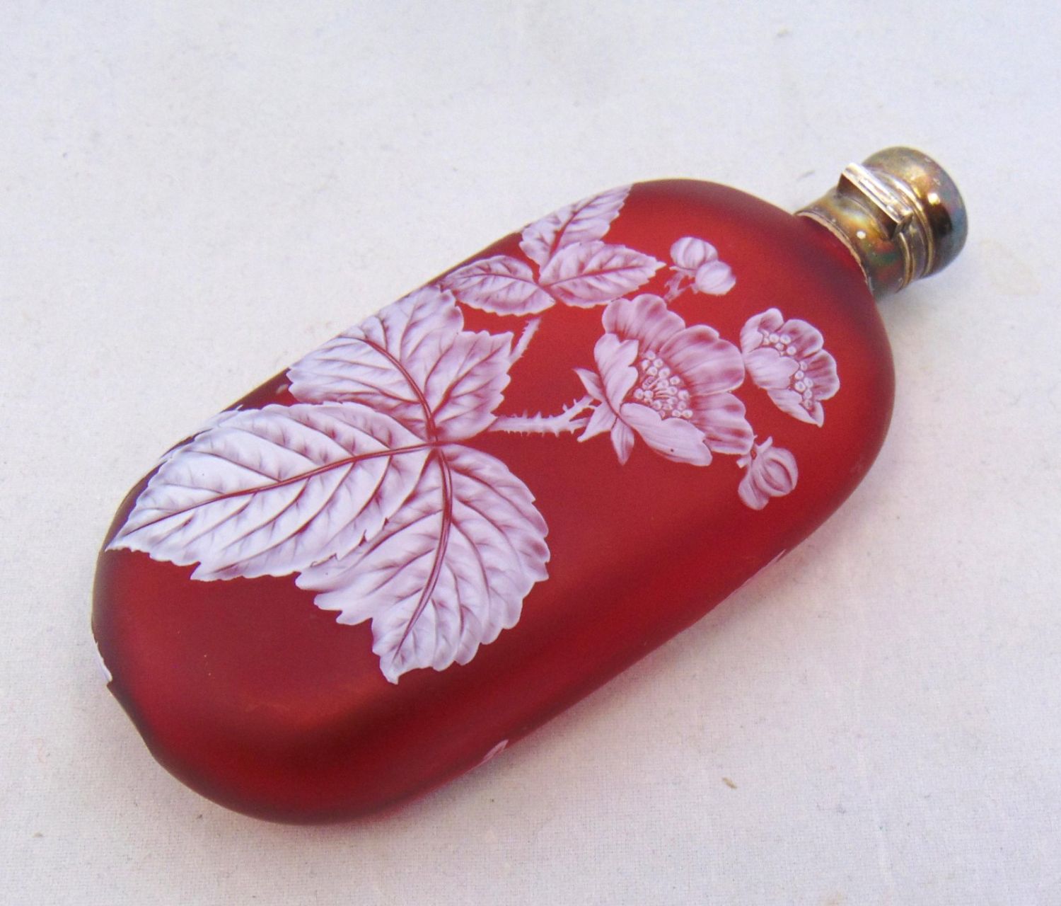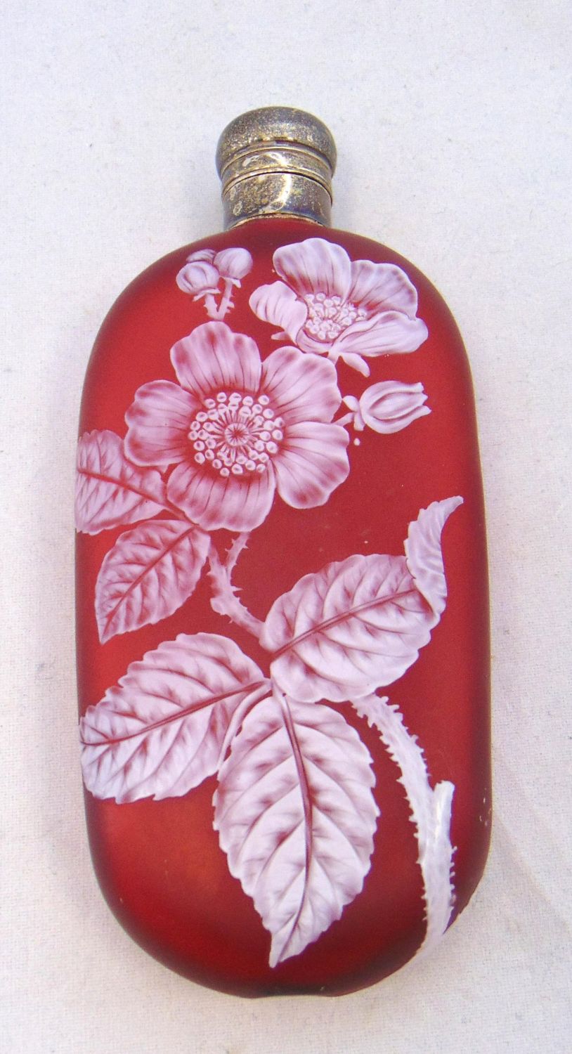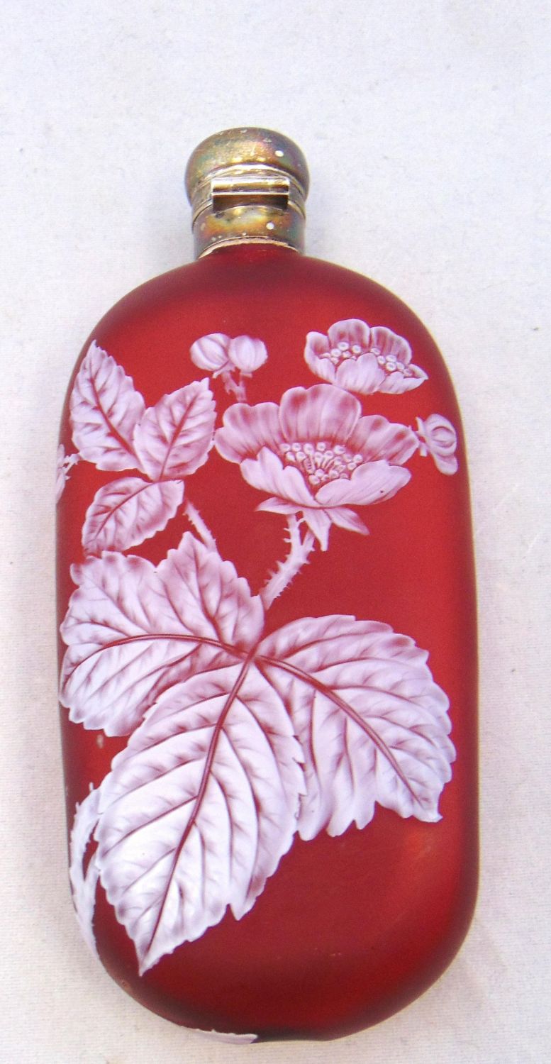 Large English cameo lay down flask in red glass decorated with a branching dogwood blossom on the front and back, fitted with a lock twist sterling lid, 5 3/4" long Condition: good with no defects found.