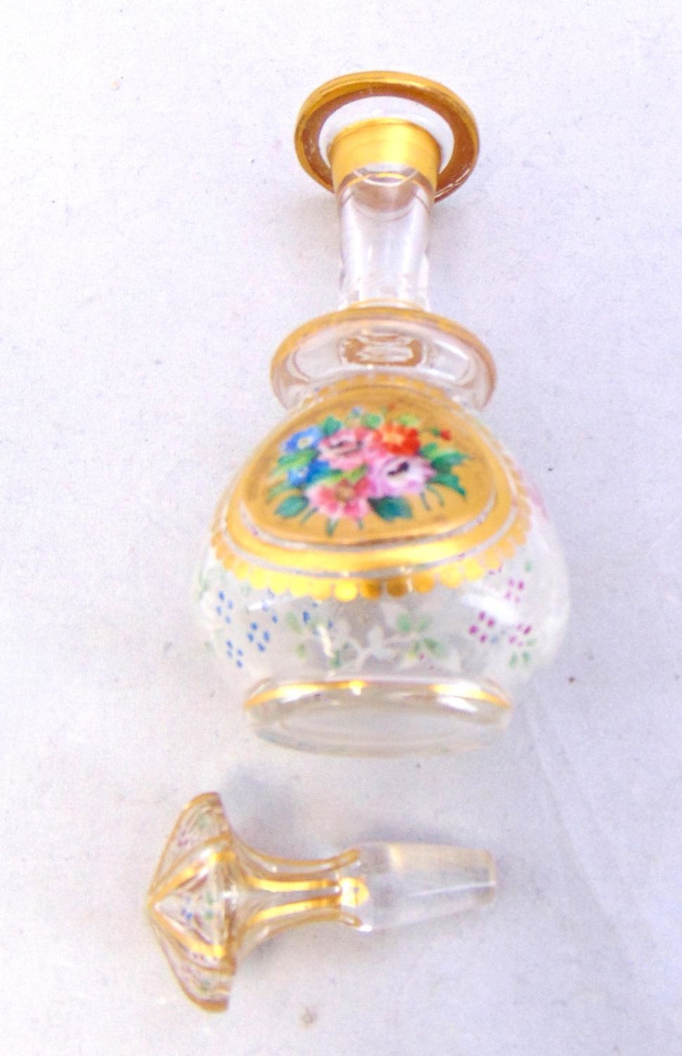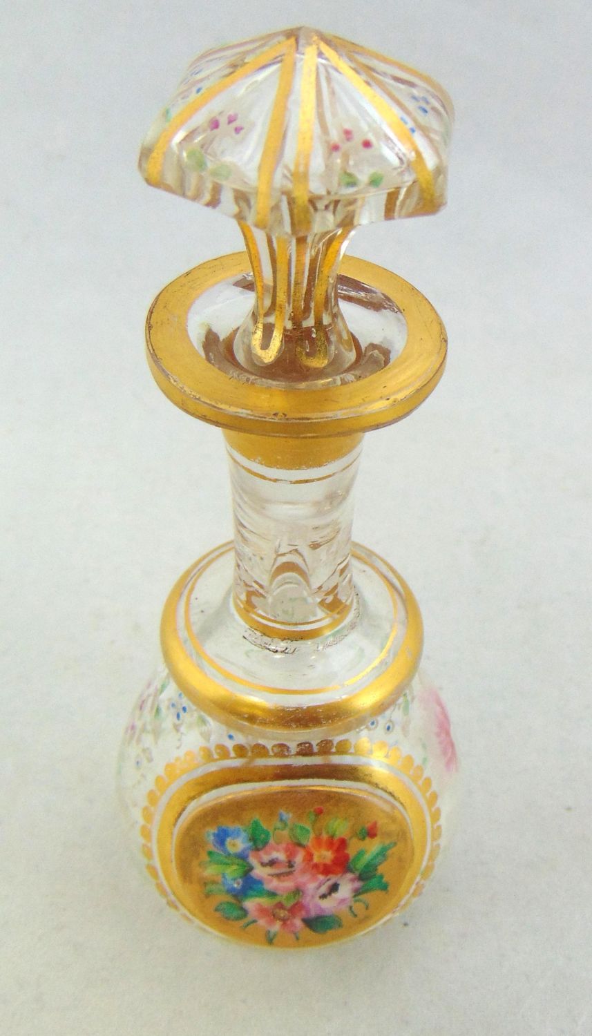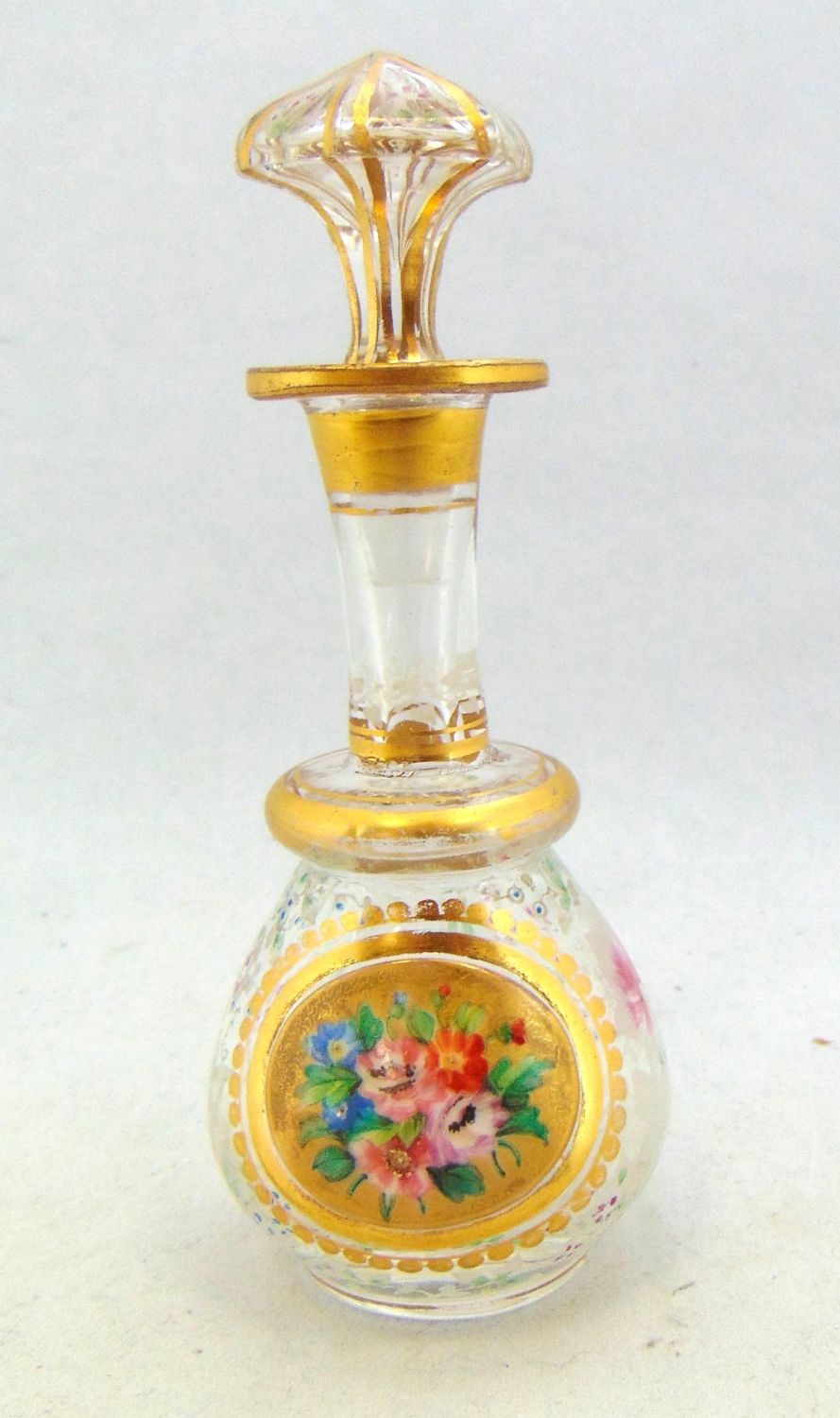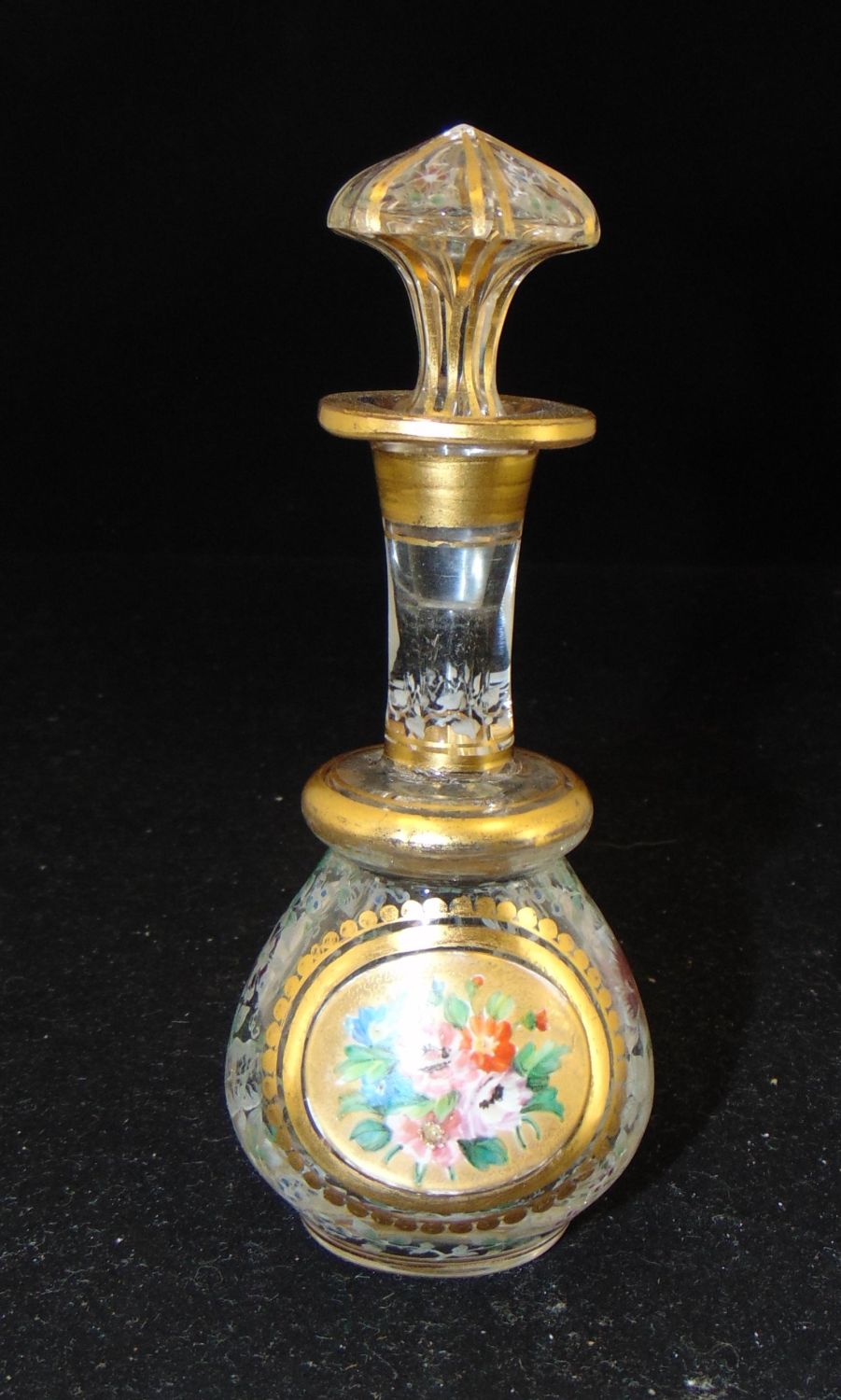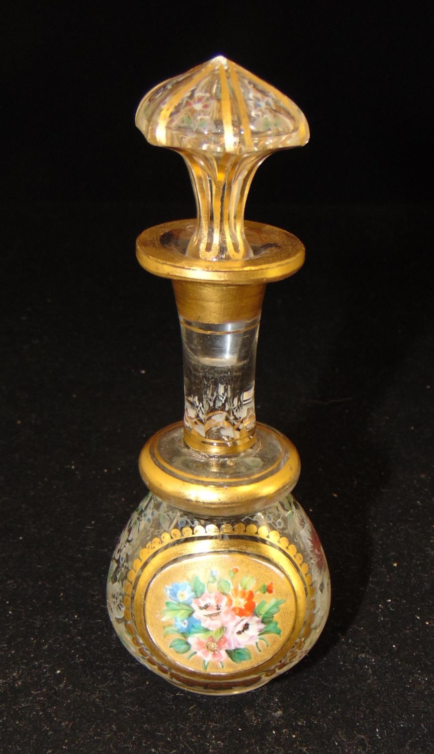 Bulbous gilt stick form in clear glass decorated with a gold medallion of flowers and overall color infused etched flowers, 5 3/4" ht. Condition: goo, slight wear to the gilt