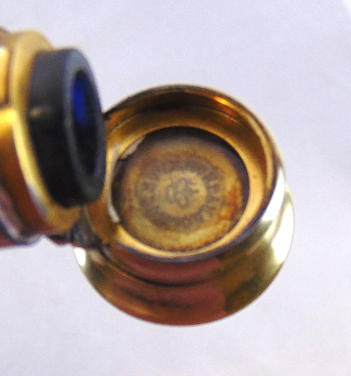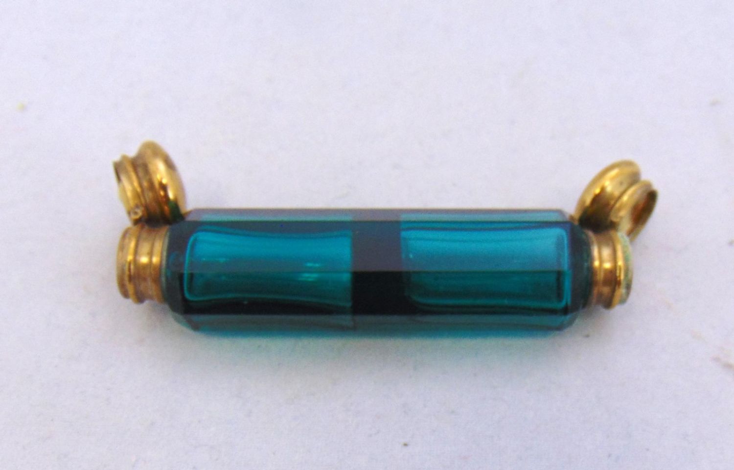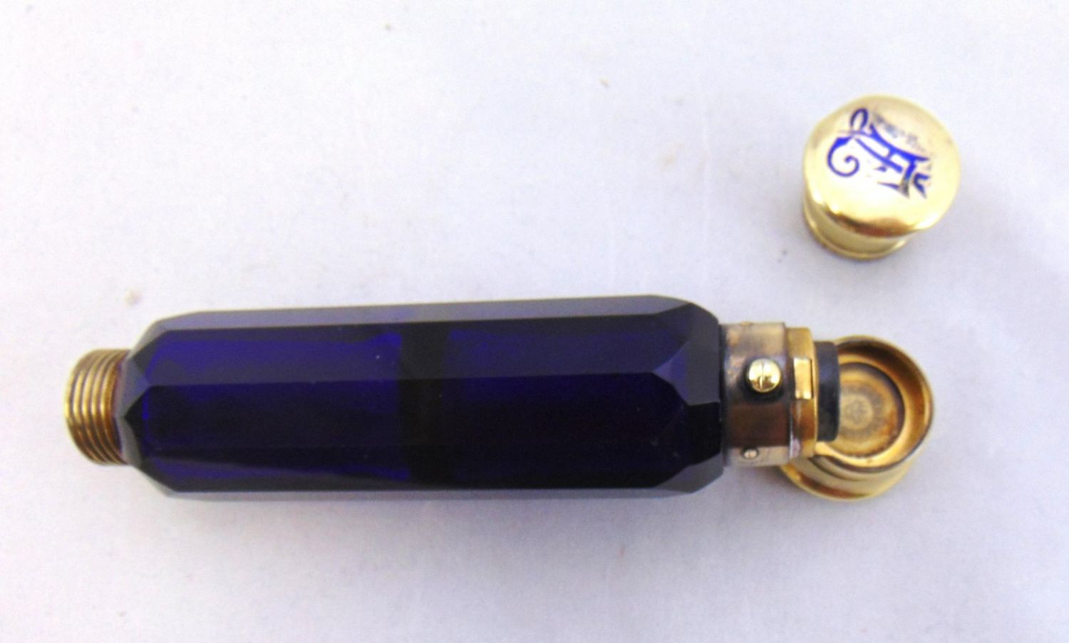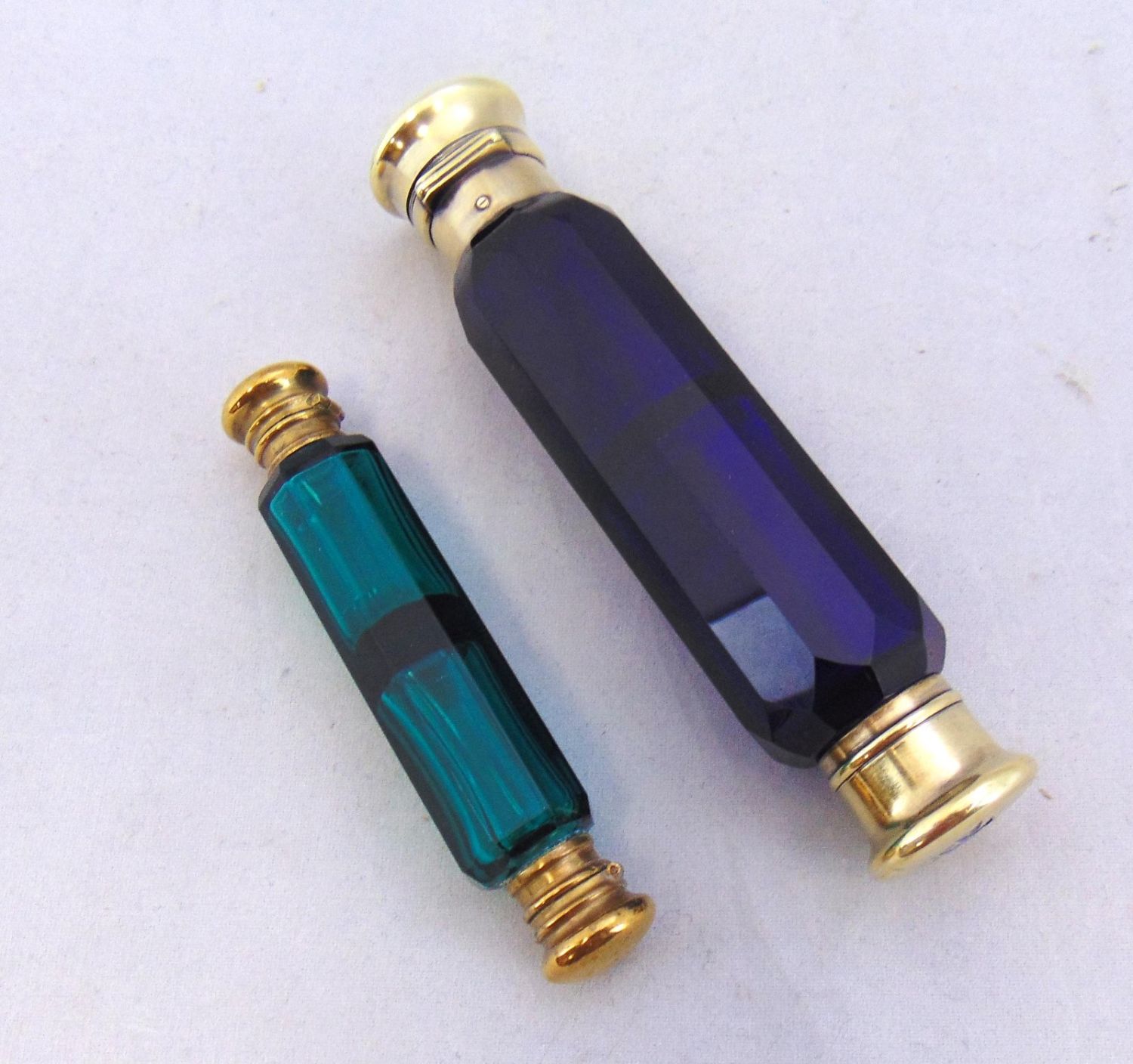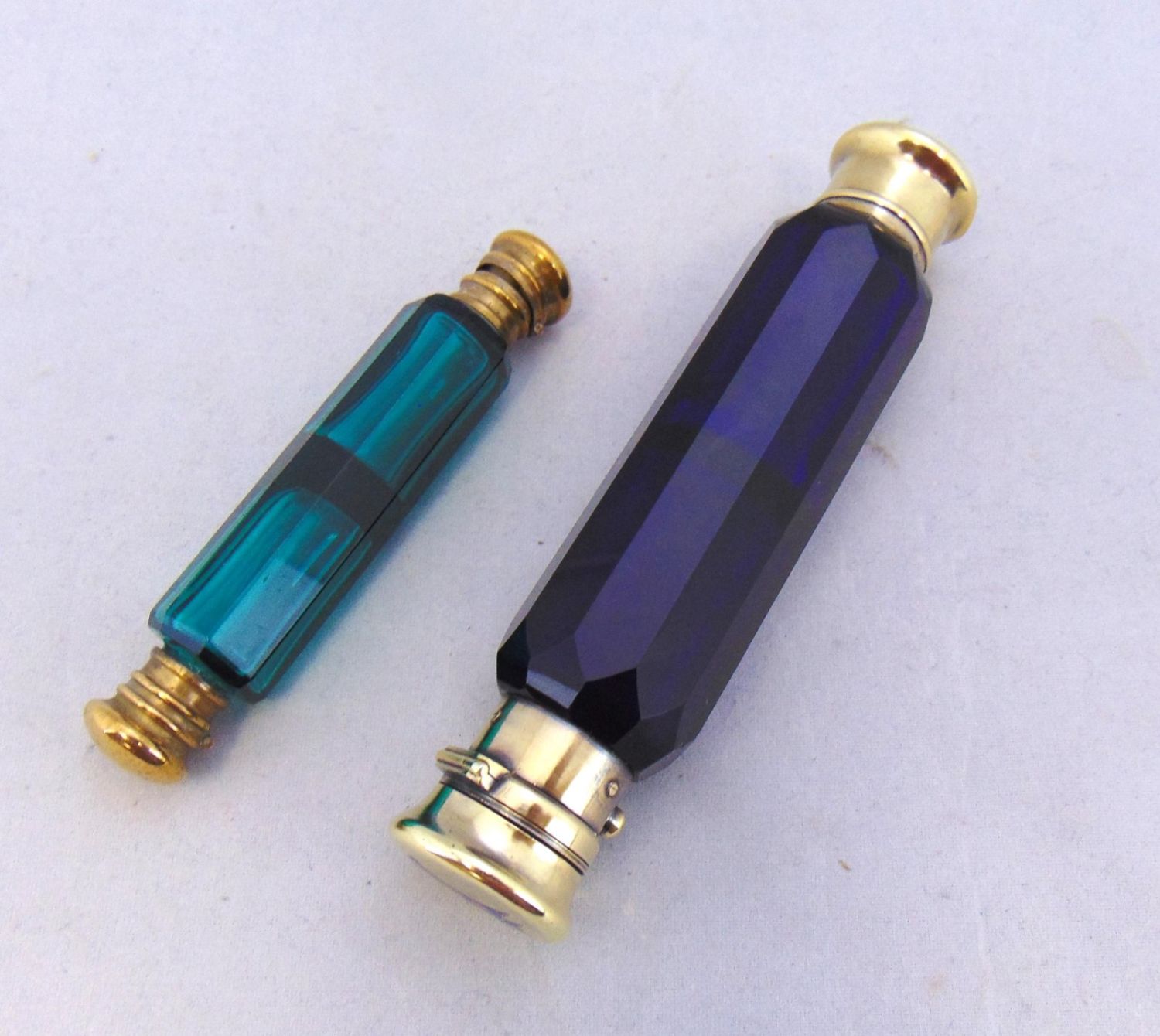Two faceted lay down perfume bottles including a large cobalt with cut monogram FL lids, together with a smaller green, largest 5 1/2" long. Condition: good with no defects found.