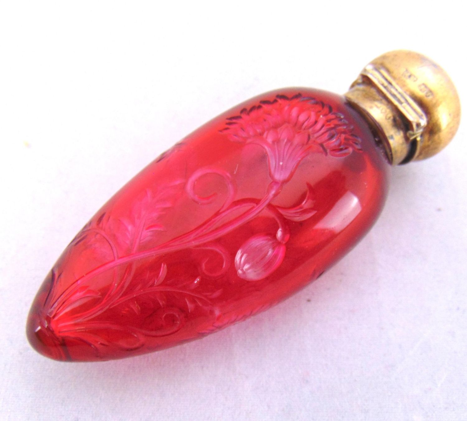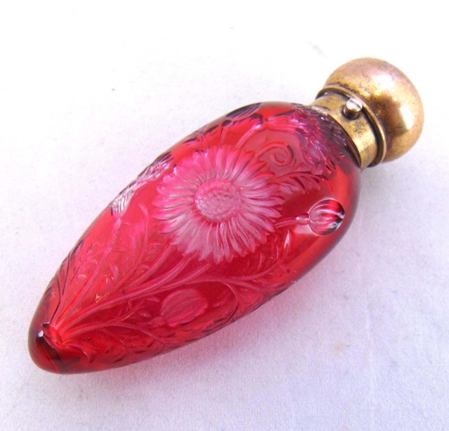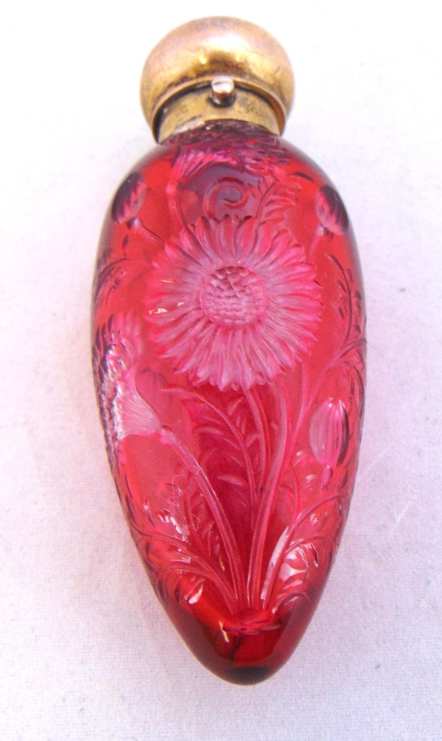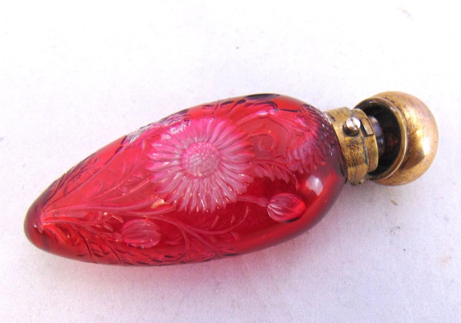 Tear drop form ruby cut to clear perfume bottle art nouveau flowers on front and back, hallmark gold washed lid, 4" long. Condition: good with no defects found.