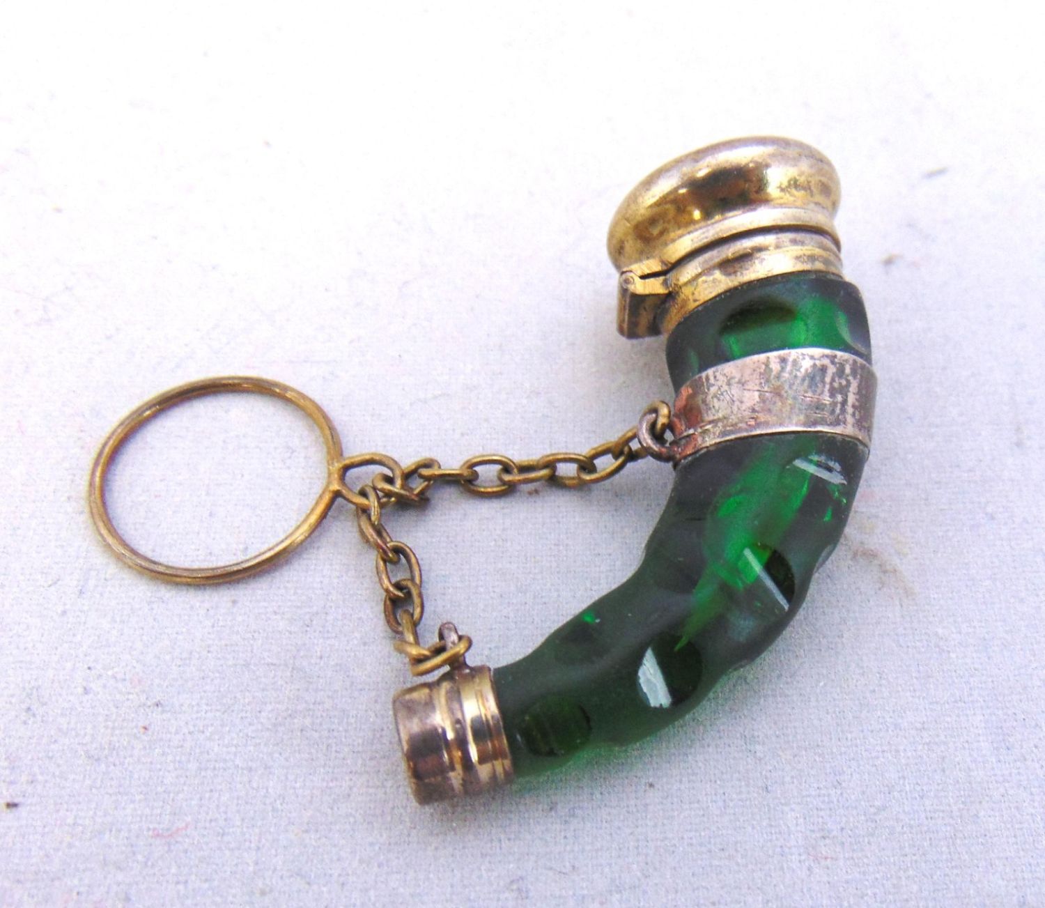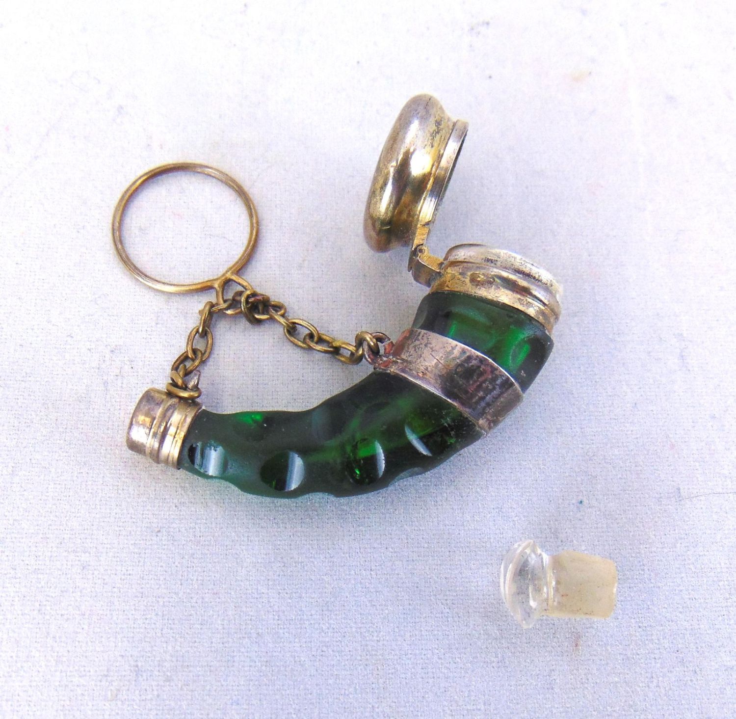 Green cut glass perfume bottle with hanging chain in a horn of plenty design, 2" ht. Condition: good with no defects found.