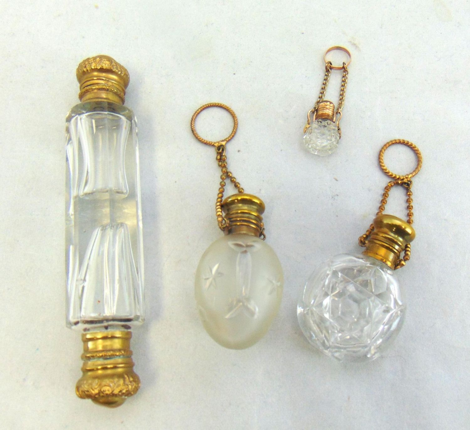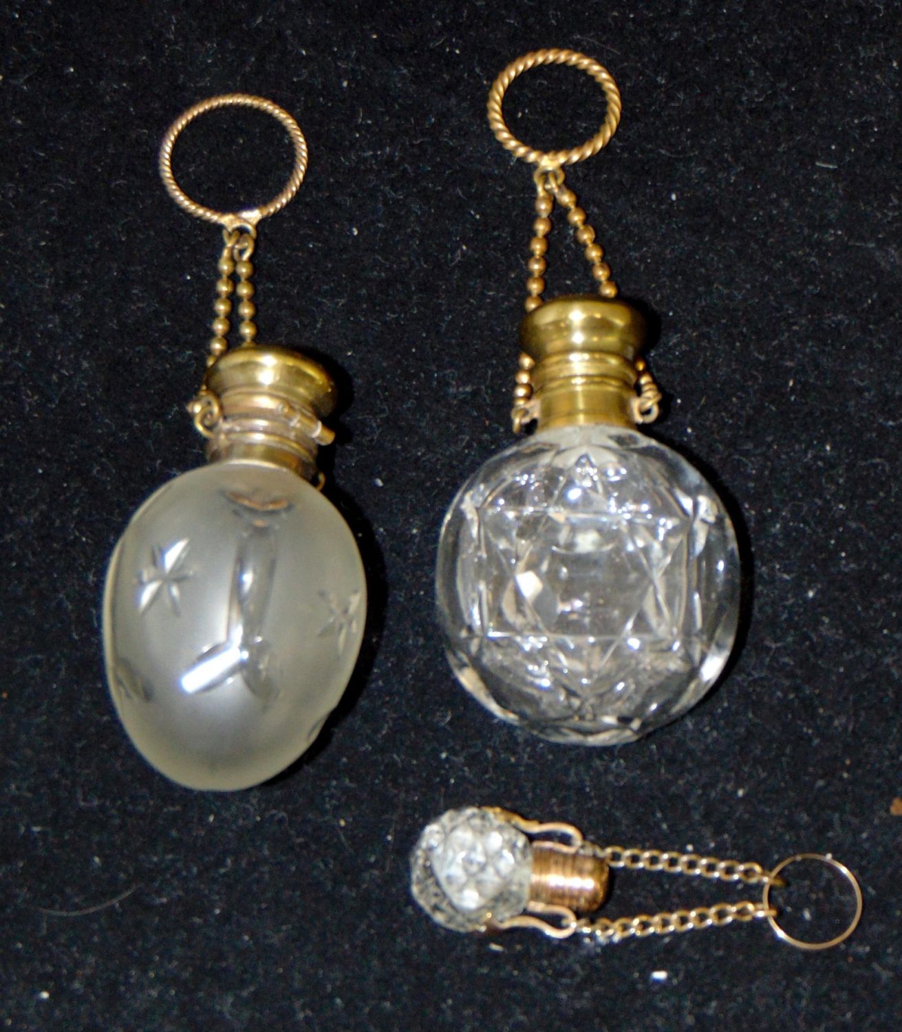 Four cut glass perfume bottles, including the smallest perfume we have sold, small perfume not including the chain 7/8" long. Condition: good with no defects found.
