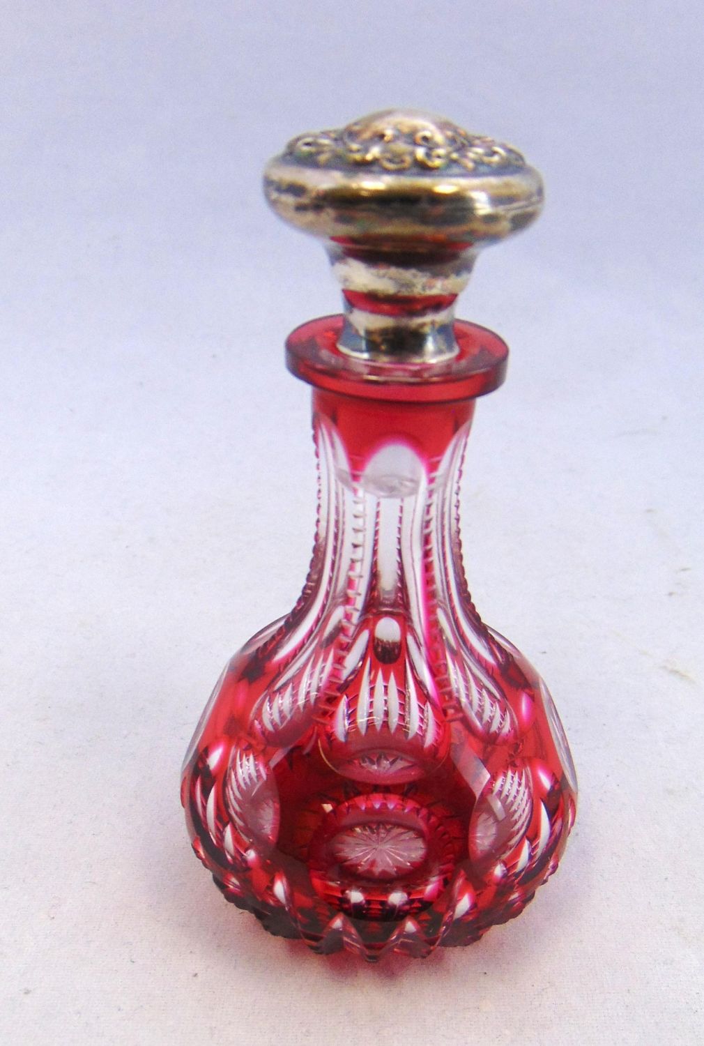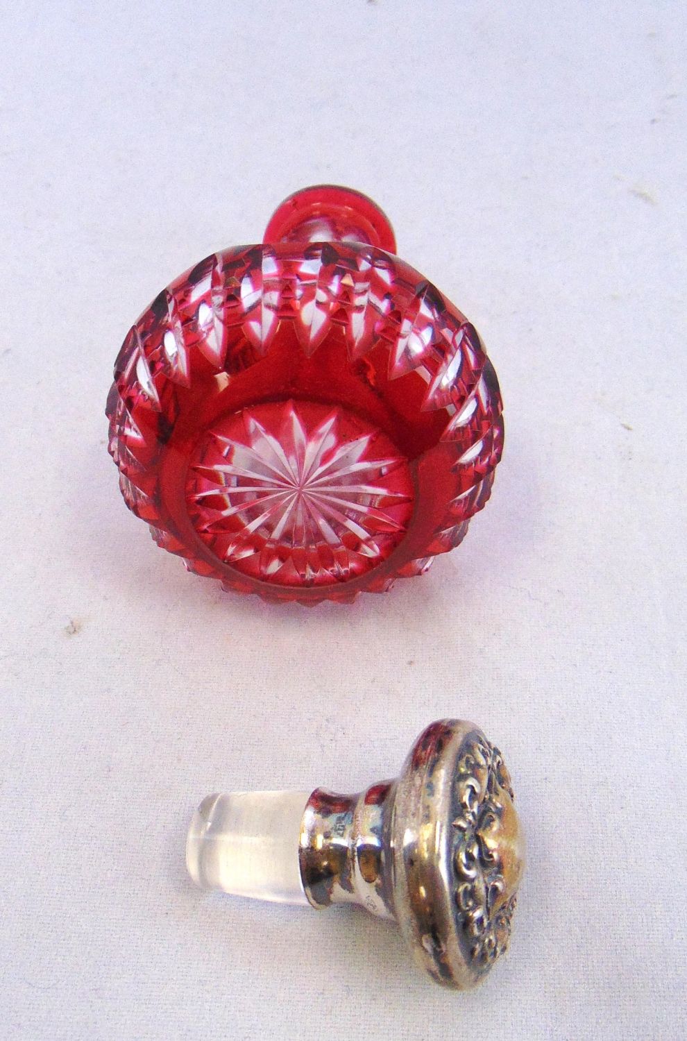 Bulbous form ruby cut to clear perfume bottle with an embossed sterling stopper, 4" ht. Condition: good with no defects found.