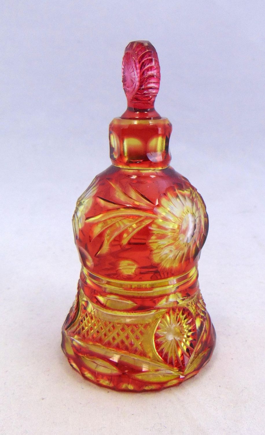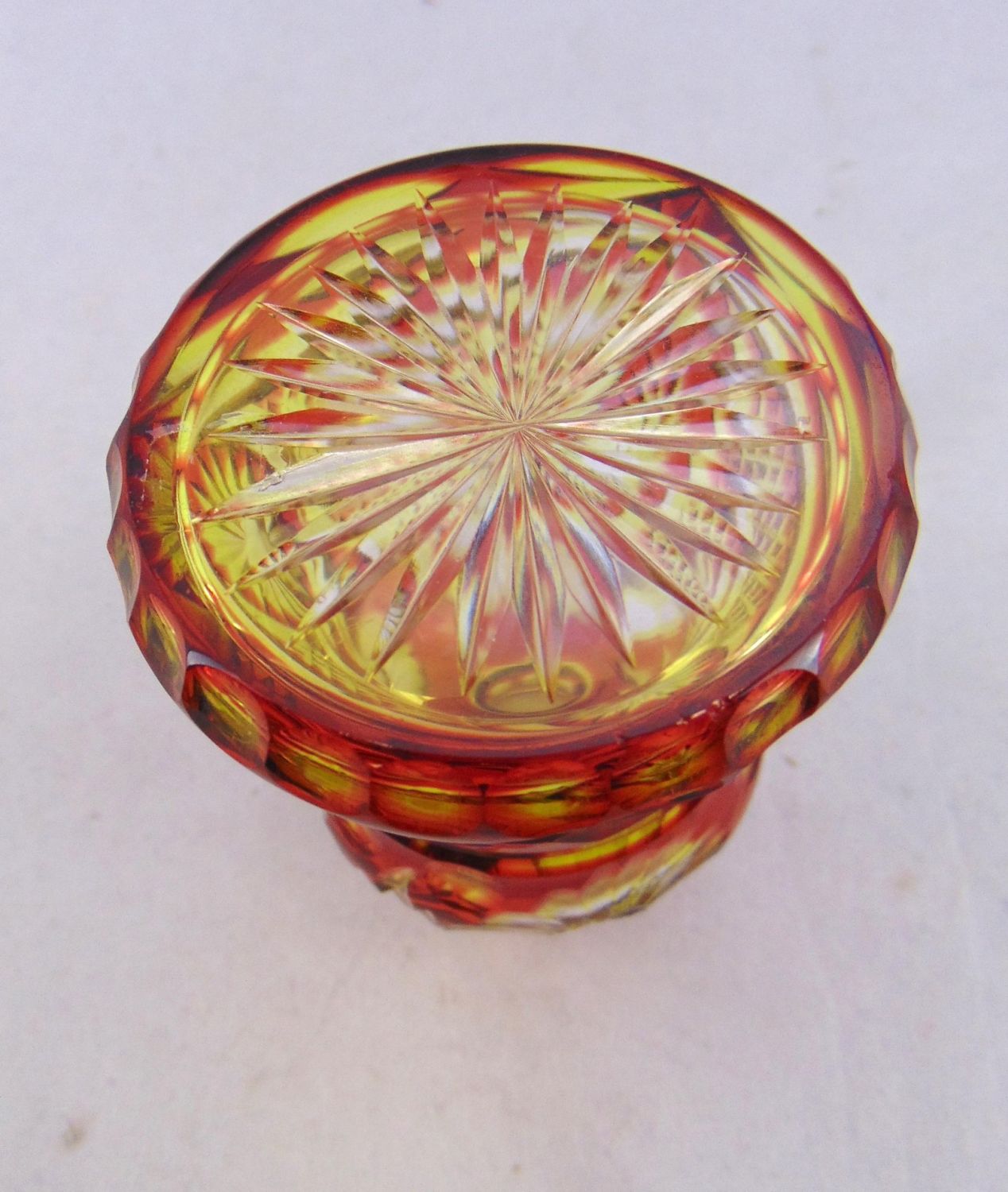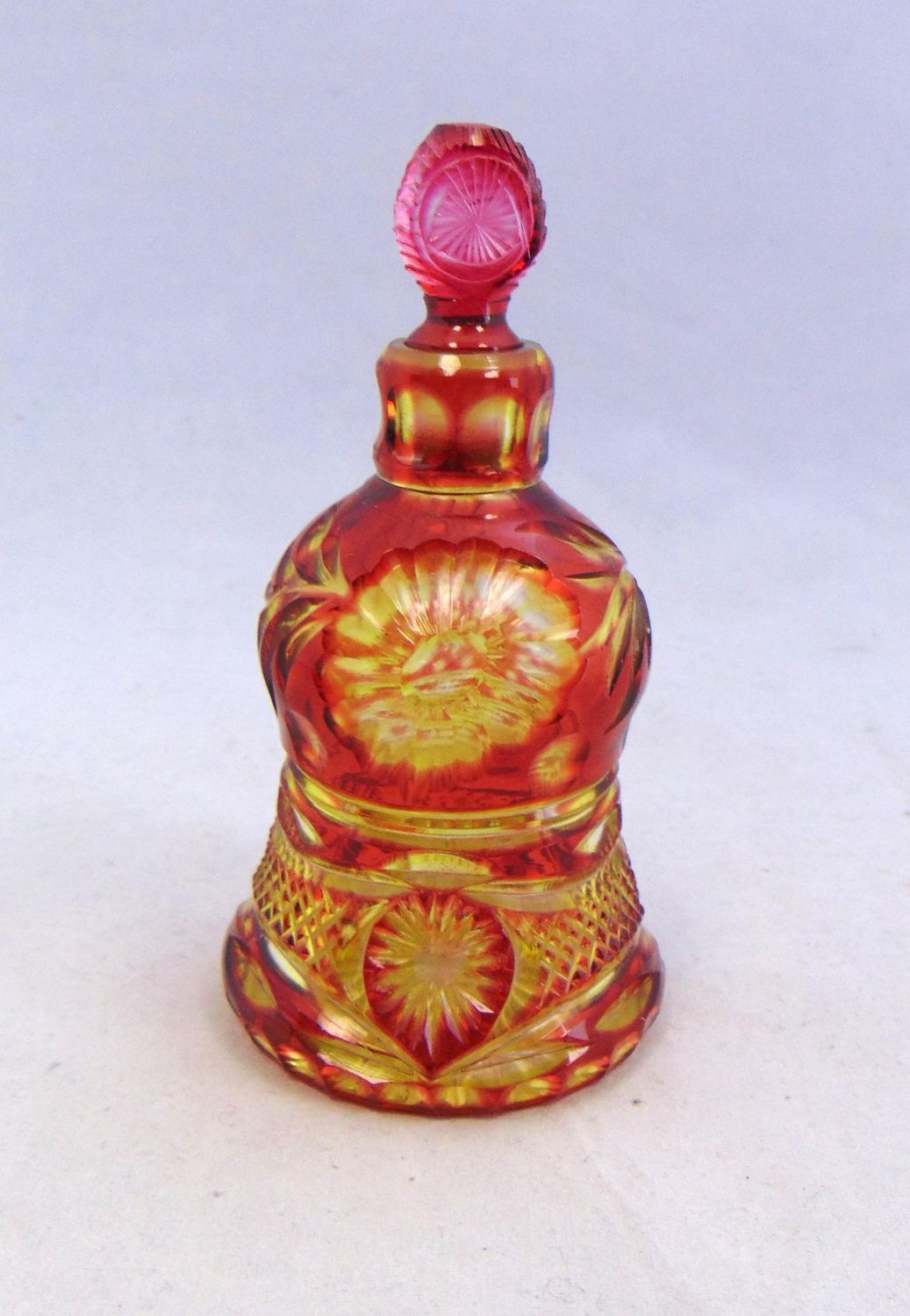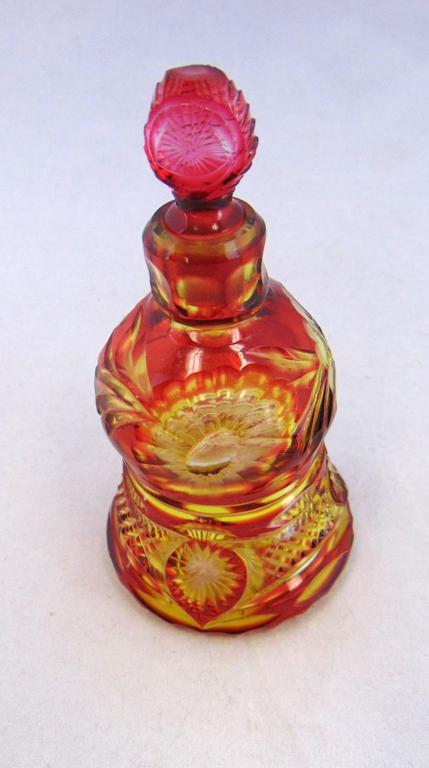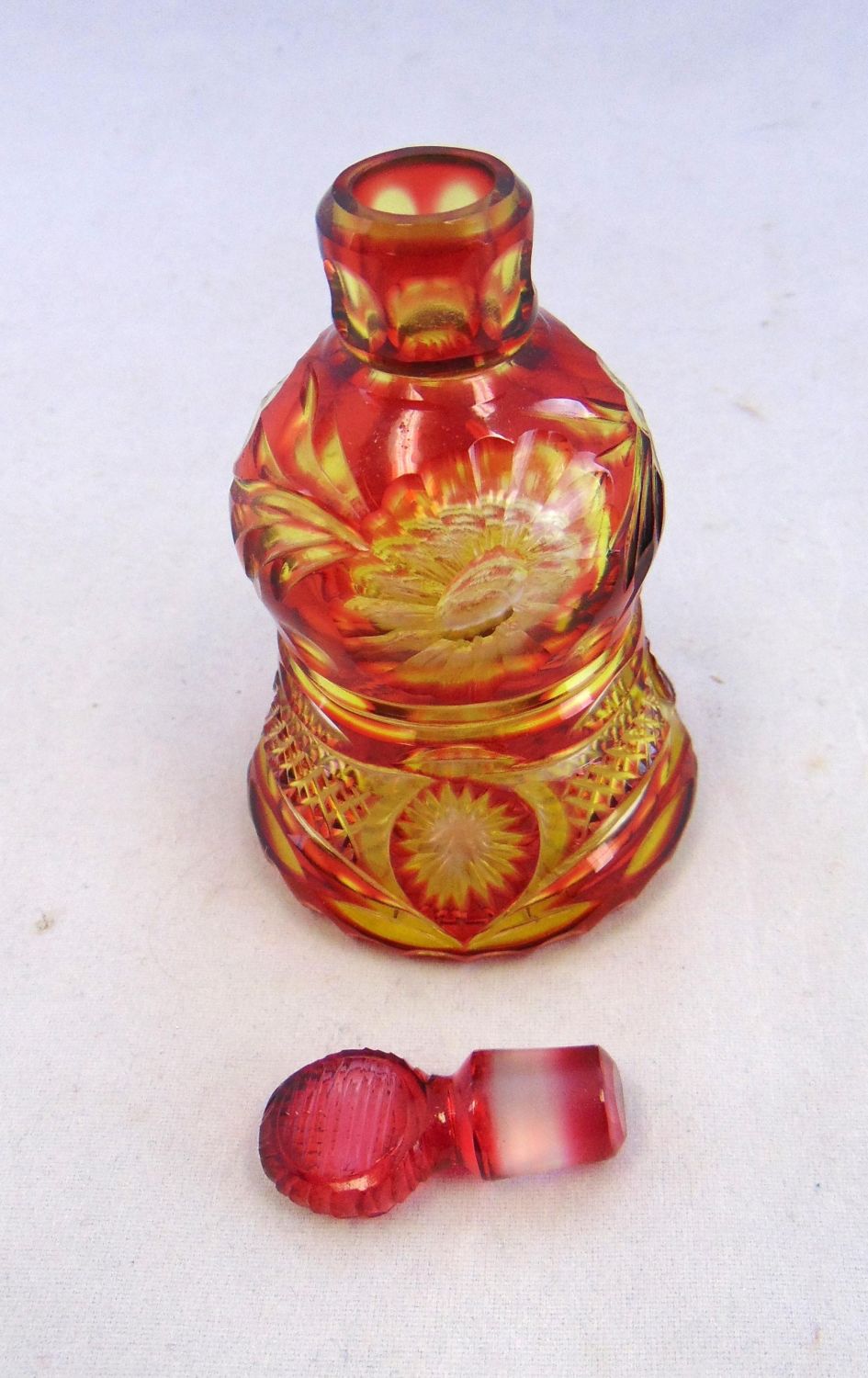 Stevens and Williams ruby cut to amber corset shape perfume with a ruby cut to clear stopper, 4 1/2" ht. Condition: good, stopper cuttings are not uniform from side to side