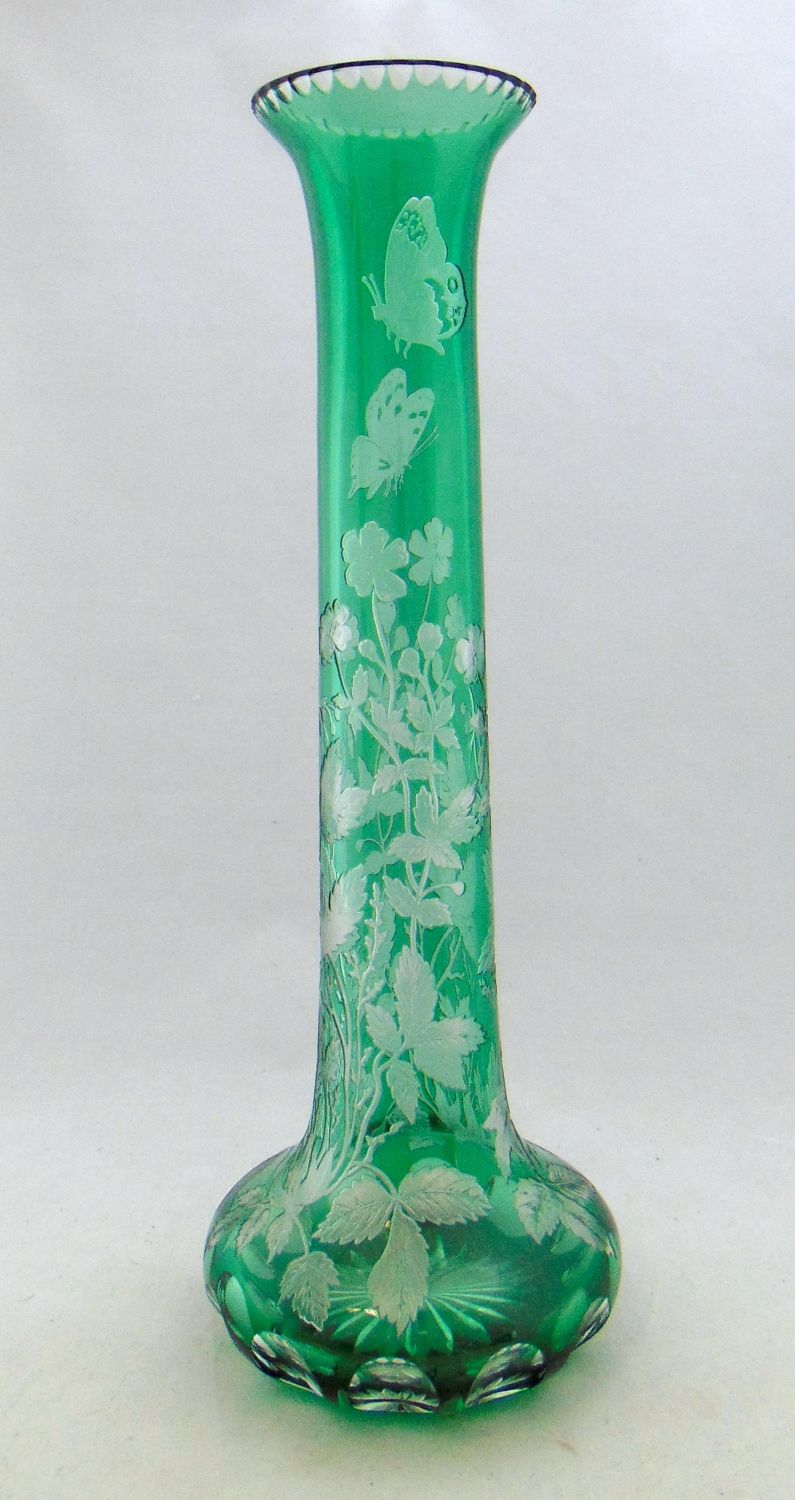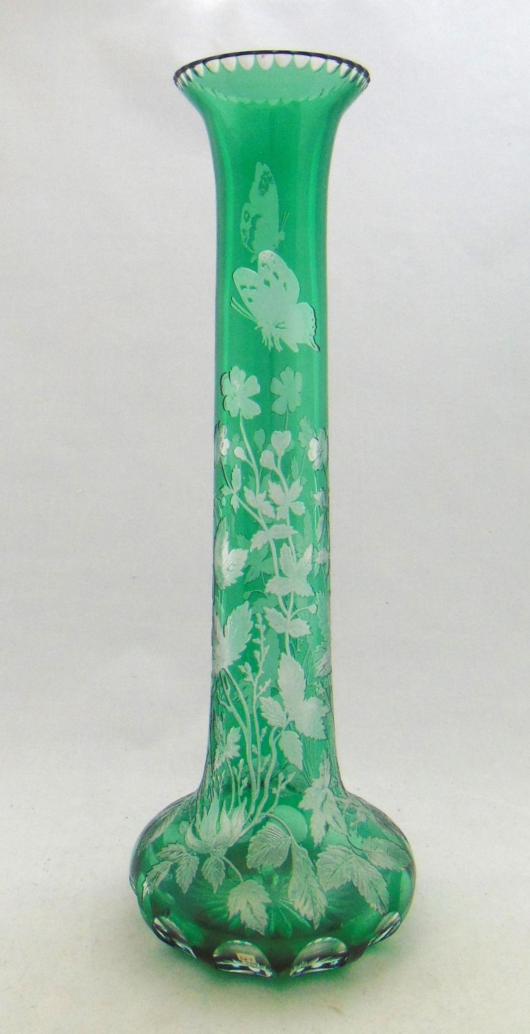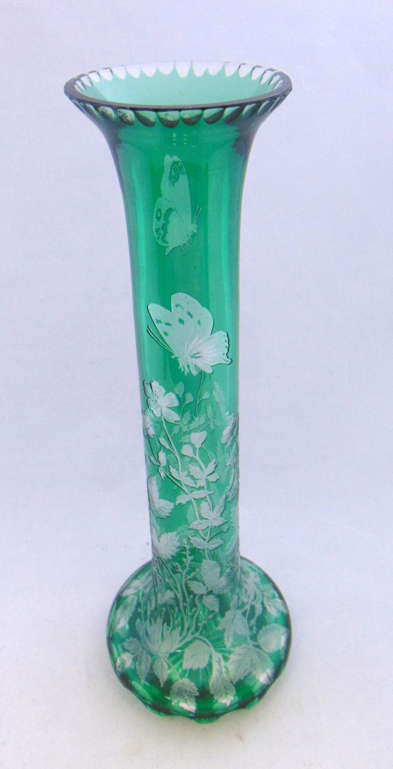 Footed cylindrical form in green cut to clear with an intaglio stemmed flower garden and two butterflies, 16" ht. Condition: good with no defects found.