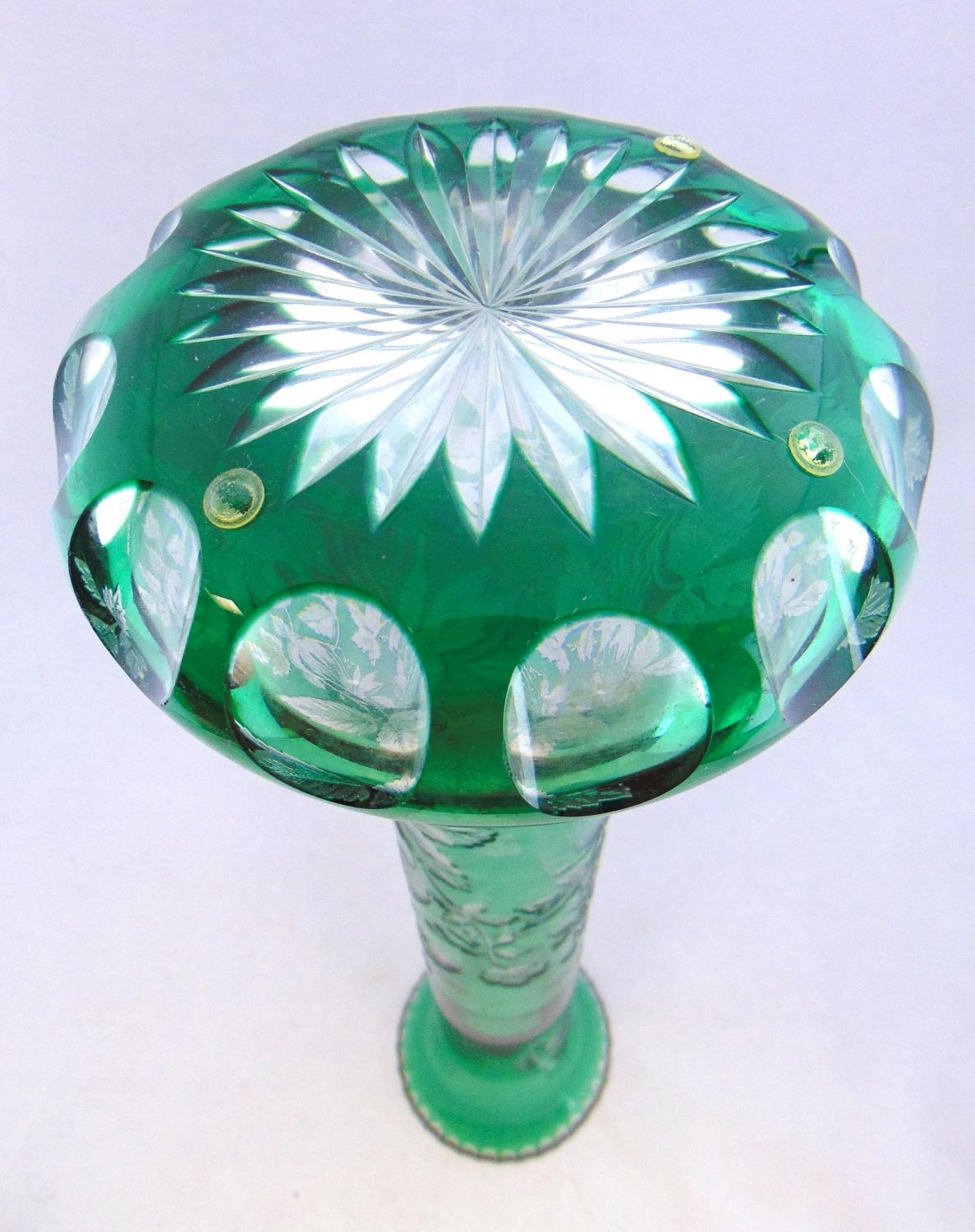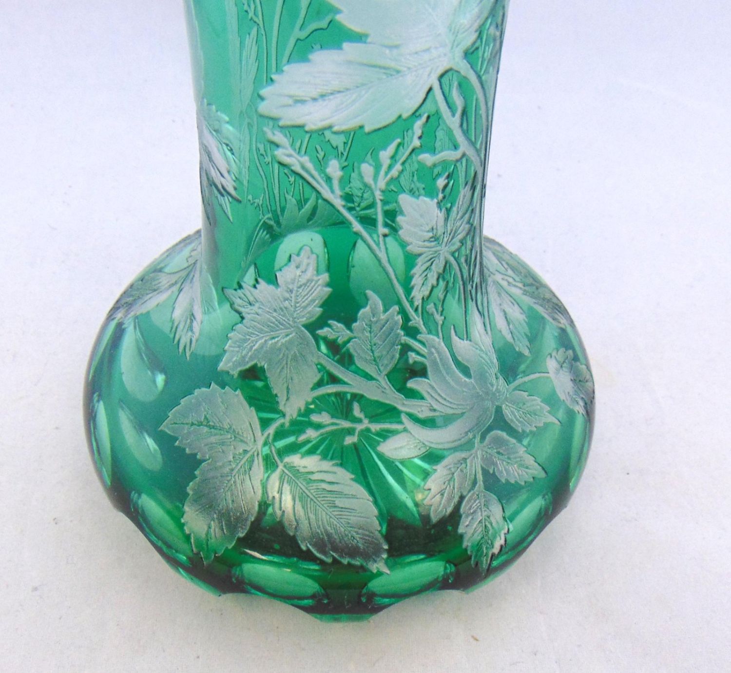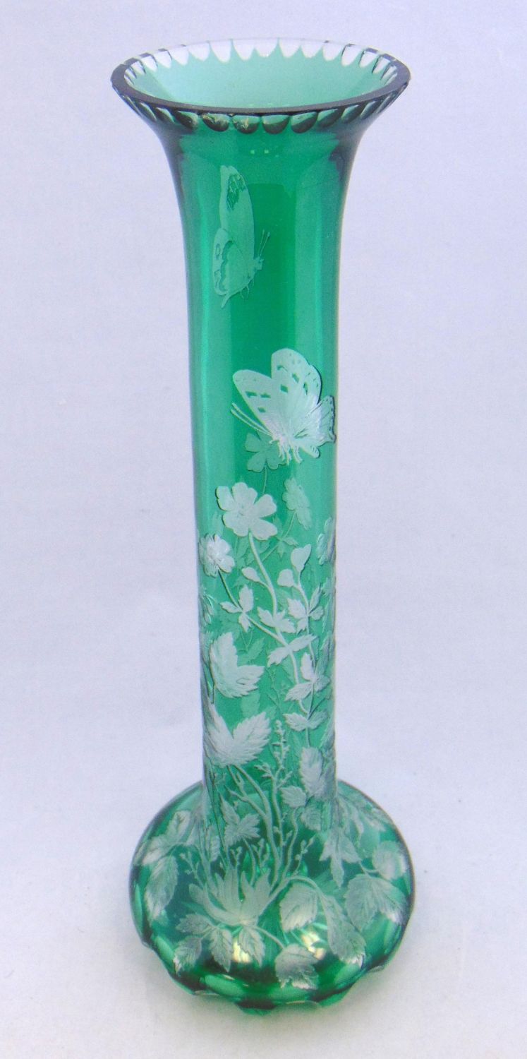 Footed cylindrical form in green cut to clear with an intaglio stemmed flower garden and two butterflies, 16" ht. Condition: good with no defects found.