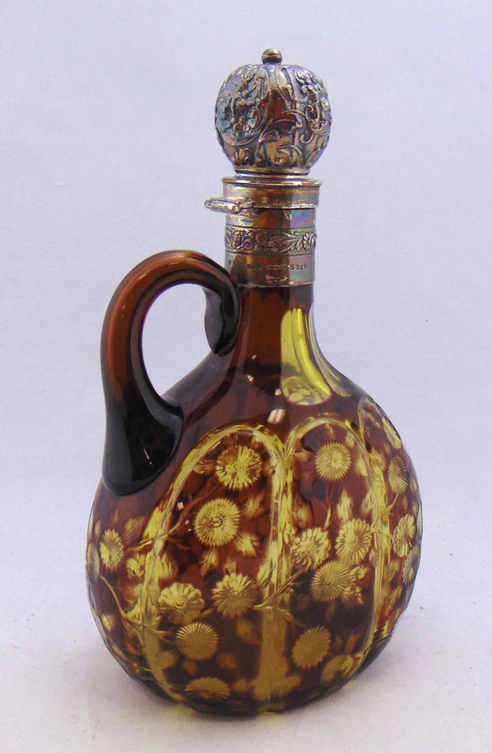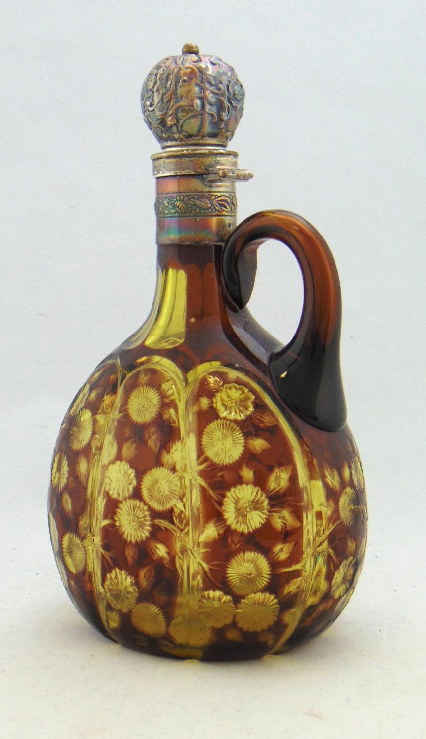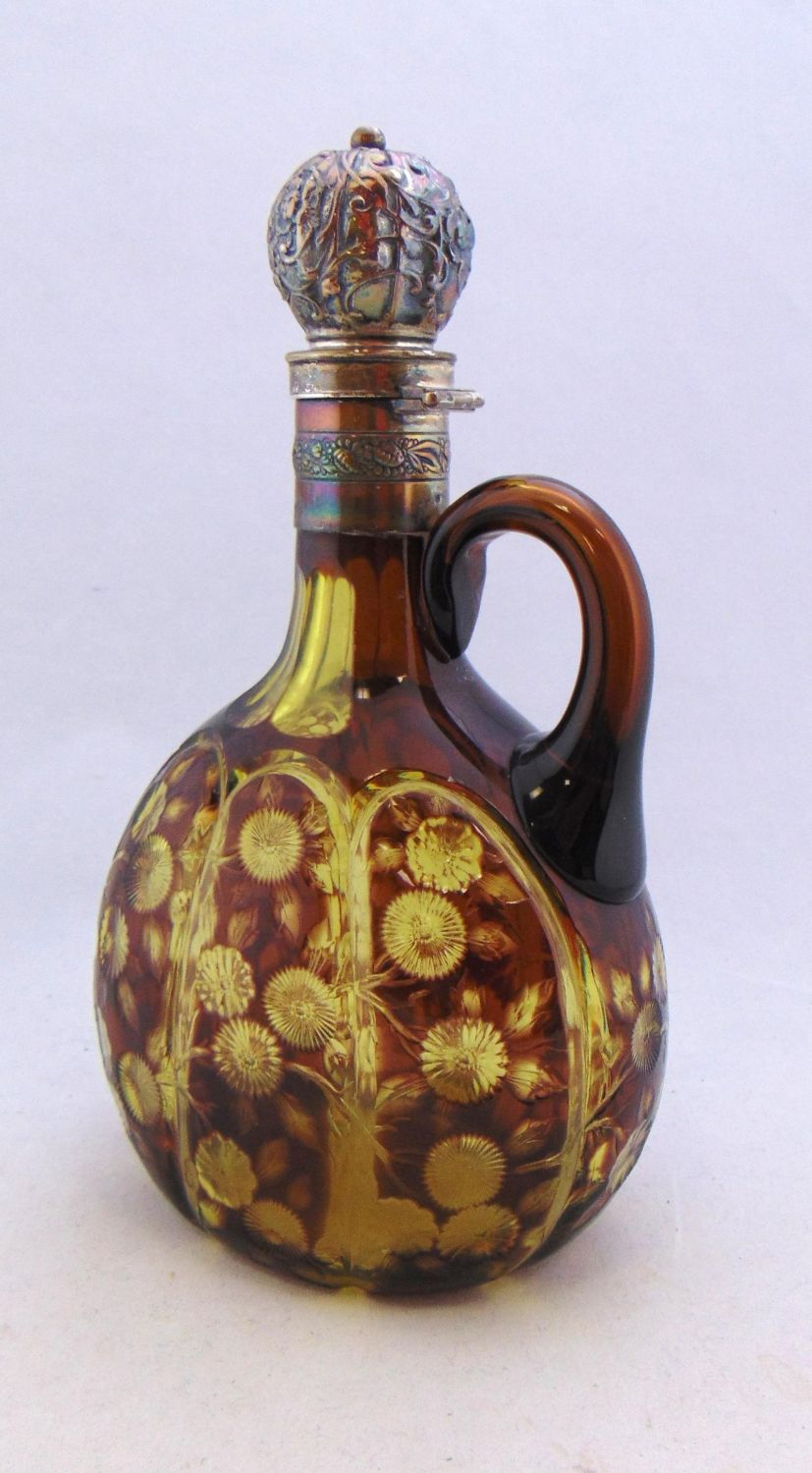 Ovoid form in brown cut back to canary yellow with cathedral windows and branching flowers, twist lock flower embossed sterling lid, 9 1/2" ht. Condition: good with no defects found.