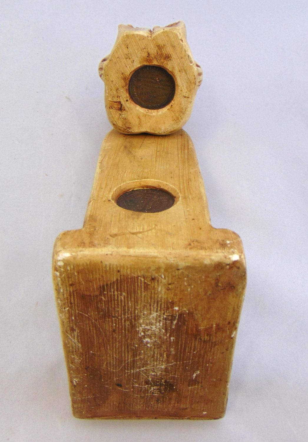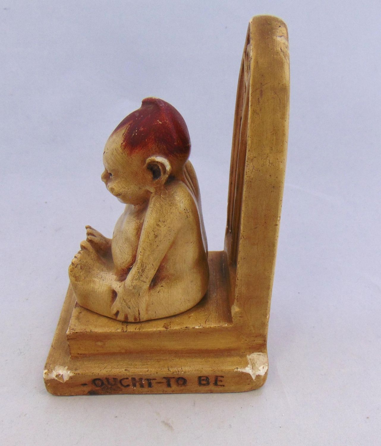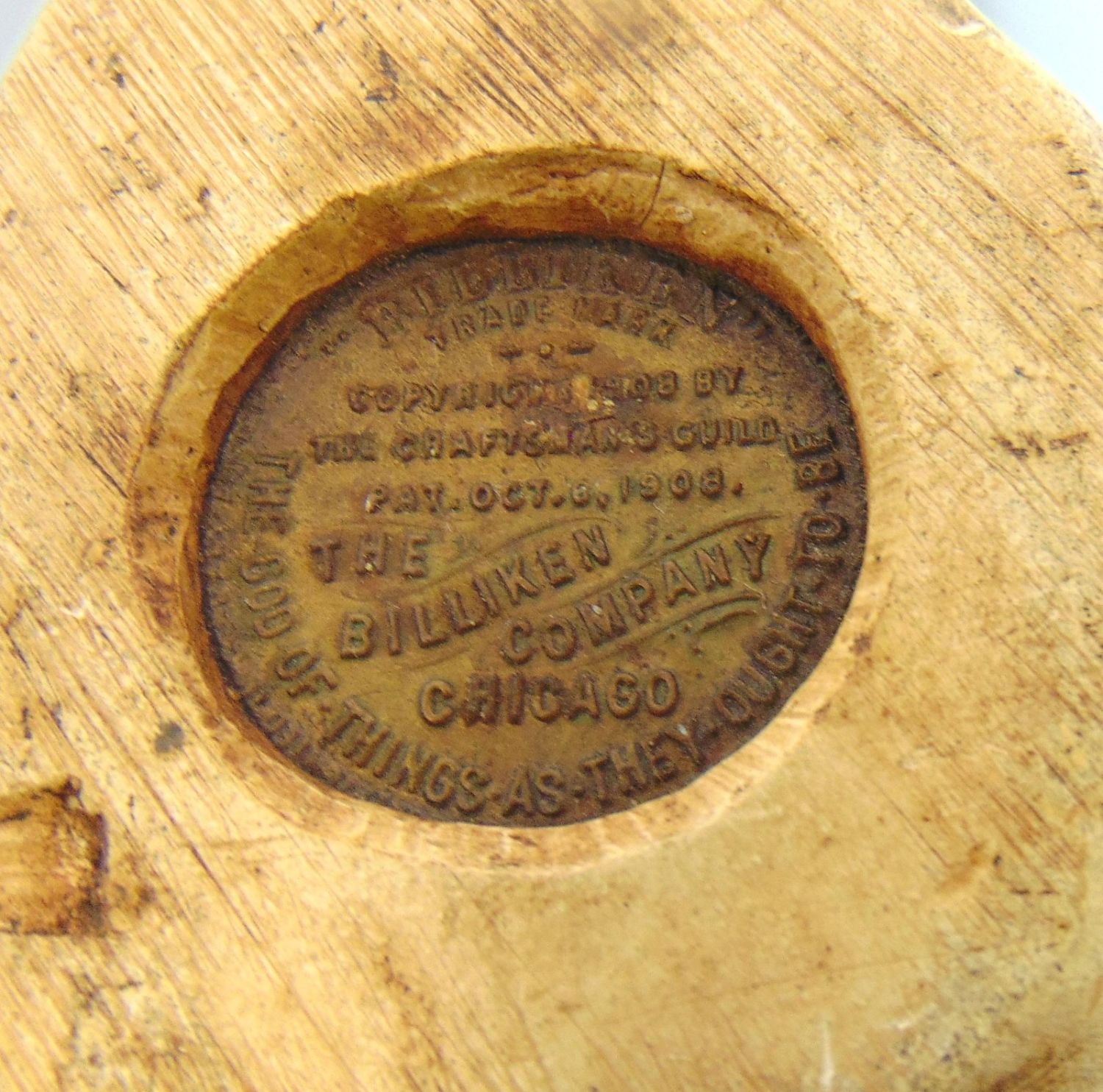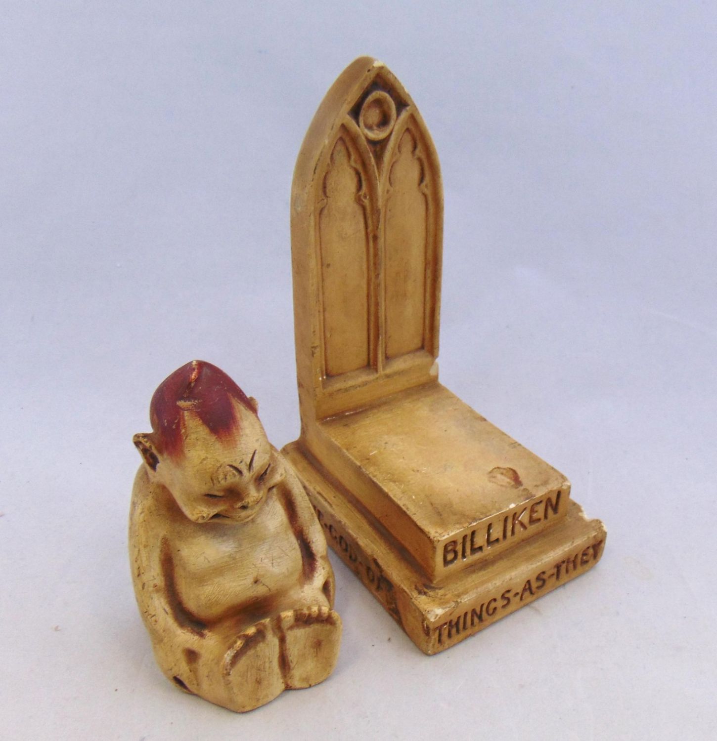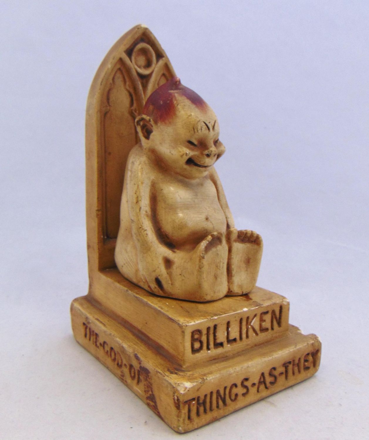 Billiken on the throne with script "The God of Things as they ought to be" with factory coin on reverse, believe to be a resin or chalk, 6 1/2" ht. Condition: some chips on the throne.