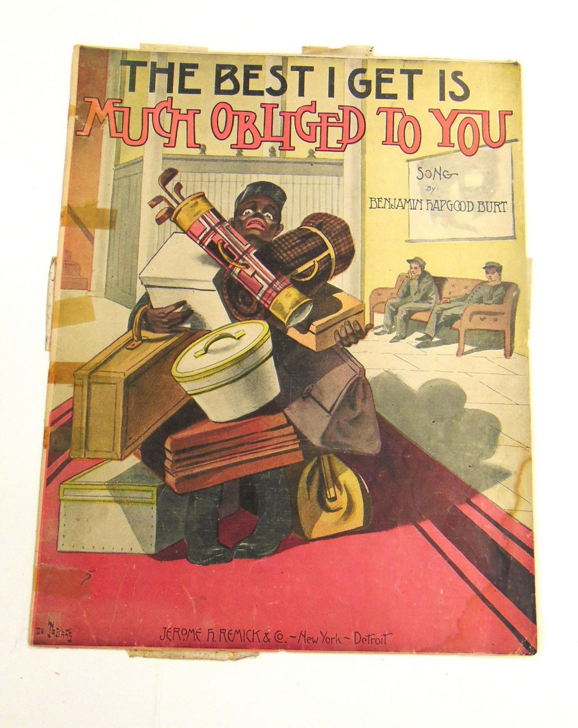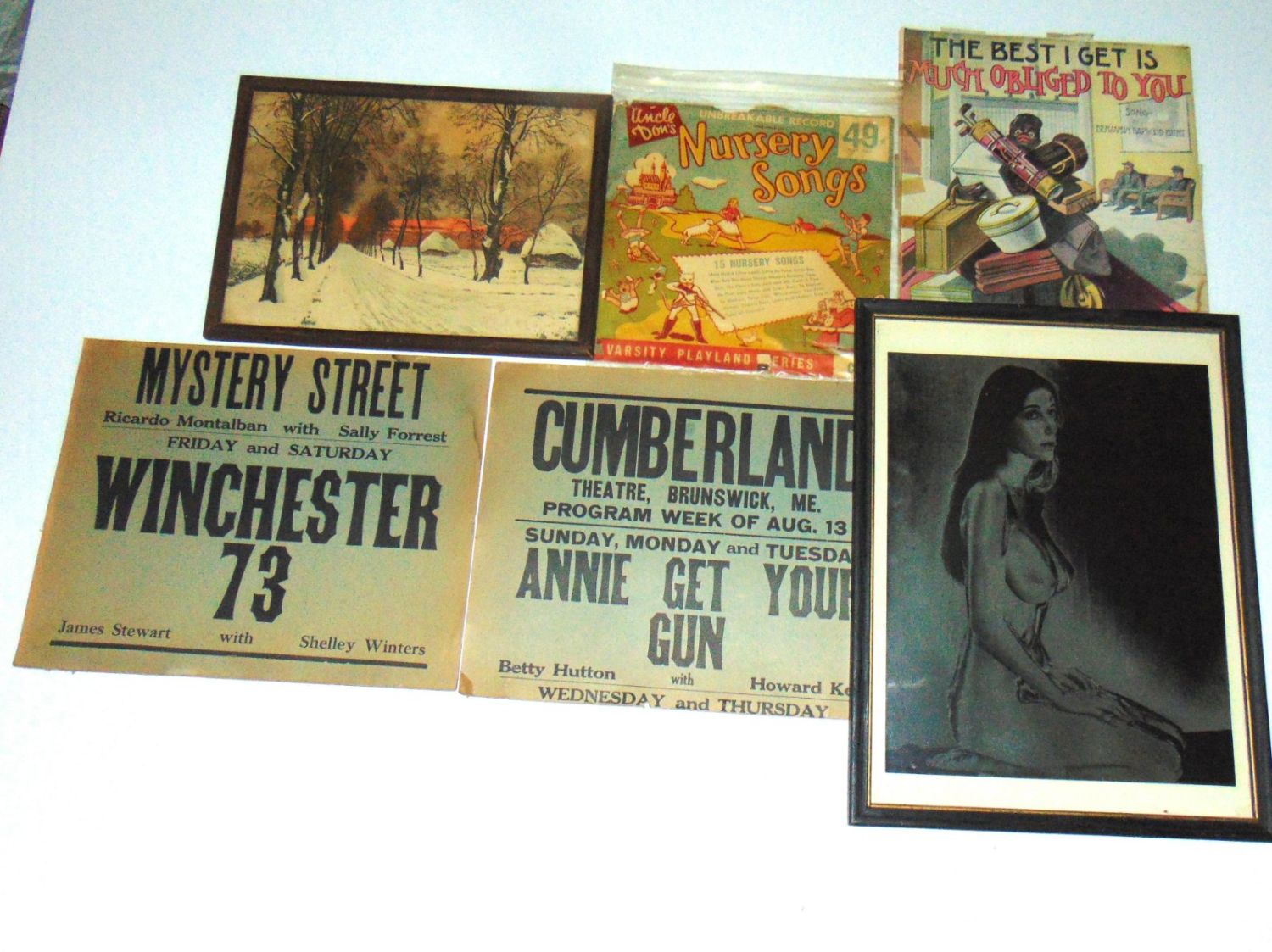 Including a framed Max Reder print from the International Club Print Competition titled "Nude", a framed print of a winter country road, two lobby cards of plays "Annie Get your Gun" and "Winchester 73" with James Stewart and Shelley Winters. an unbreakable record ‘Nursery Songs" and a Black Memorabilia sheet music "The Best I get is Much Obliged to You". Nude print without frame 16" ht by 12" wide. Condition: wear to each.