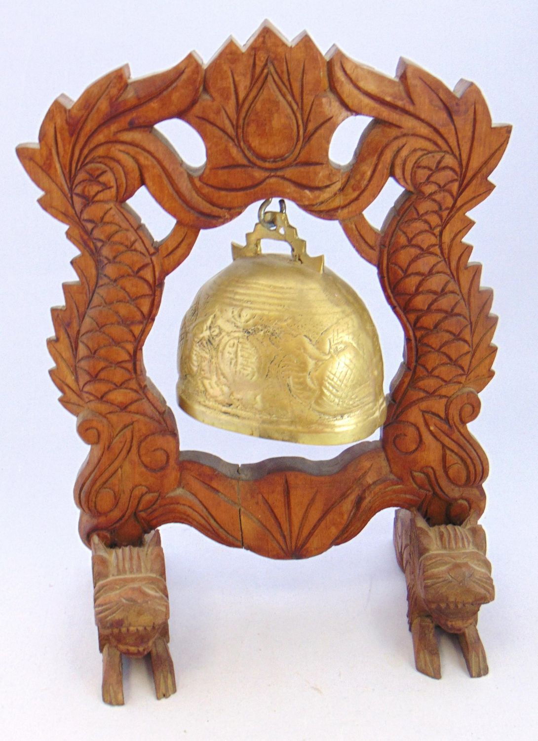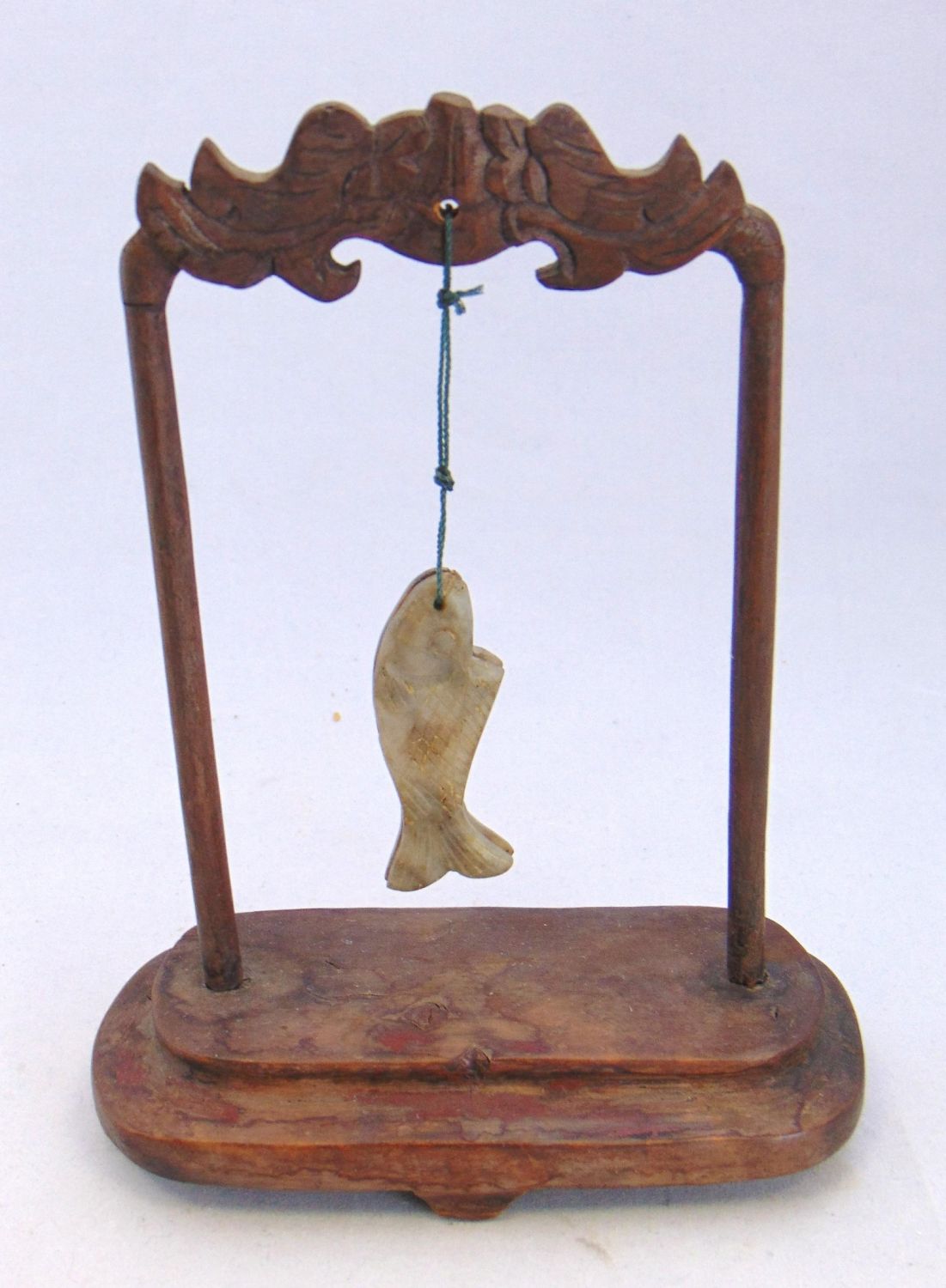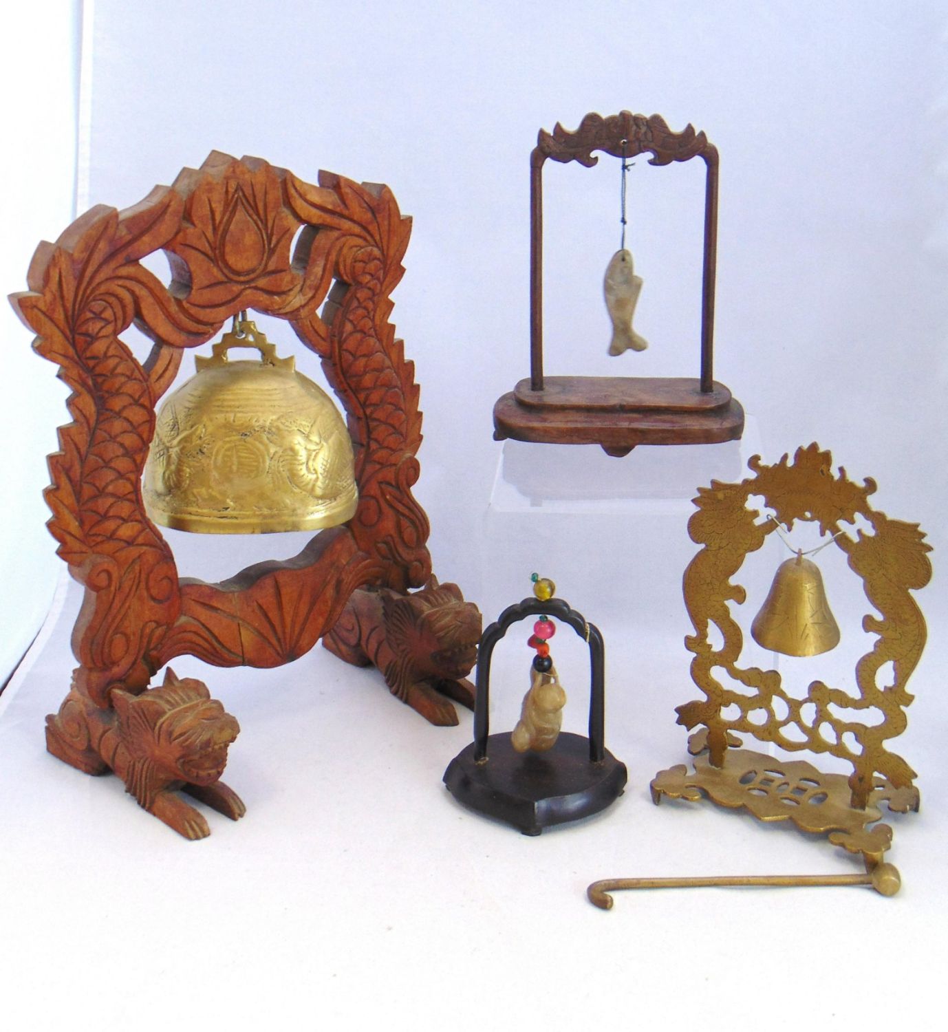 Including a large brass gong on a carved dolphin wooded stand, a brass gong with carved dragons, a hanging carved fish, and a hanging Jadeite sculpture, tallest 13" ht. Condition: minor issues, repair to the frame of the Jadeite, paperclip hanger for the dragon gong.