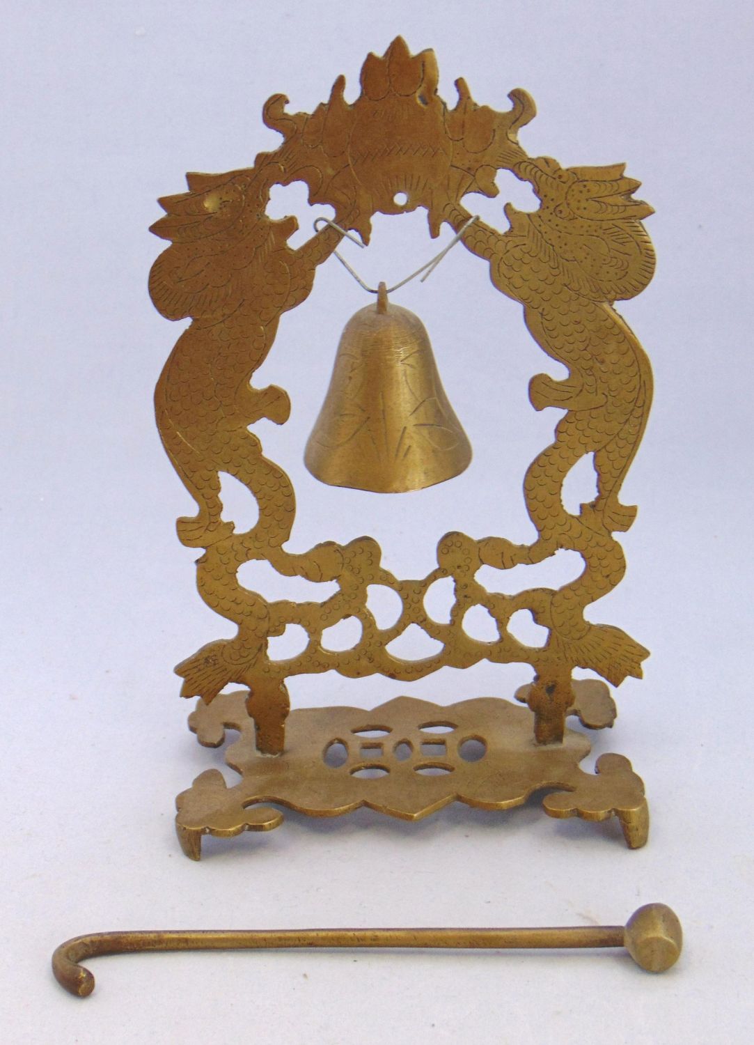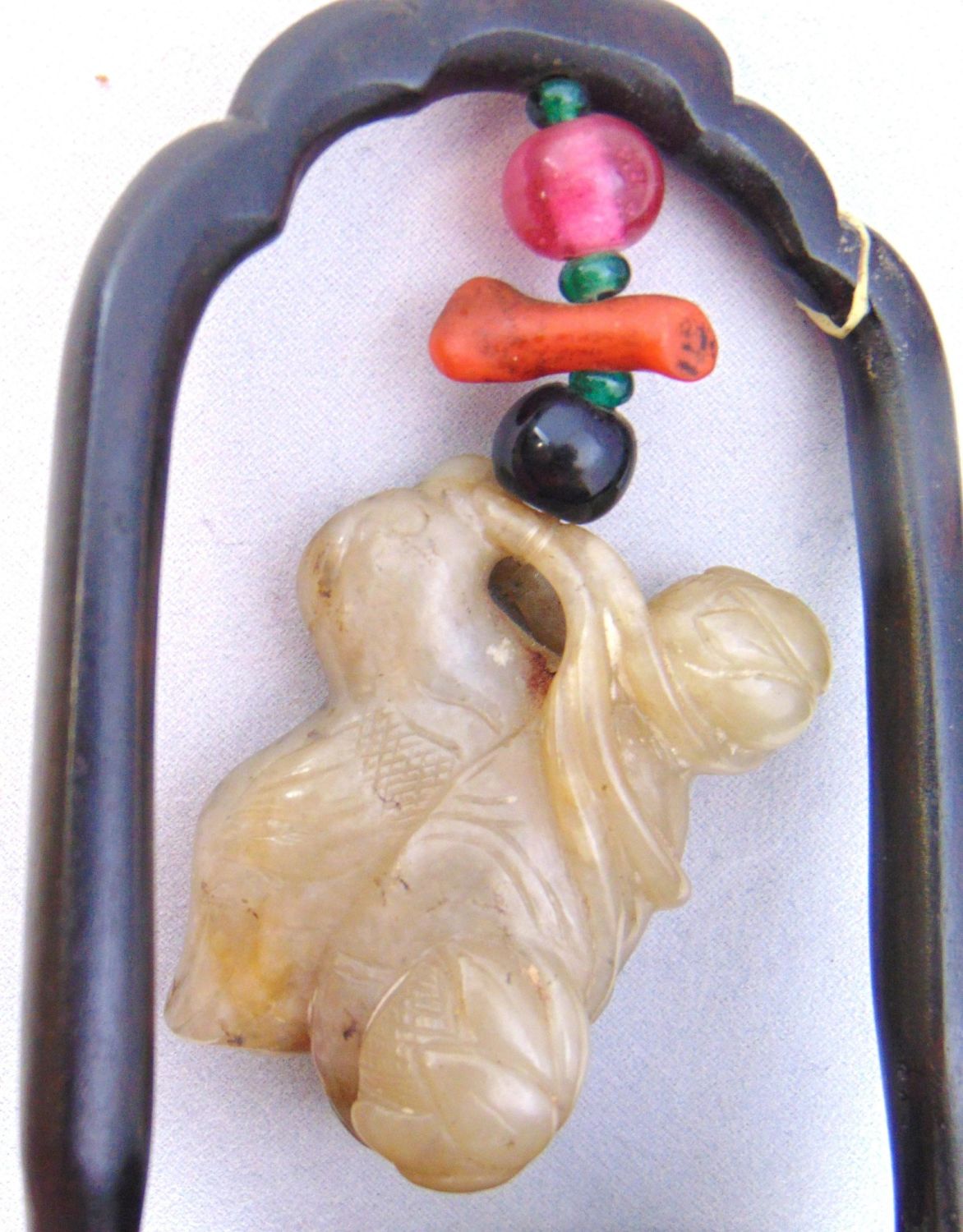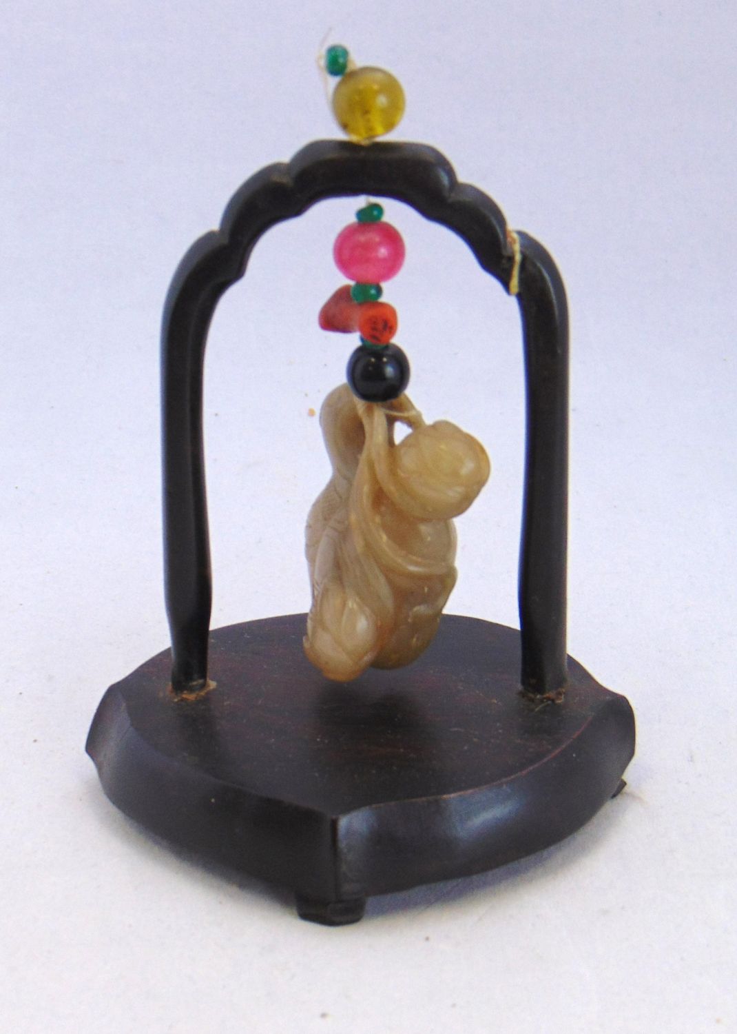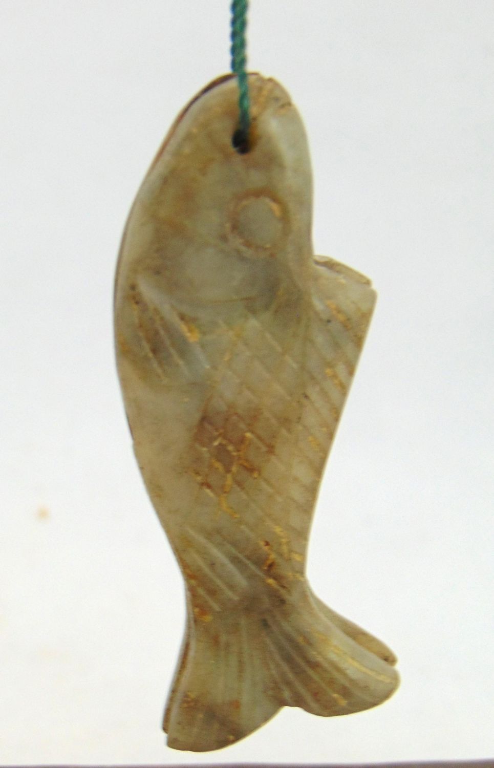 Including a large brass gong on a carved dolphin wooded stand, a brass gong with carved dragons, a hanging carved fish, and a hanging Jadeite sculpture, tallest 13" ht. Condition: minor issues, repair to the frame of the Jadeite, paperclip hanger for the dragon gong.