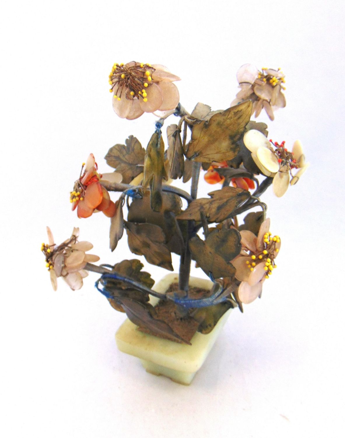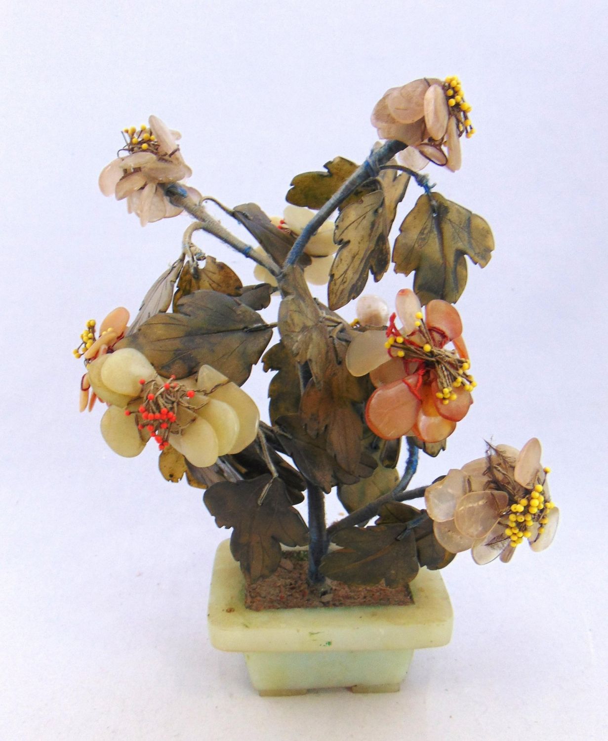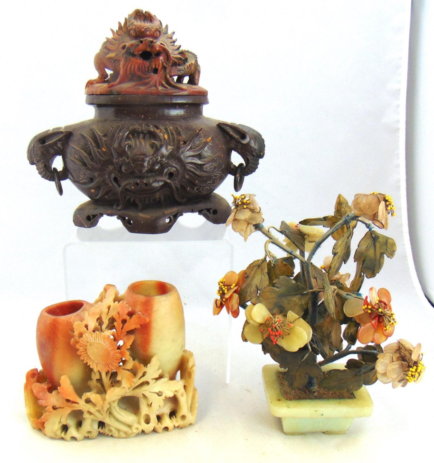 Including a double urn bud vase with carved flowers, a covered jar with elephant handles, and a stone tree, largest 8 1/2" ht. Condition: good with minor wear.
