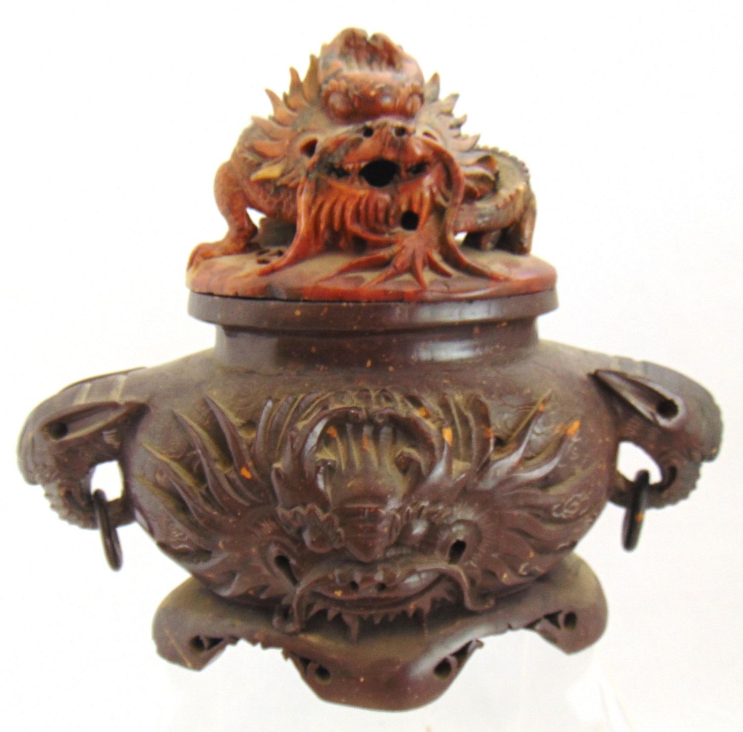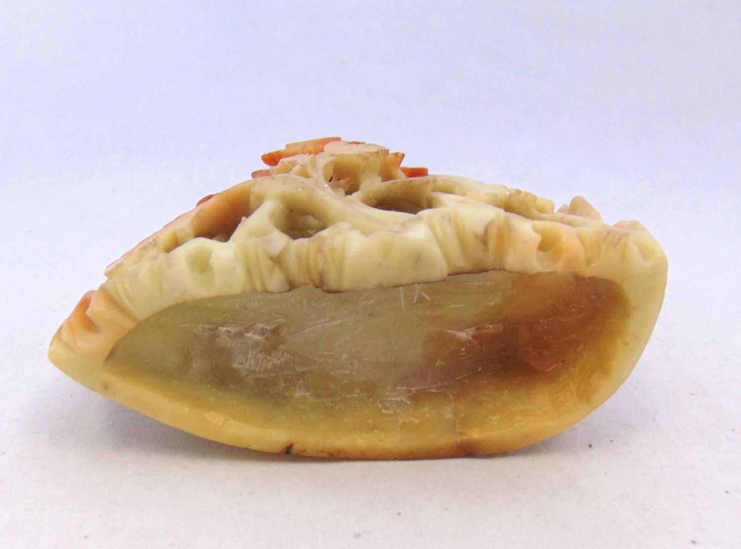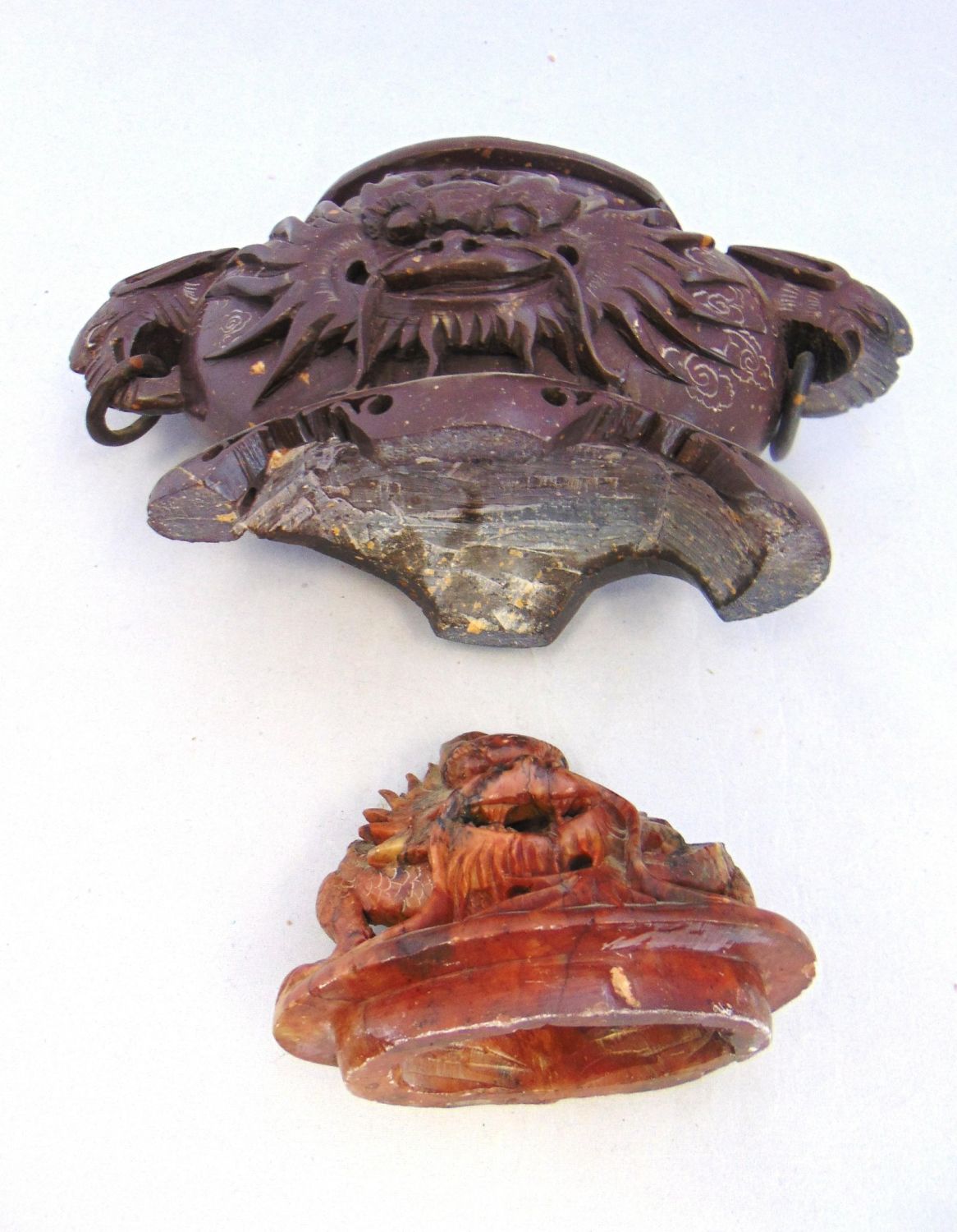 Including a double urn bud vase with carved flowers, a covered jar with elephant handles, and a stone tree, largest 8 1/2" ht. Condition: good with minor wear.