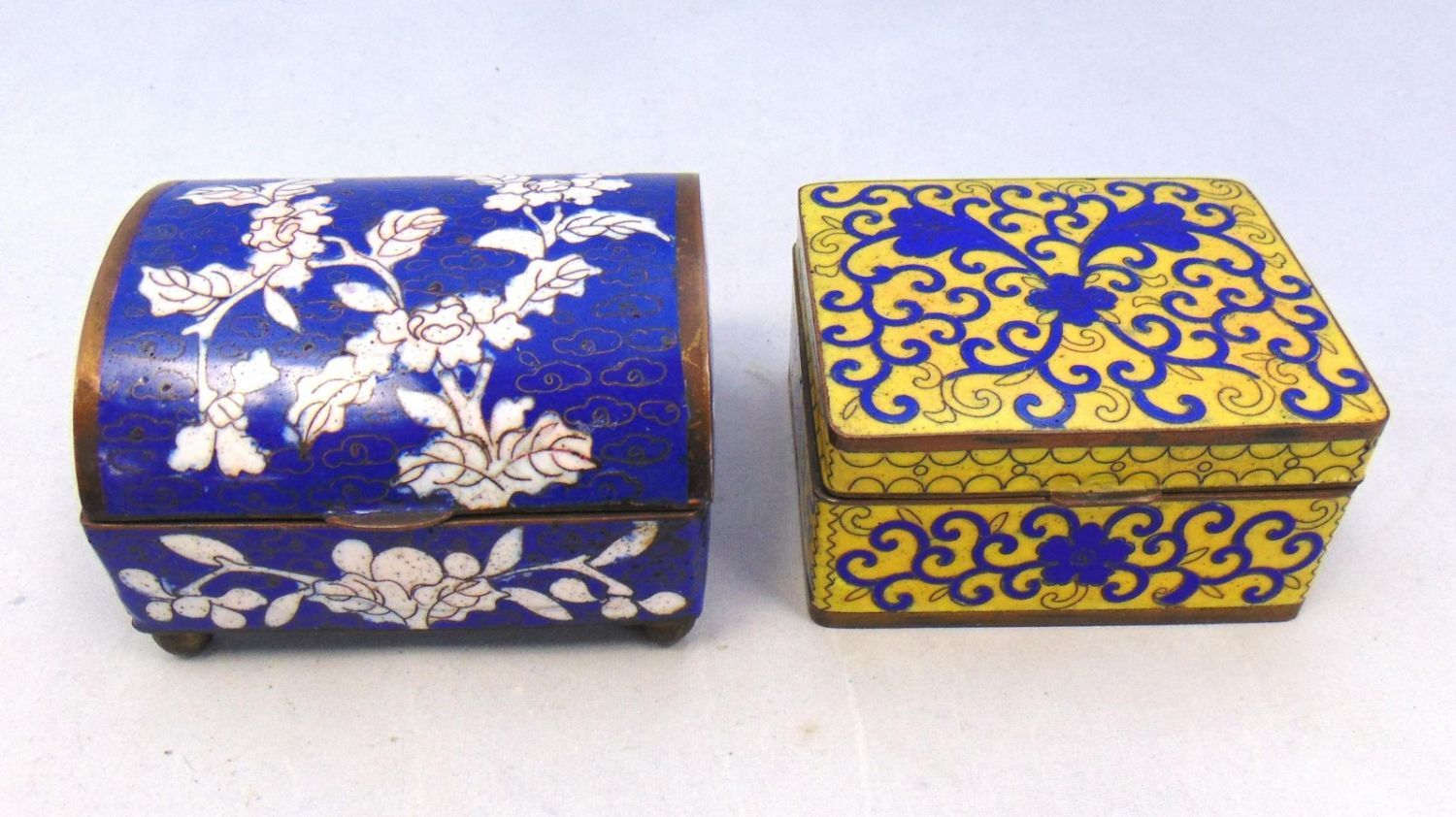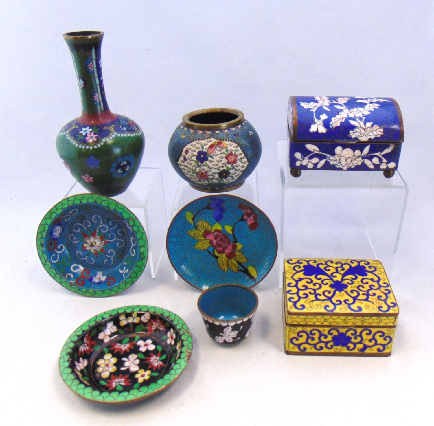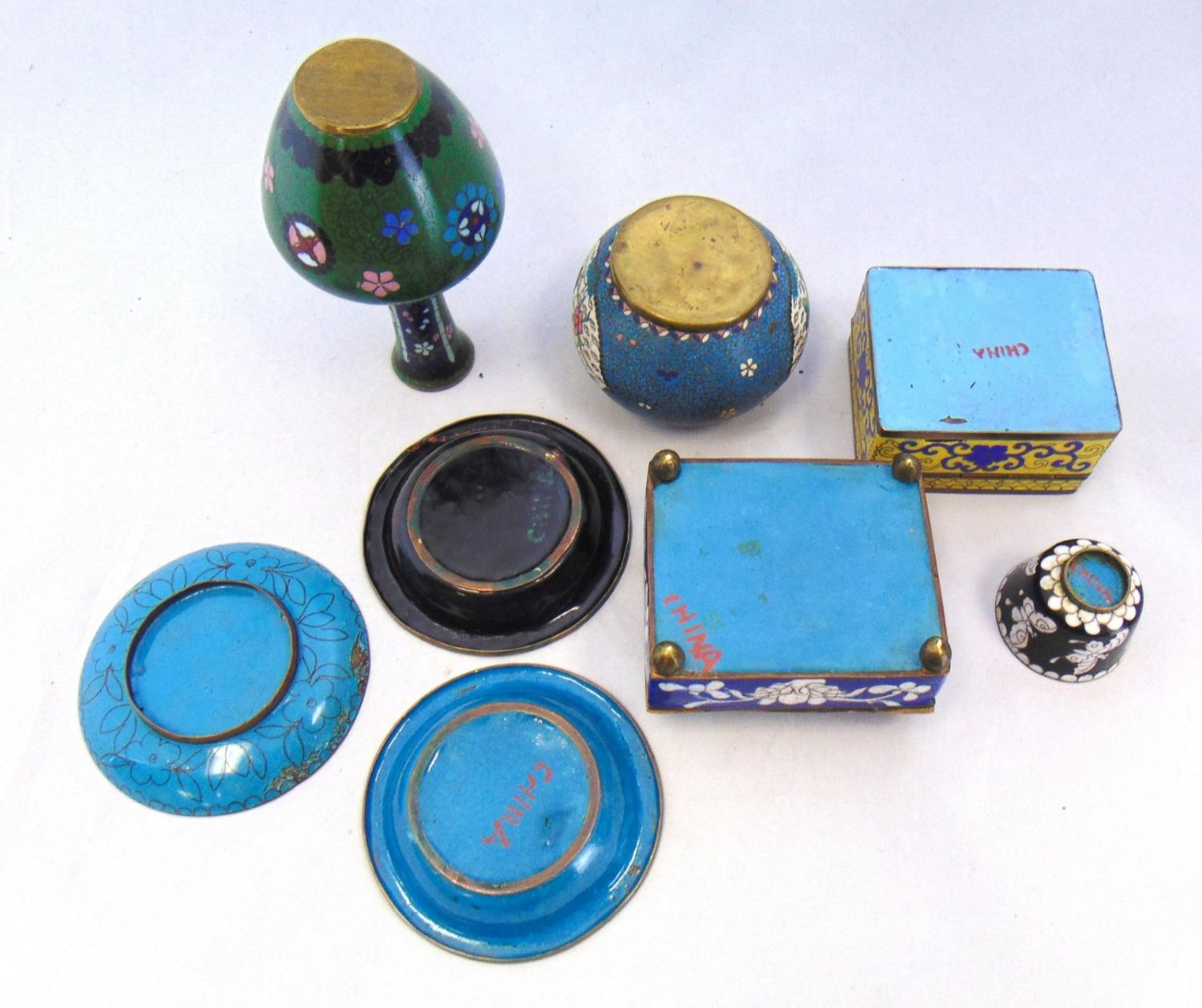 Including two marked China flip lid boxes two vases three dishes and a cordial, tallest 5 1/2" ht. Condition: good, with minor wear.