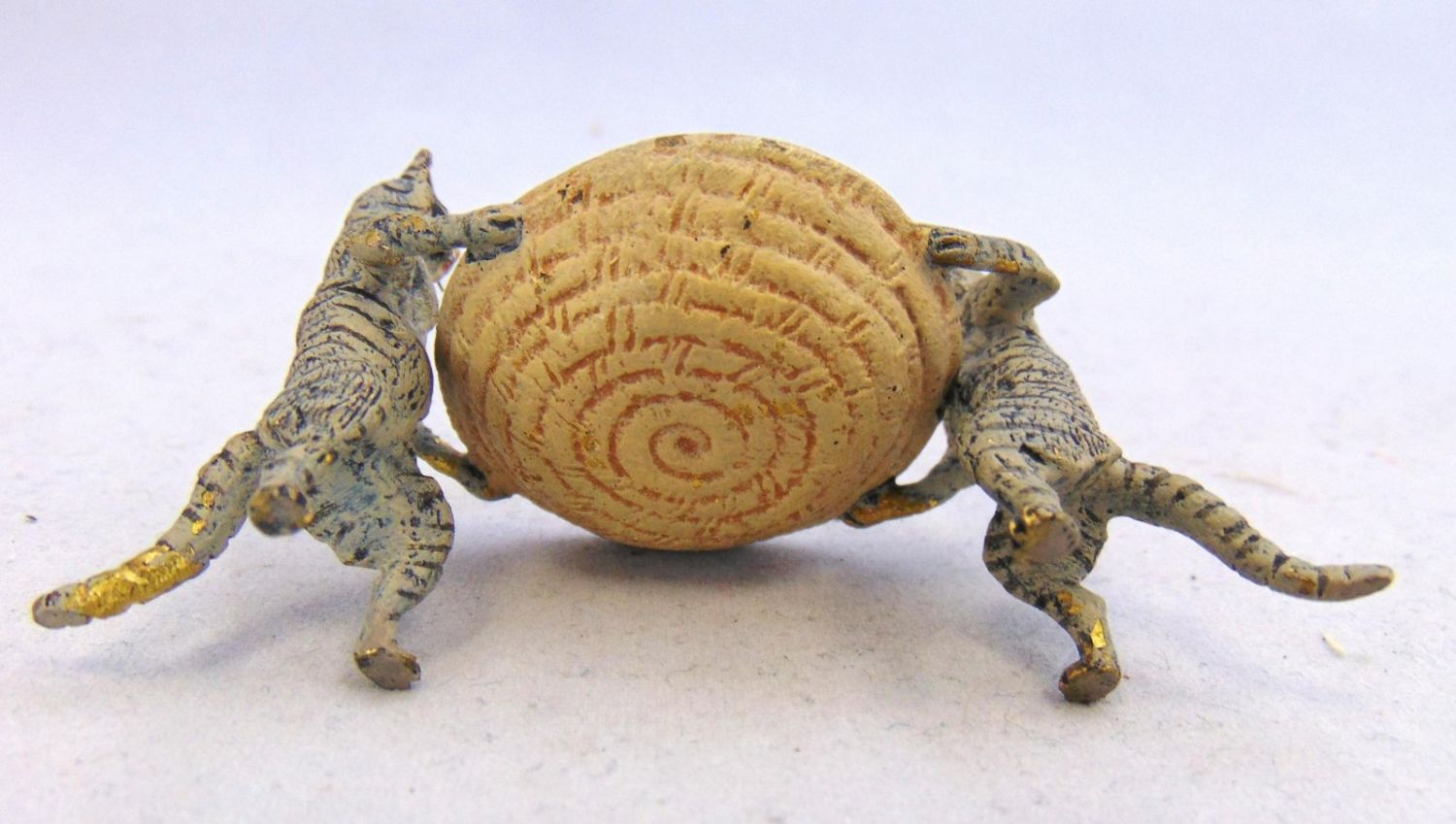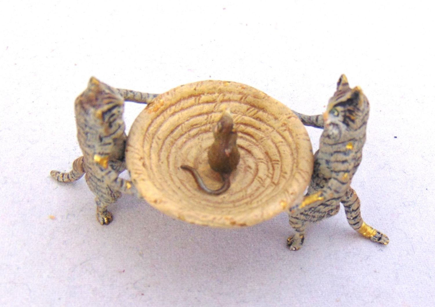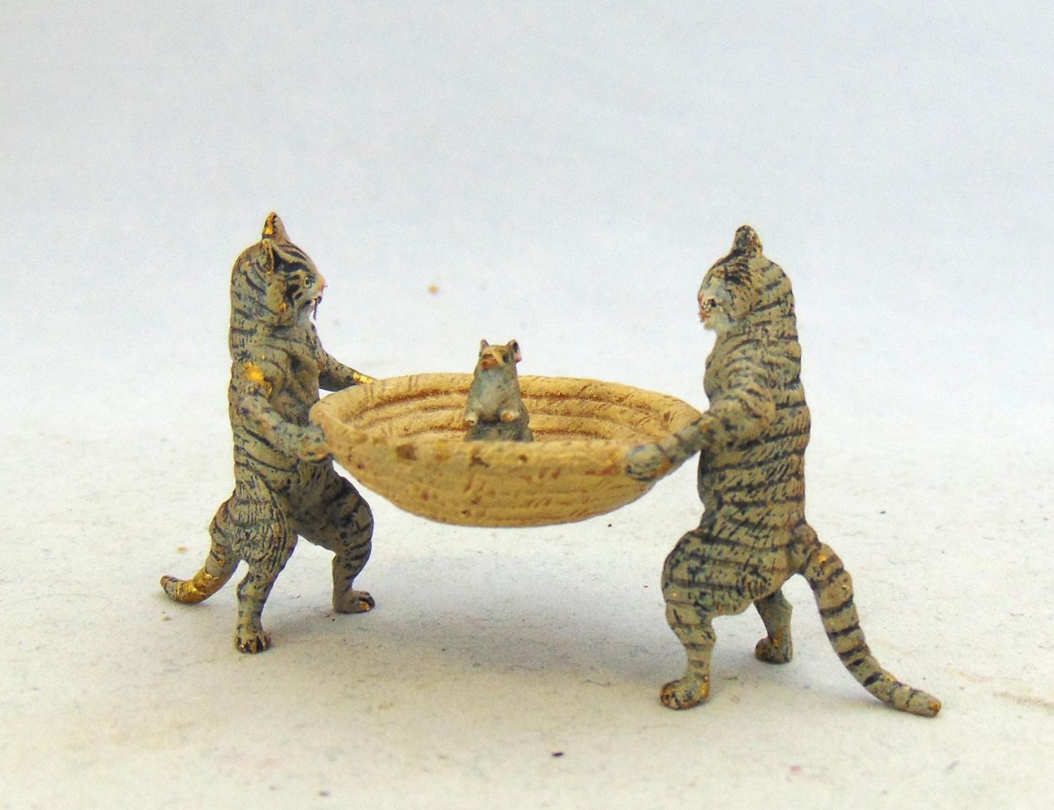 Cold painted bronze of two cats and a basket with a mouse in tow, attributed to Bergman, 3" wide. By 1 1/2" ht. Condition: good with no defects found.