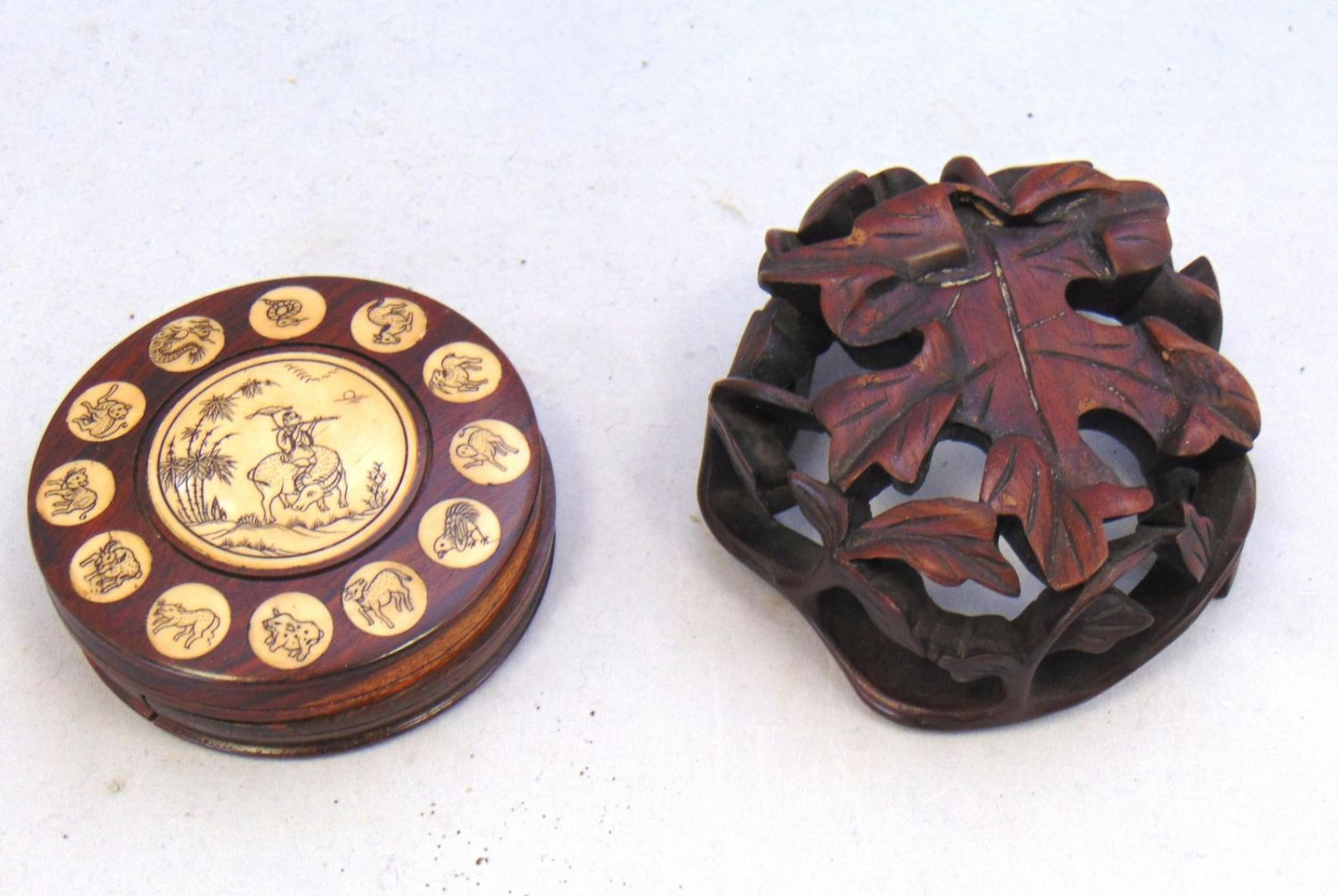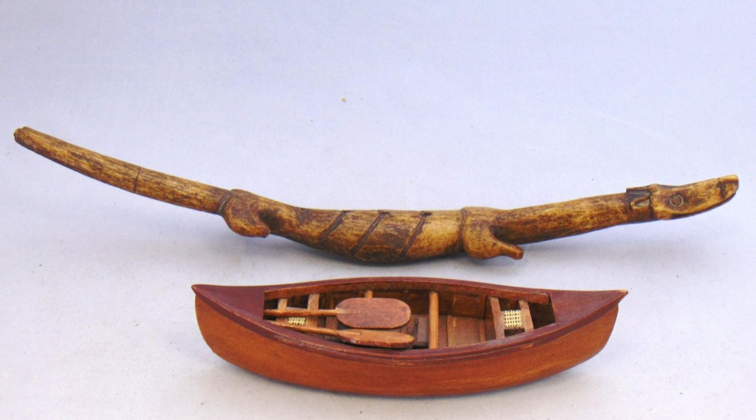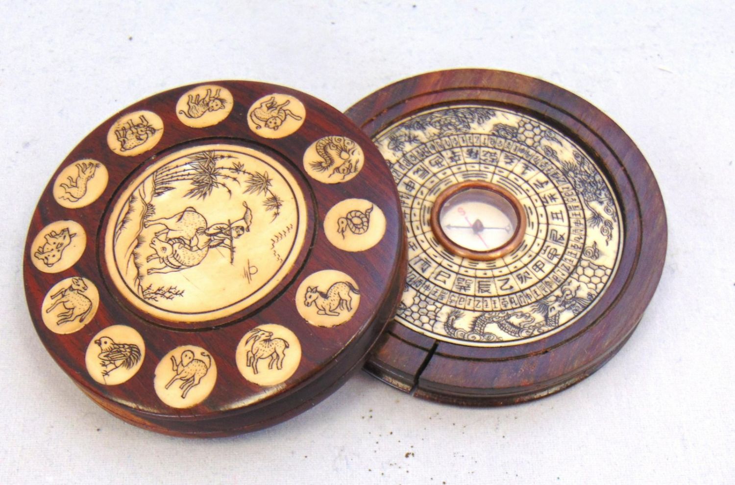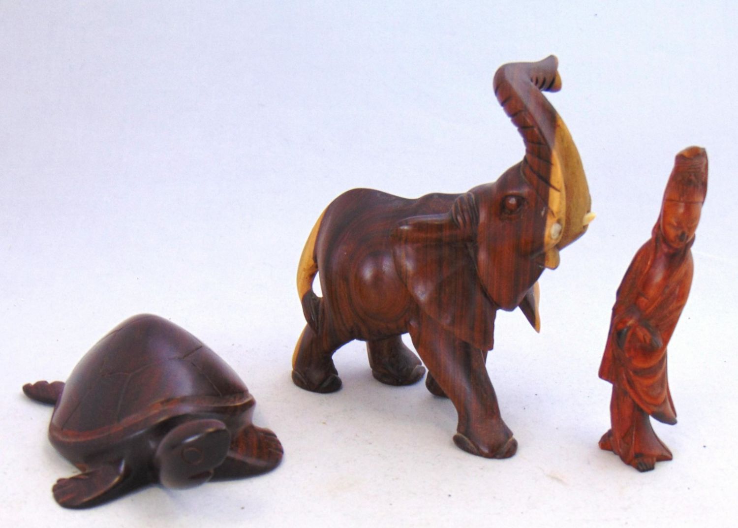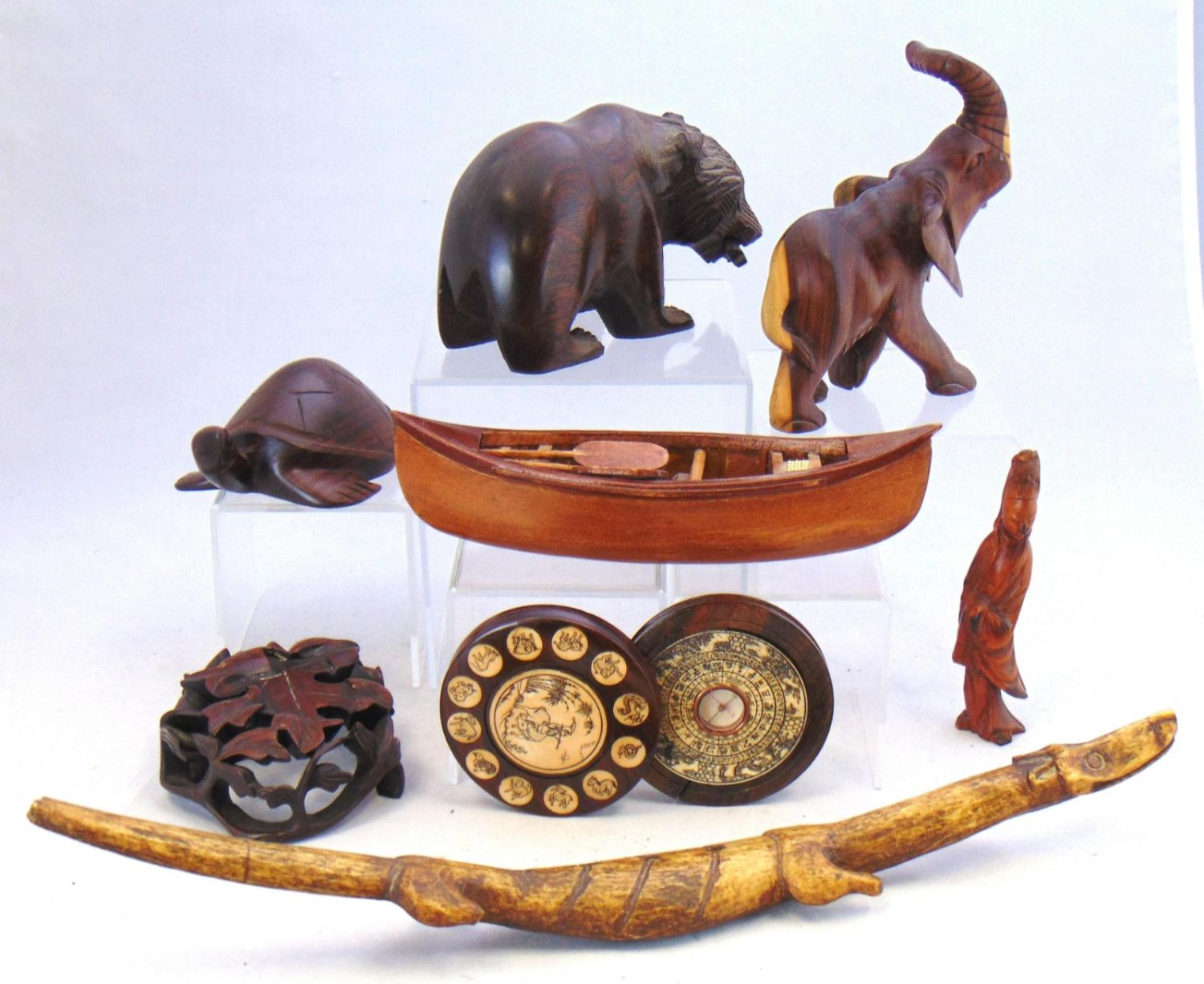 Including a bear, elephant, and turtle. Together with a Quan Yin figurine a slide lid compass with zodiac, and more. Largest is a primitive lizard 14 1/2" long. Condition: elephant tusks missing.