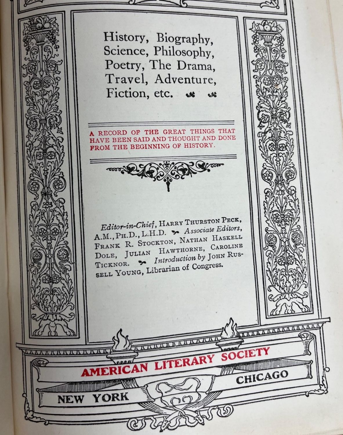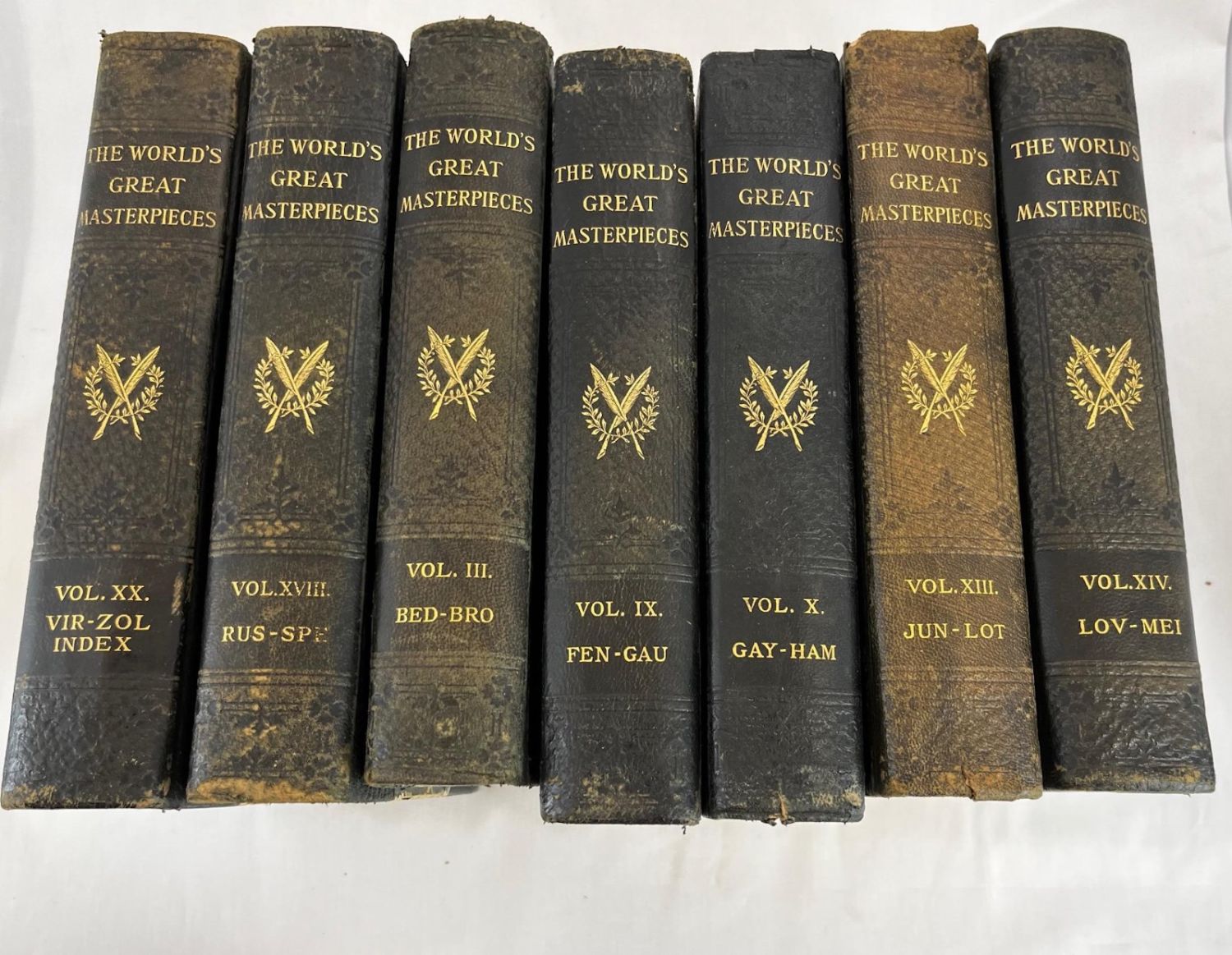 Group of seven books Volume III, IX, X, XIII, XIV, XVIII, XX of The World’s Great Masterpiece cloth bound books, American Literary Society, copyright 1901. CONDITION: Commensurate with age, wear to covers.