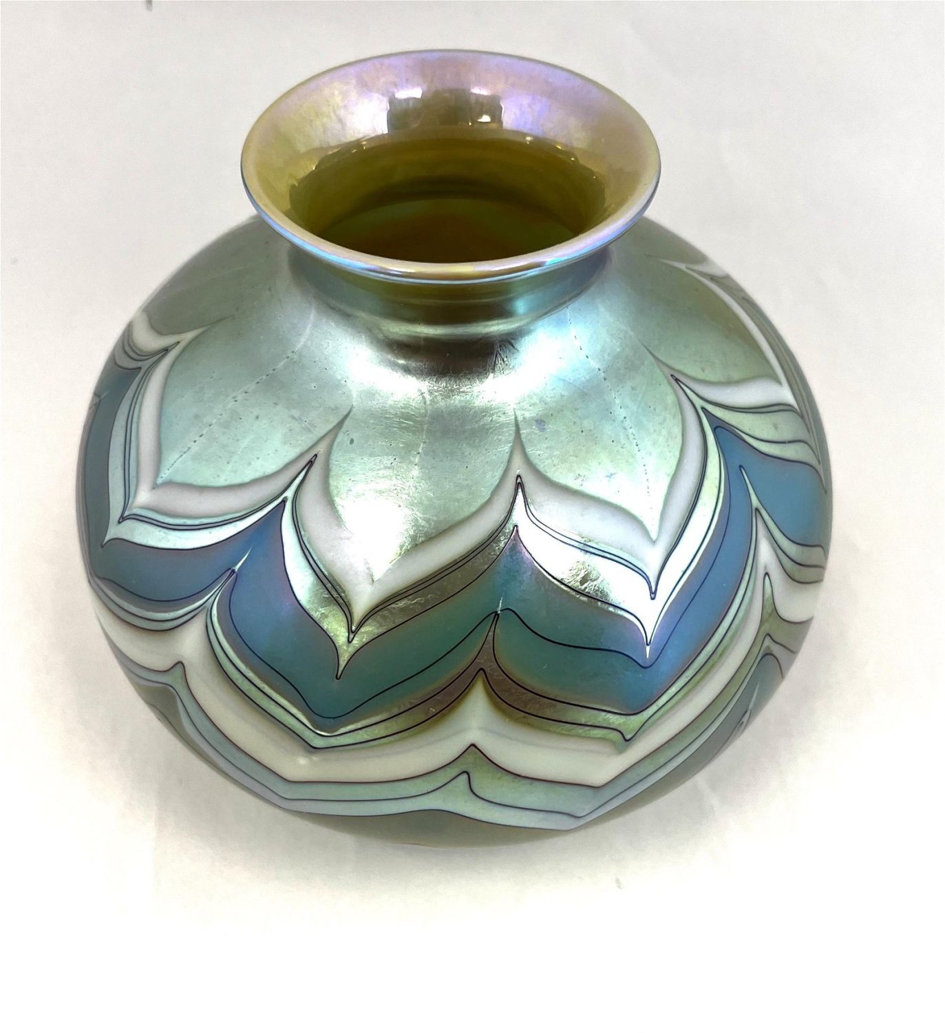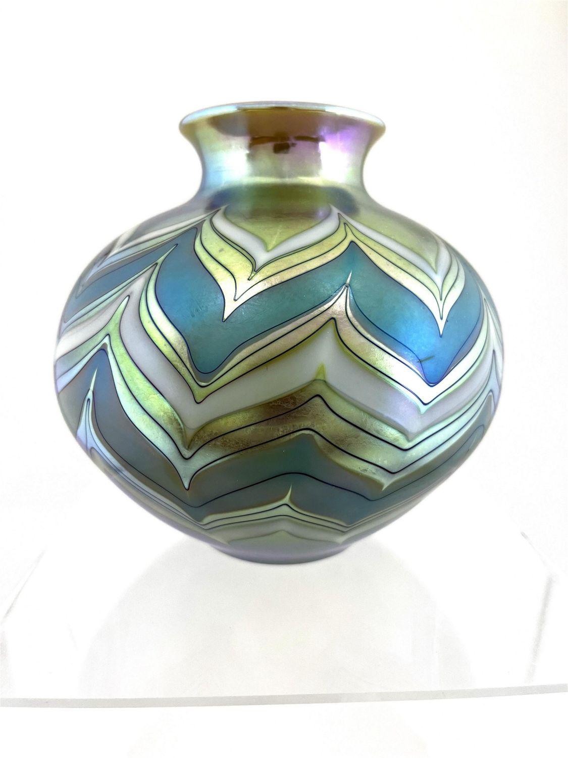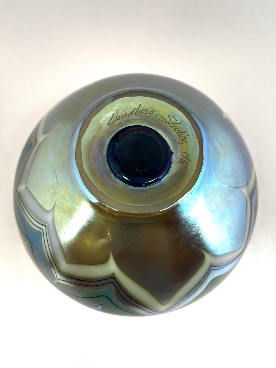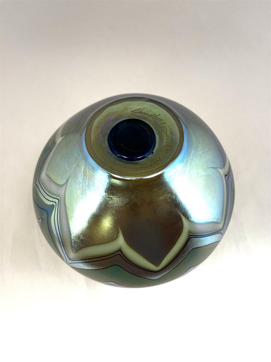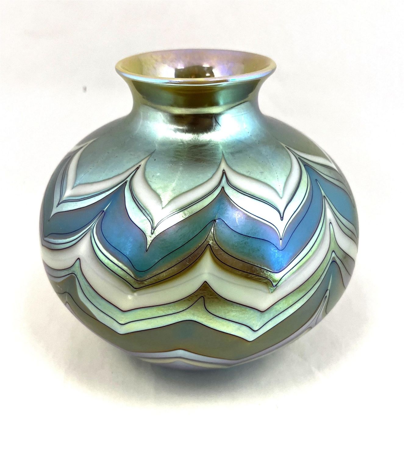 Lundberg ovoid iridescent green glass vase decorated with intarsia green and white bands, signed Lundberg Studios 1981, 6 1/2" ht. CONDITION: Good with no defects found
