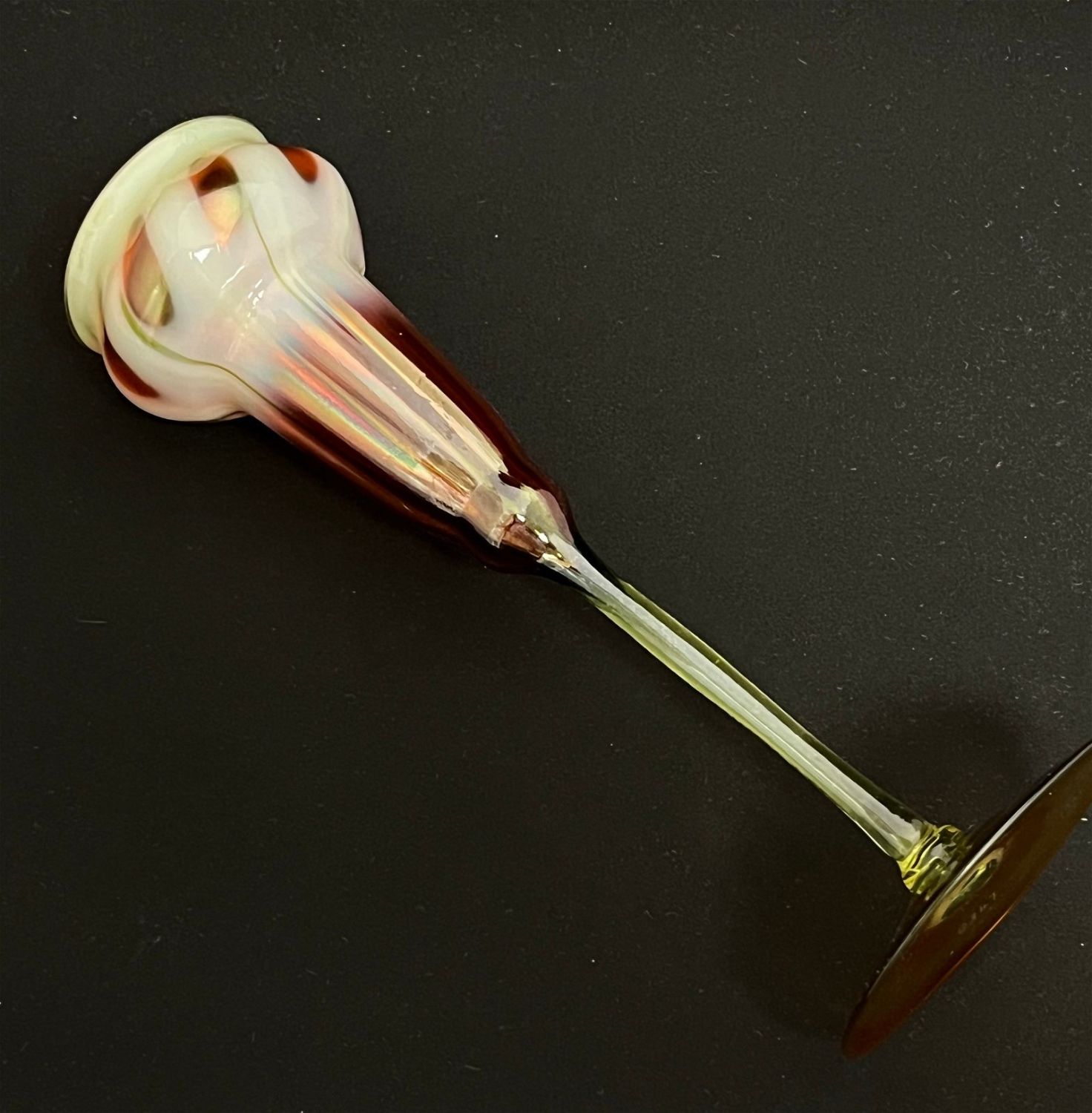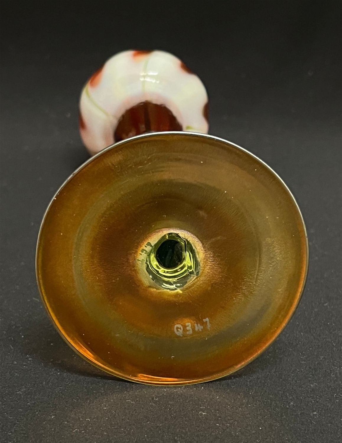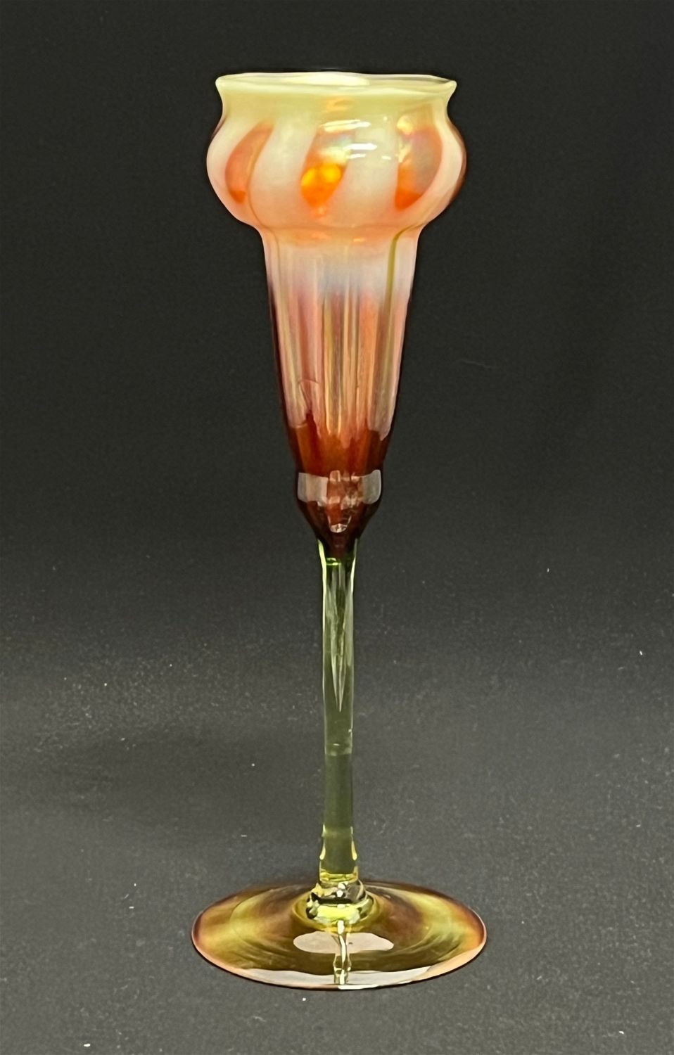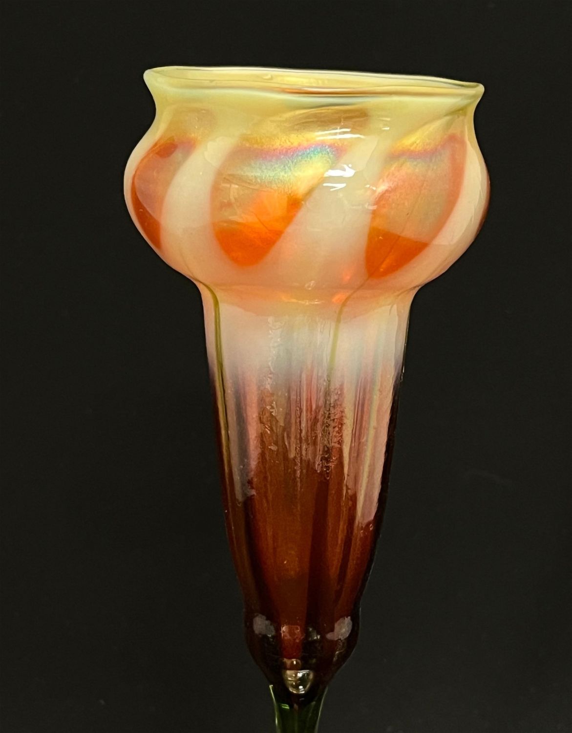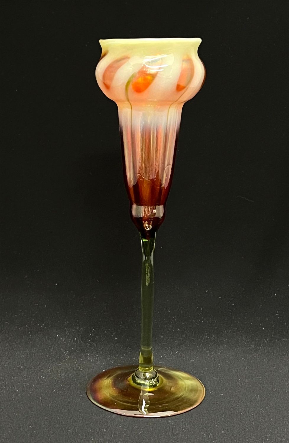 Rare Tiffany flower form with an amber iridescent foot graduating from a green translucent stem to a dark cinamon top with opalescent window, signed LCT Q347, 9 3/4" ht. CONDITION: no chips, cracks, repairs or material defects found. Jaremos attempts to call any material flaw that affects the price, but minor scratches and color variances are inherent to glass and antiques.