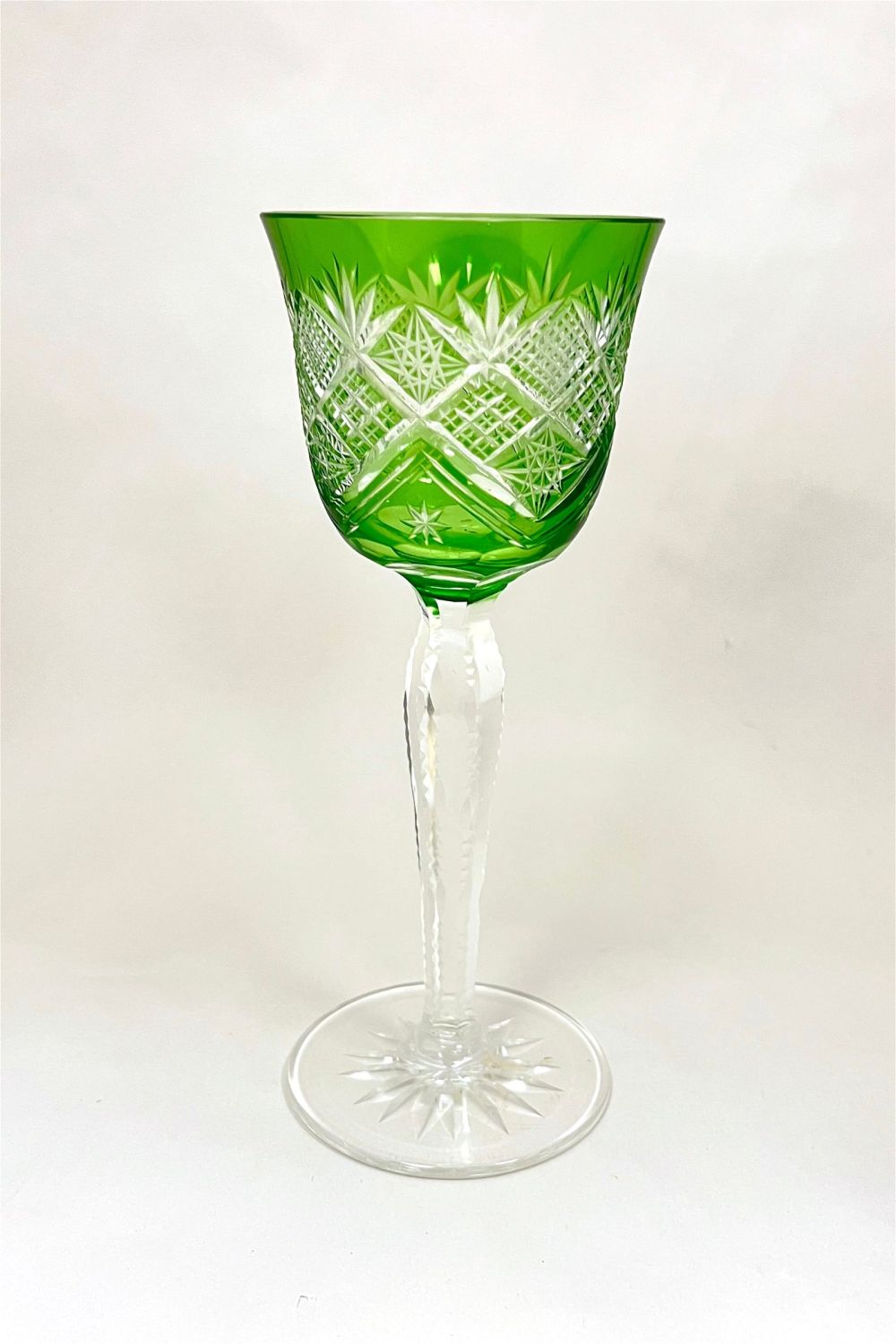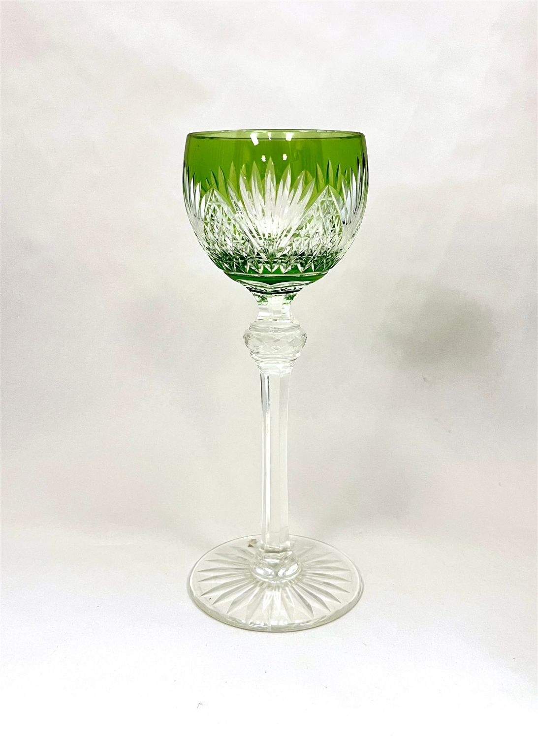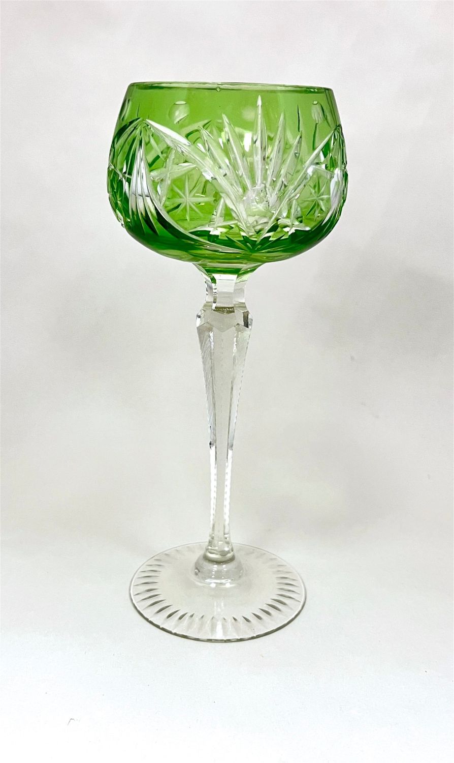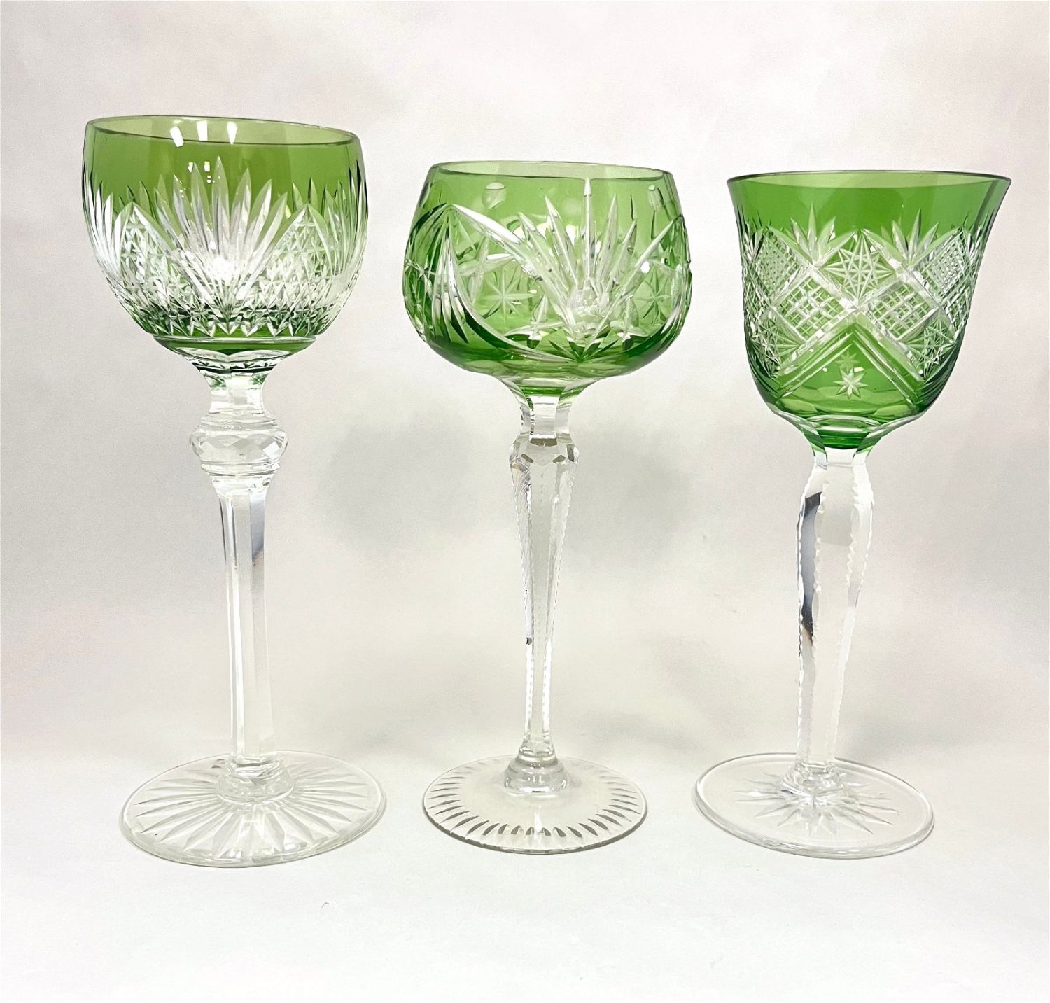 Three green cut to clear goblets in various styles and makers, tallest 8" ht. CONDITION: no chips, cracks, repairs or material defects found. Jaremos attempts to call any material flaw that affects the price, but minor scratches and color variances are inherent to glass and antiques.