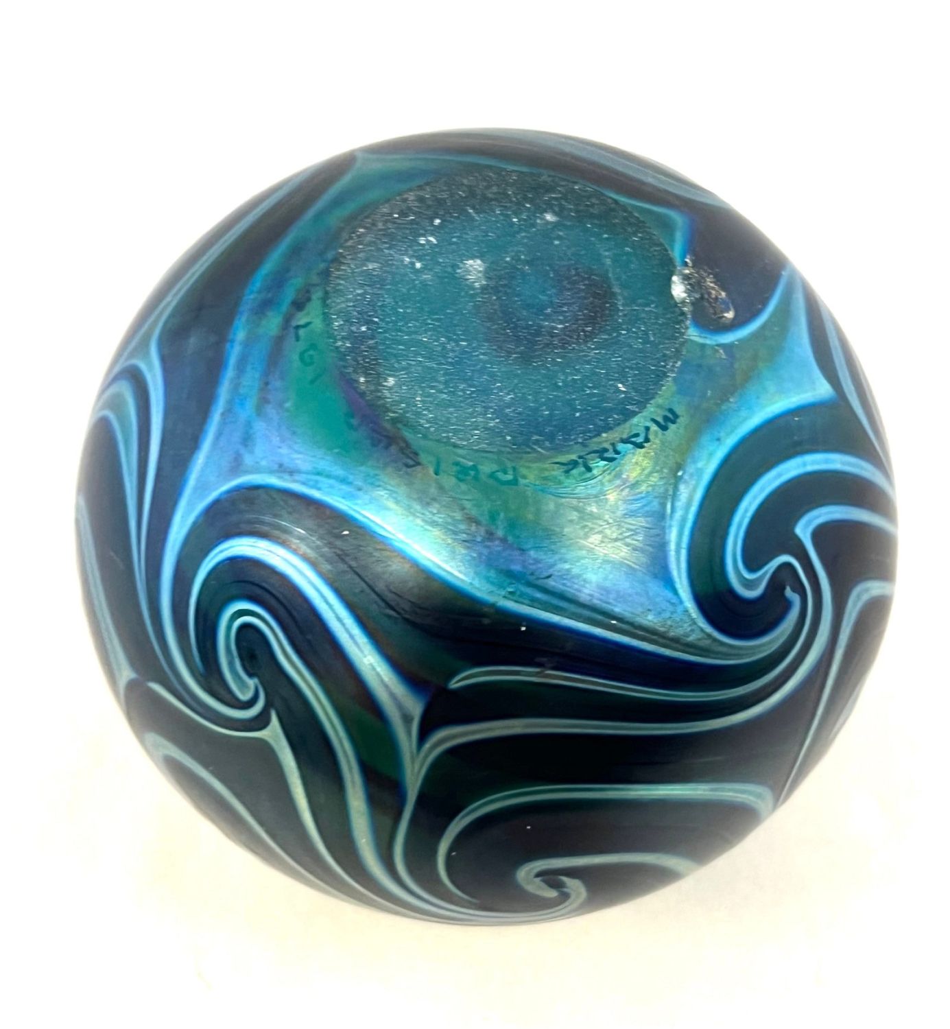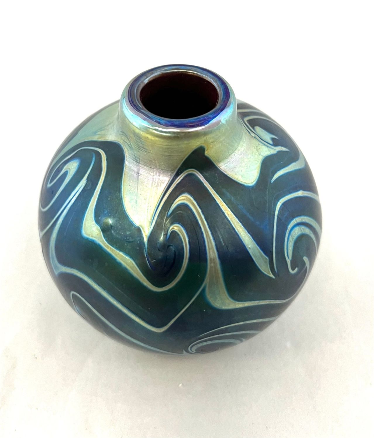 Ovoid Mark Peiser glass vase in iridescen blue with a gold hooked feather, signed Mark Peiser 1974, 3" ht. CONDITION: no chips, cracks, repairs or material defects found. Jaremos attempts to call any material flaw that affects the price, but minor scratches and color variances are inherent to glass and antiques.