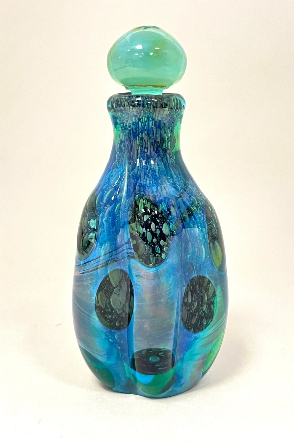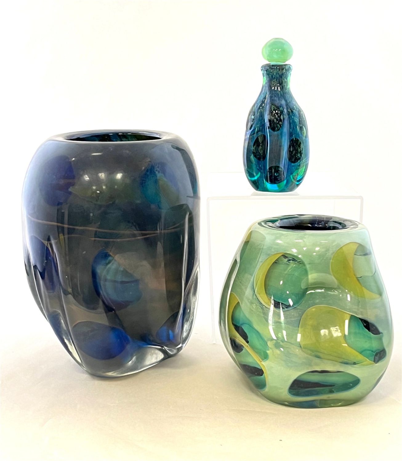 Three Paul Seide glass items including two paperweight vases one in green and one in blue with moons, together with a blue opalescent perfume, all signed Seide; perfume with additional Milropa signature, tallest 7 1/2" ht. CONDITION: no chips, cracks, repairs or material defects found. Jaremos attempts to call any material flaw that affects the price, but minor scratches and color variances are inherent to glass and antiques.