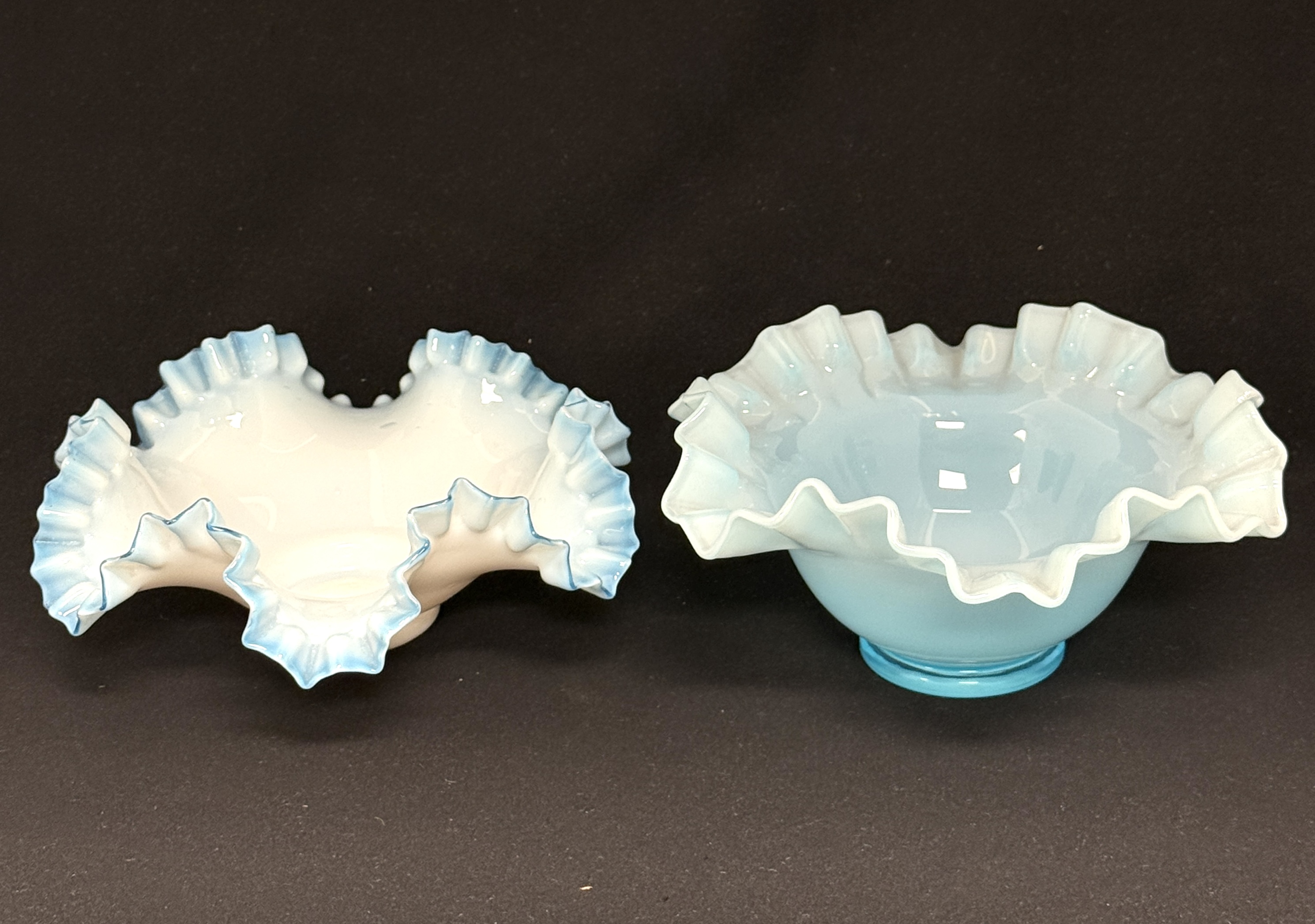 Two satin glass bowls, 7″ wide. CONDITION: no chips, cracks, repairs, or material defects found, Jaremos attempts to call any material flaw that affects the price, but minor scratches and color variances are inherent to glass and antiques.