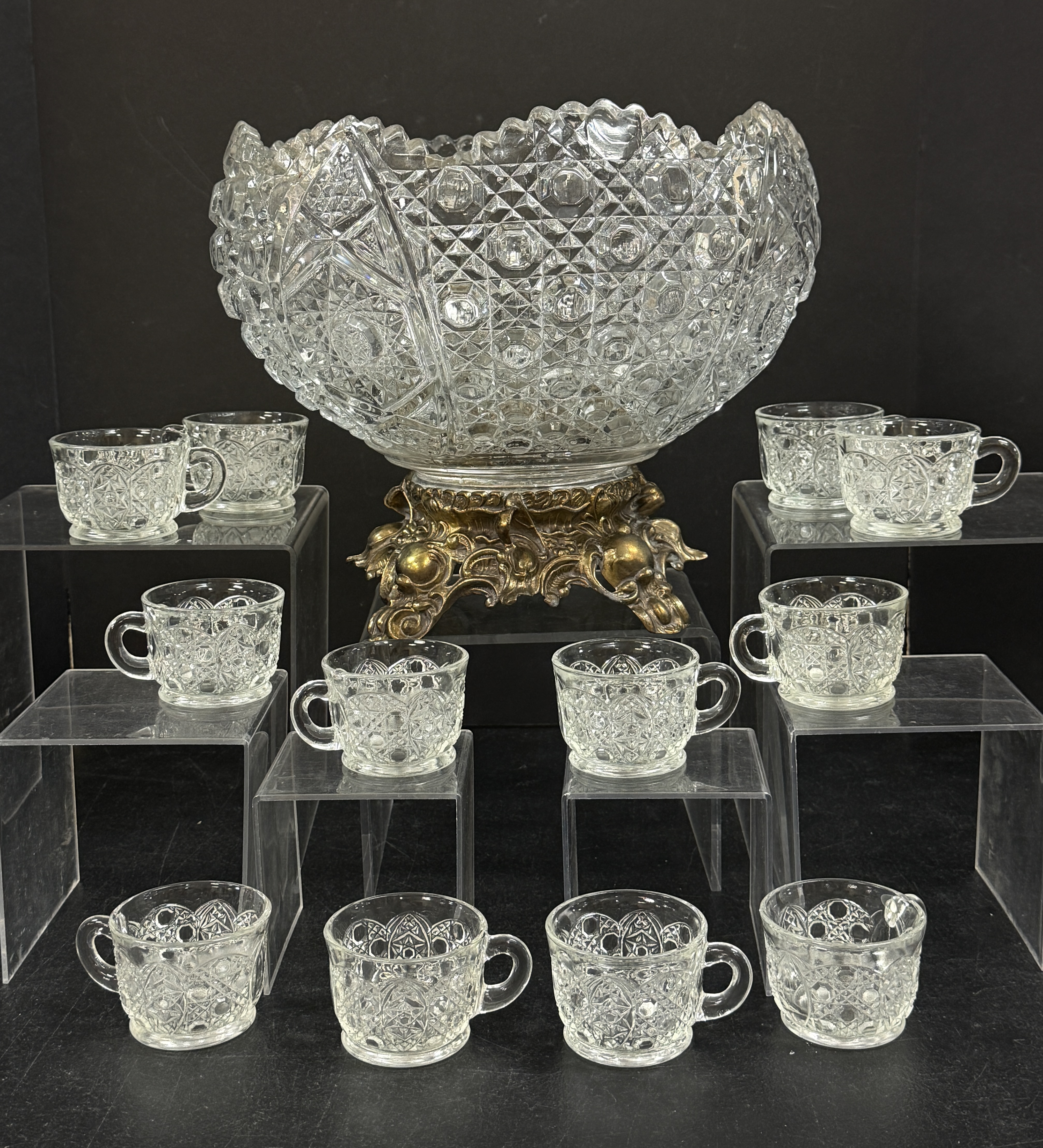 Pressed glass punch bowl and 12 cups set in a metal base in the daisy and button pattern, 11″ ht. CONDITION: no chips, cracks, repairs, or material defects found, Jaremos attempts to call any material flaw that affects the price, but minor scratches and color variances are inherent to glass and antiques.