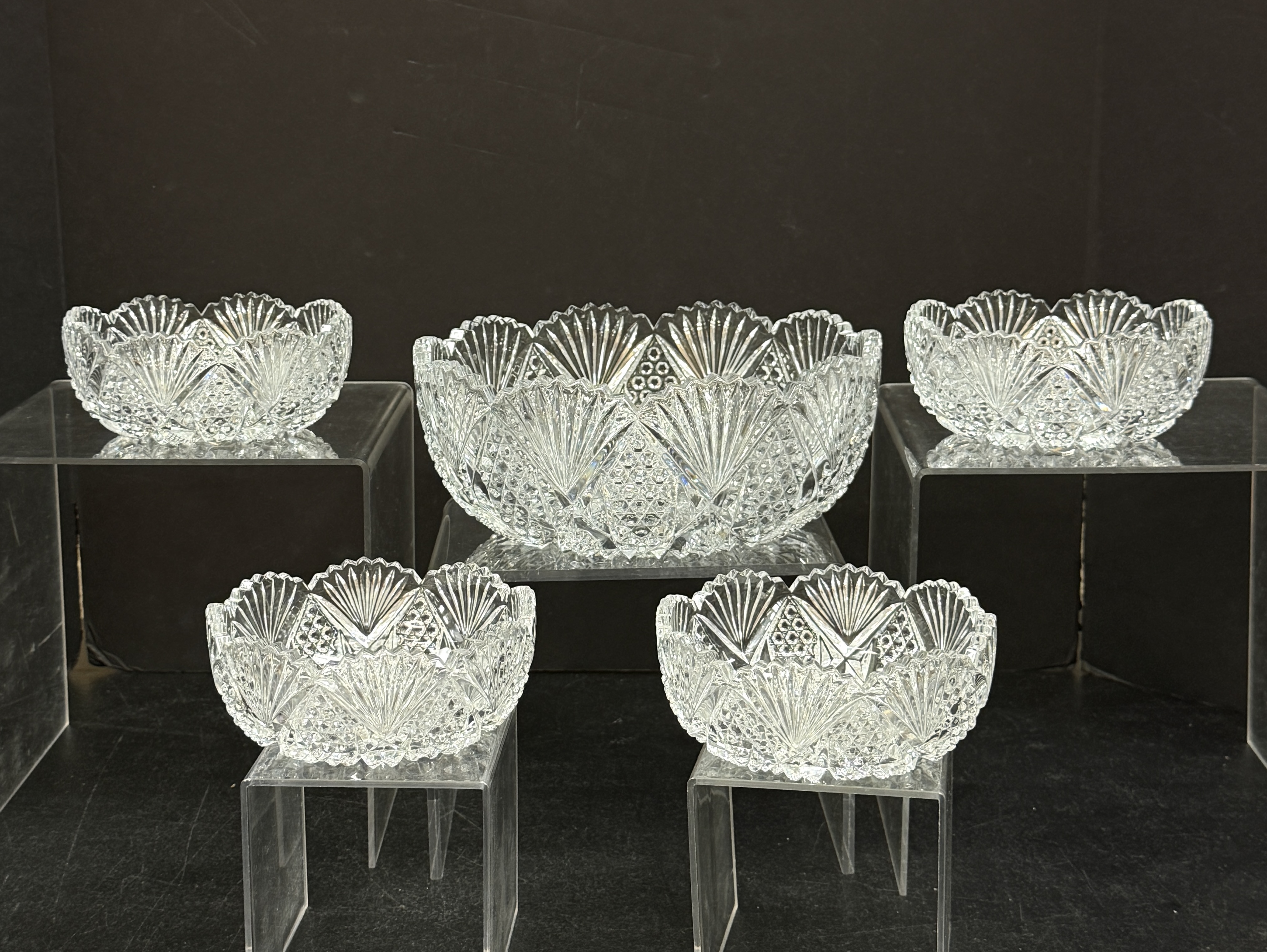 Pressed glass berry set attributed to Mikasa, master bowl 9″ wide. CONDITION: no chips, cracks, repairs, or material defects found, Jaremos attempts to call any material flaw that affects the price, but minor scratches and color variances are inherent to glass and antiques.