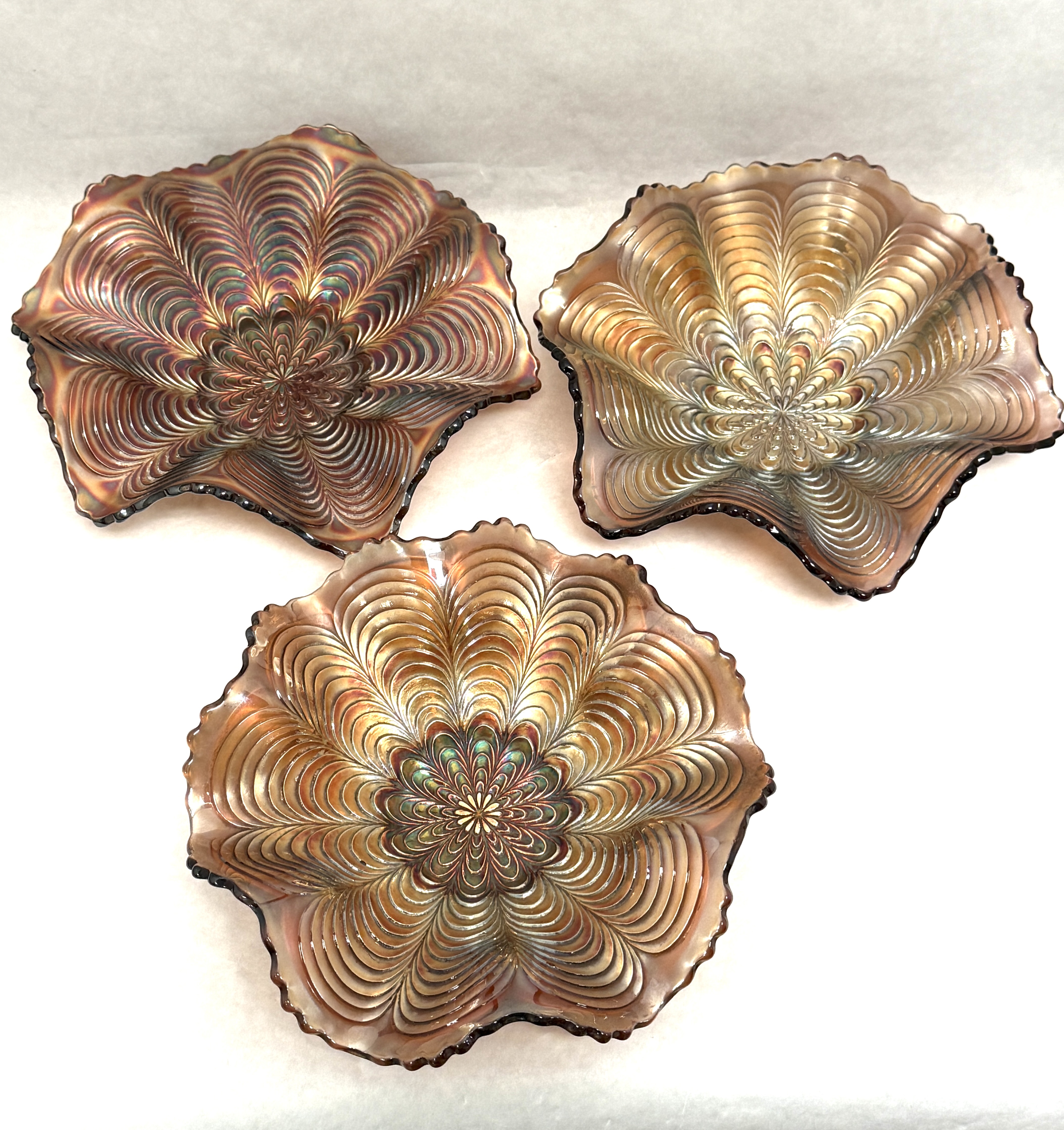 3 Fenton carnival glass dishes in the peacock tail pattern, 6 1/2″ wide. CONDITION: no chips, cracks, repairs, or material defects found, Jaremos attempts to call any material flaw that affects the price, but minor scratches and color variances are inherent to glass and antiques.