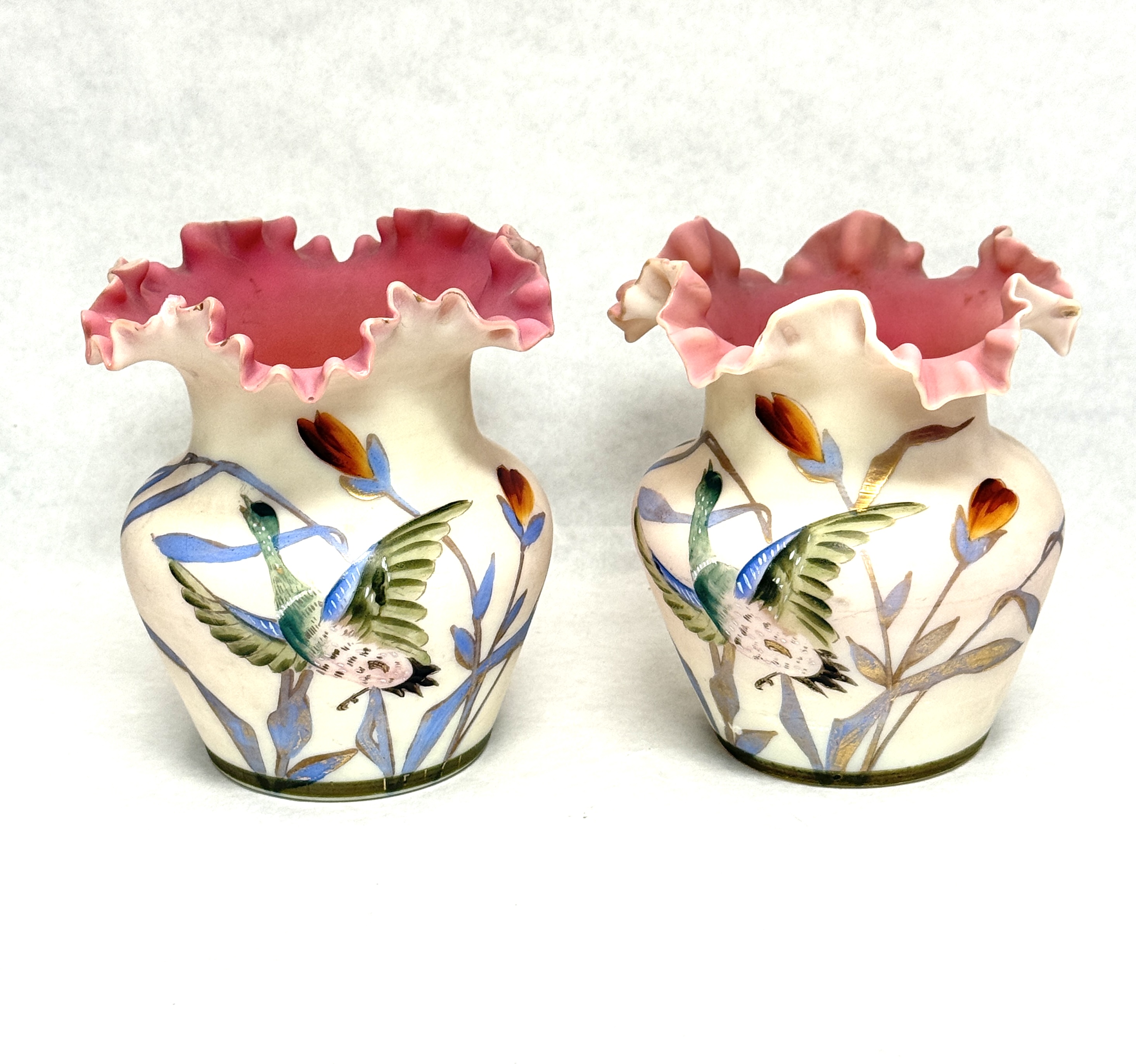 Pair of pink cased satin glass vases decorated with birds on a white background, 5 1/4″ ht. CONDITION: no chips, cracks, repairs, or material defects found, Jaremos attempts to call any material flaw that affects the price, but minor scratches and color variances are inherent to glass and antiques.