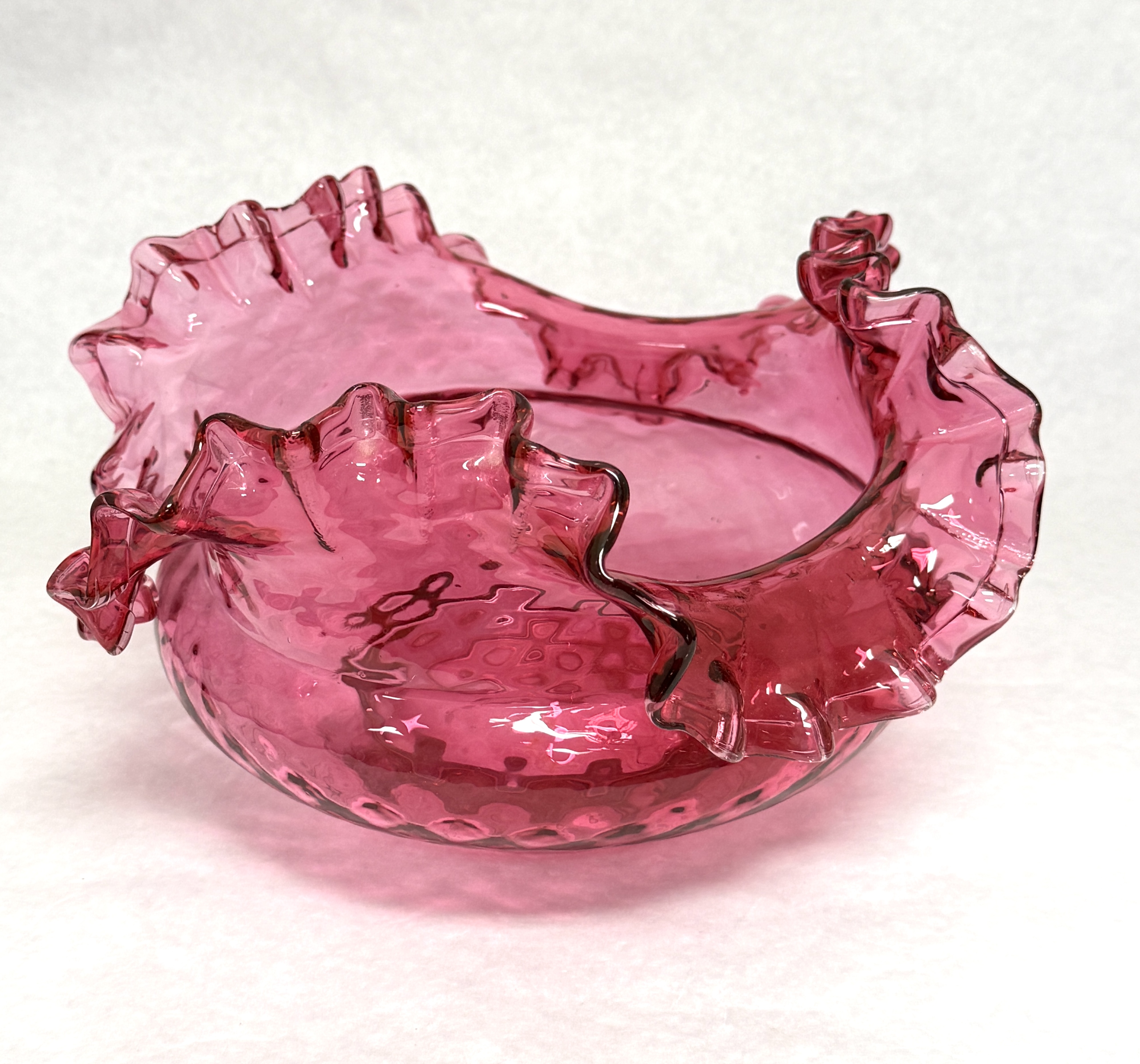 Cranberry bride’s bowl in the optic diamond pattern, 8 1/2″ wide. CONDITION: no chips, cracks, repairs, or material defects found, Jaremos attempts to call any material flaw that affects the price, but minor scratches and color variances are inherent to glass and antiques.