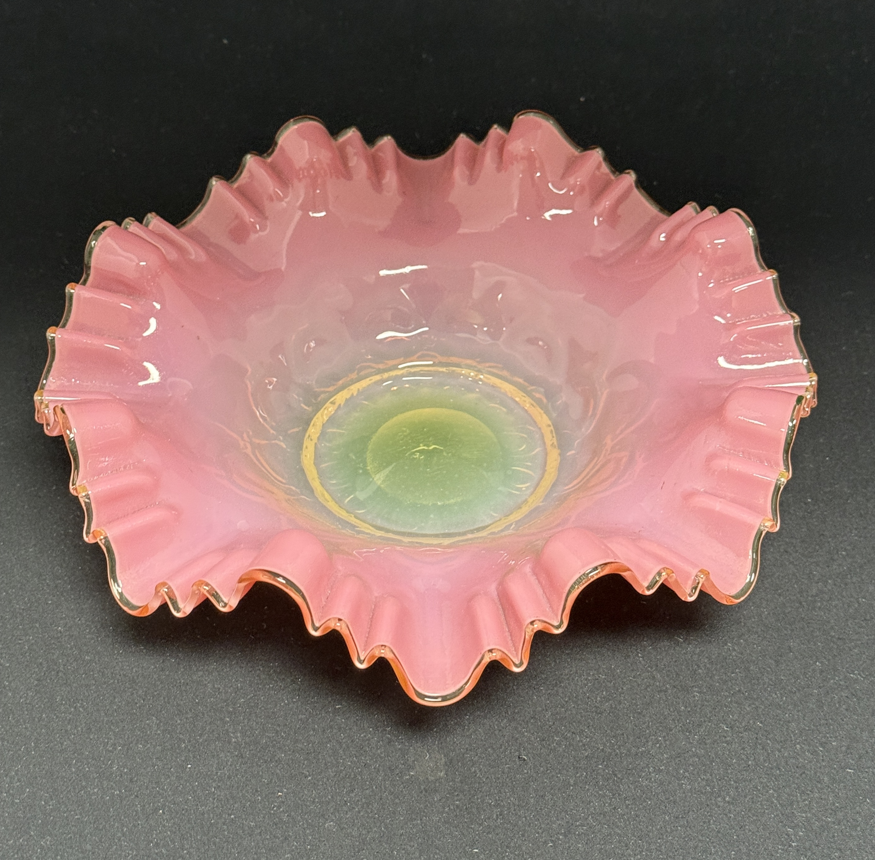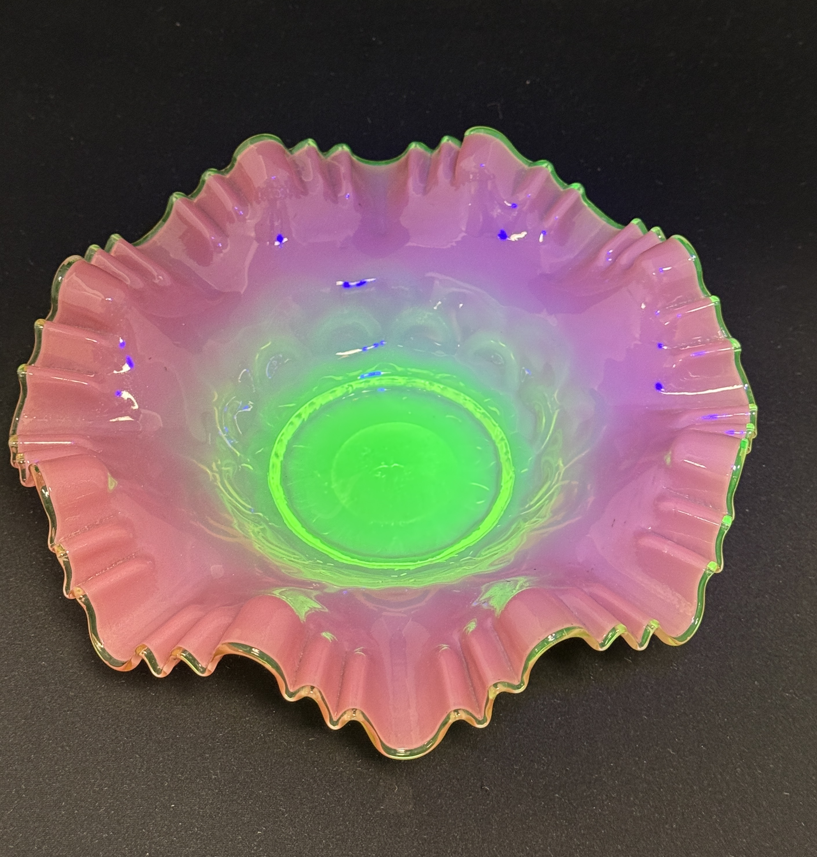 Uranium based Vaseline pink ruffle top bride’s bowl, glows under blacklight; diameter 8 3/4″. CONDITION: no chips, cracks, repairs, or material defects found, Jaremos attempts to call any material flaw that affects the price, but minor scratches and color variances are inherent to glass and antiques.
