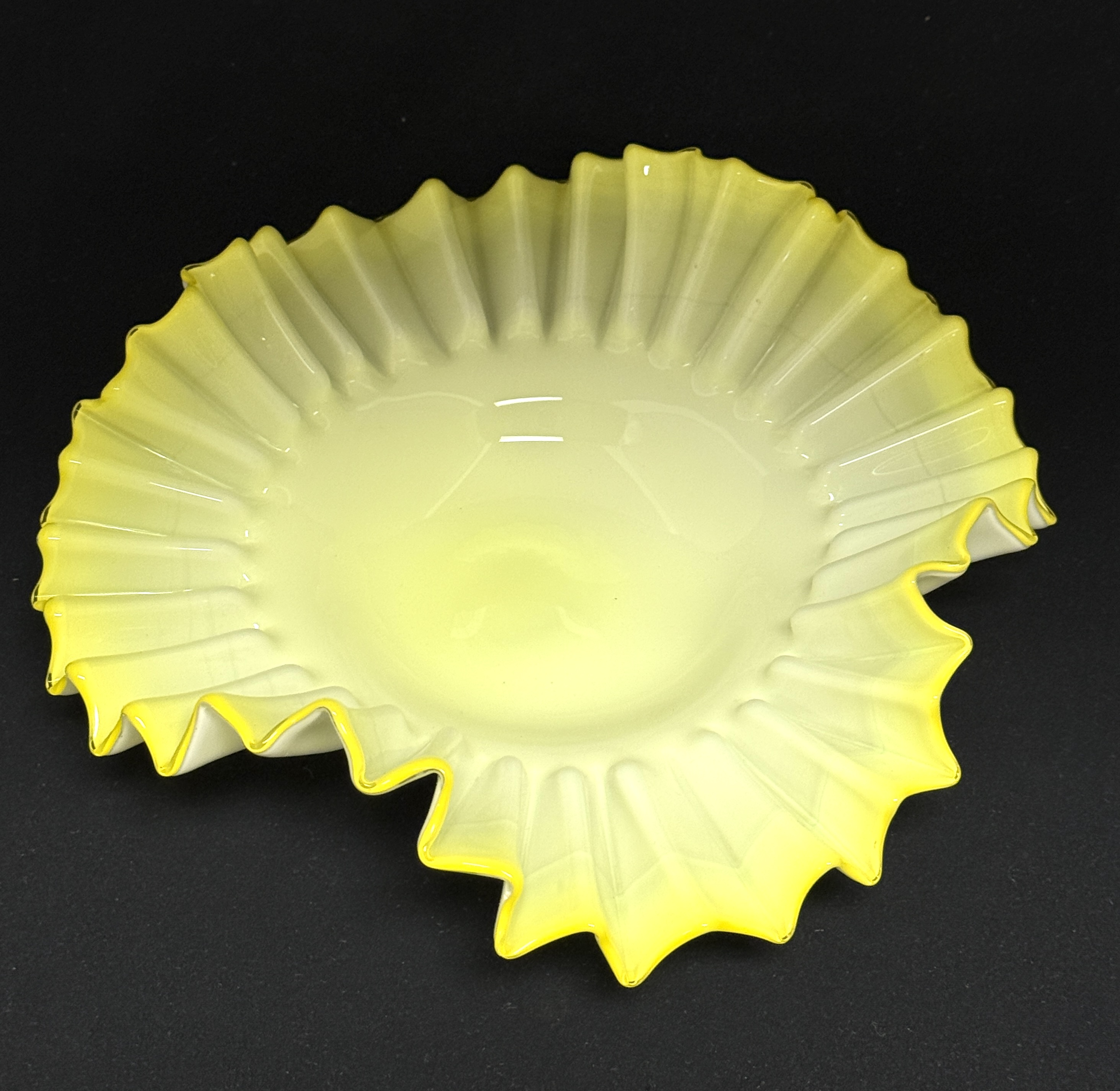 Yellow satin glass brides bowl, 11″ wide. CONDITION: no chips, cracks, repairs, or material defects found, Jaremos attempts to call any material flaw that affects the price, but minor scratches and color variances are inherent to glass and antiques.