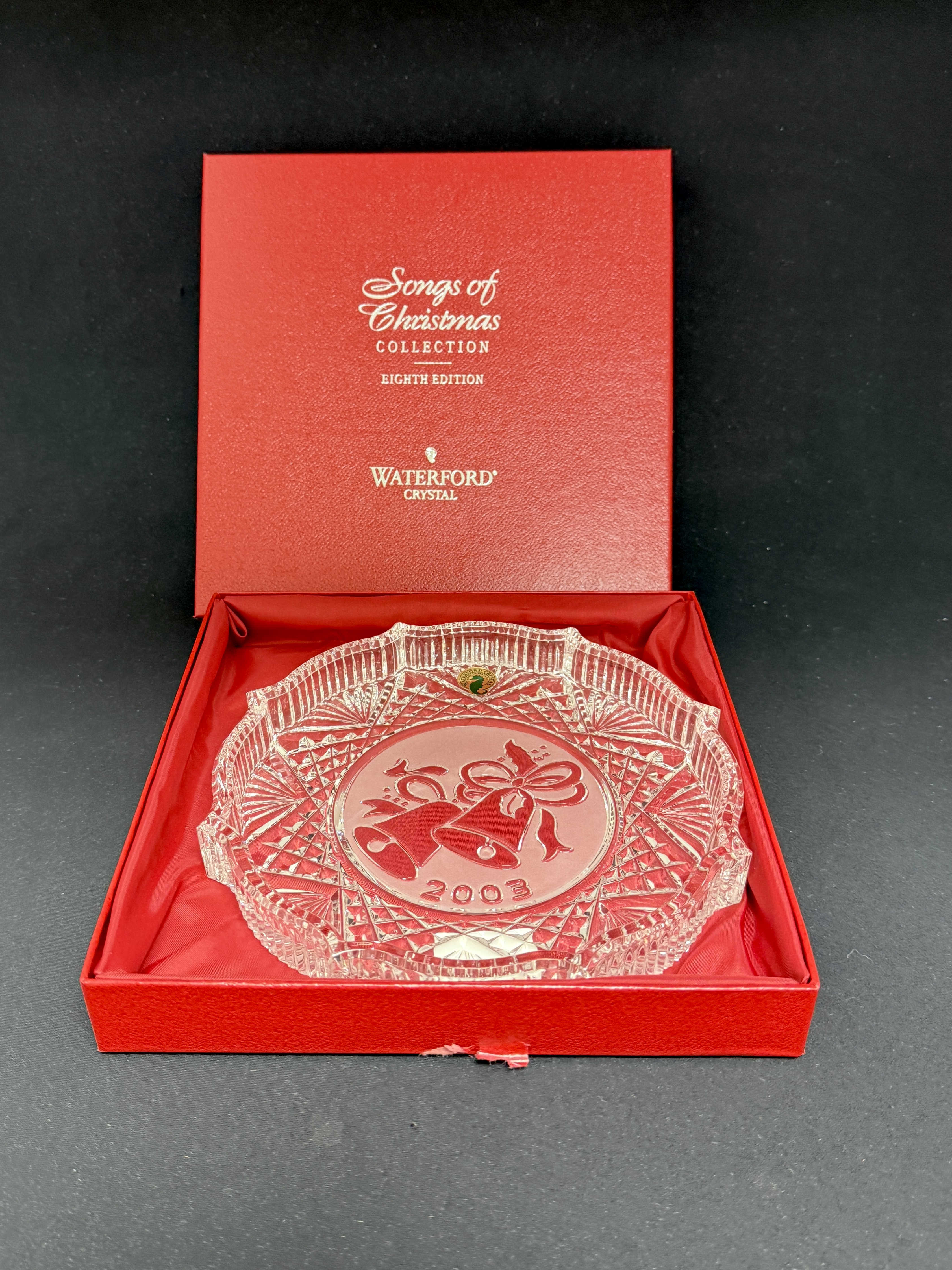 Waterford 2003 Songs of Christmas plate 8th edition in box; diameter 7 3/4″. CONDITION: no chips, cracks, repairs, or material defects found, Jaremos attempts to call any material flaw that affects the price, but minor scratches and color variances are inherent to glass and antiques.
