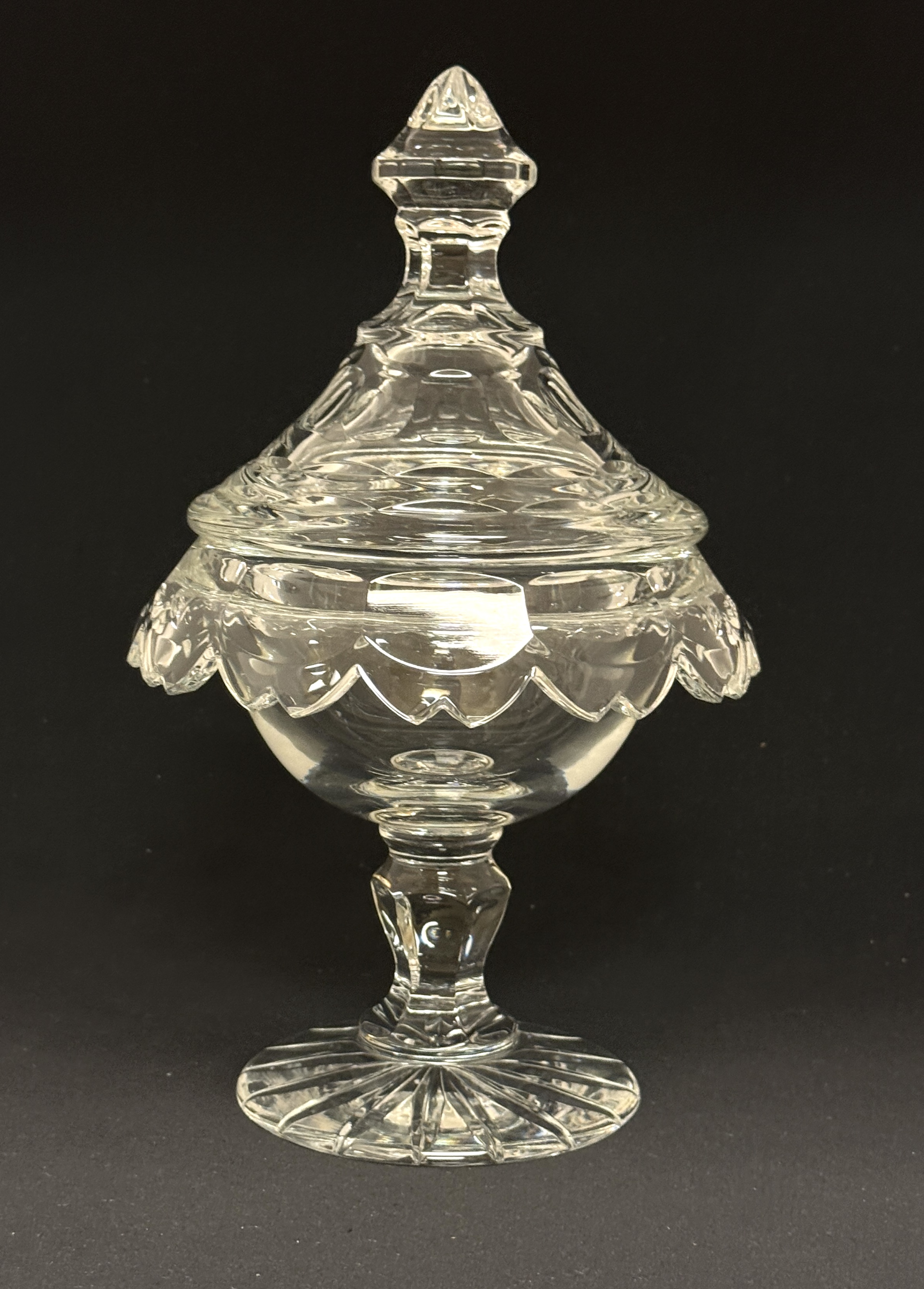 Crystal footed covered candy dish; ht. 12″. CONDITION: no chips, cracks, repairs, or material defects found, Jaremos attempts to call any material flaw that affects the price, but minor scratches and color variances are inherent to glass and antiques.
