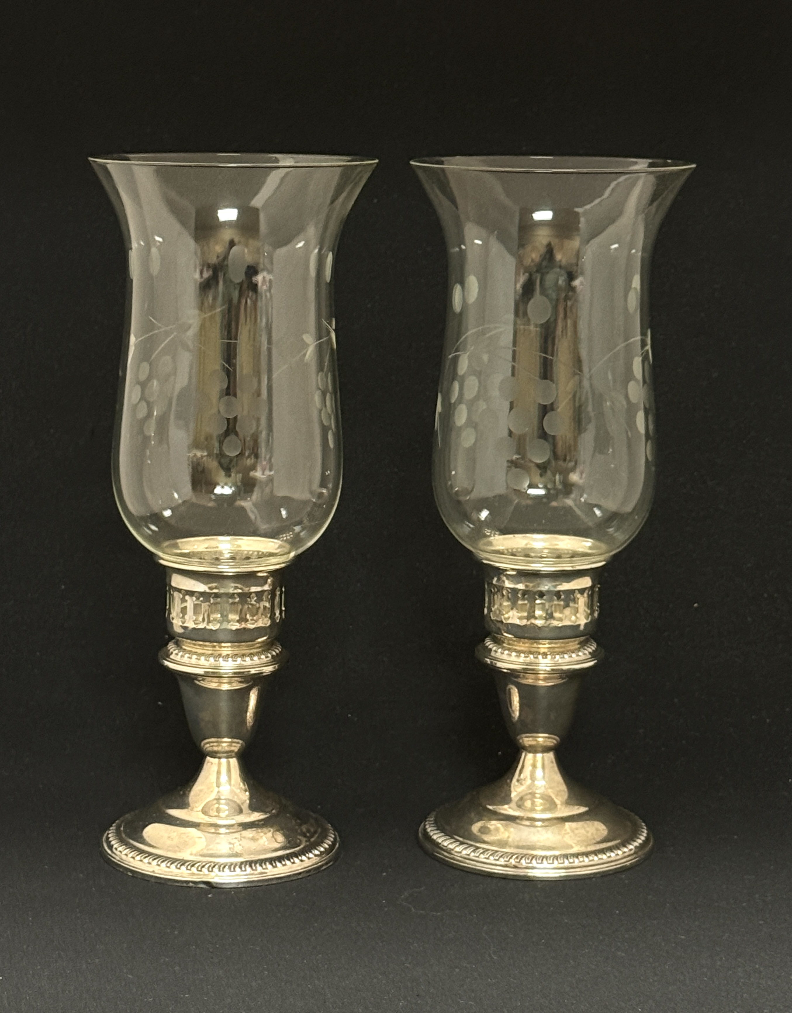 2 etched crystal hurricane globes with sterling silver metal bases; ht. 9 3/4″. CONDITION: no chips, cracks, repairs, or material defects found, Jaremos attempts to call any material flaw that affects the price, but minor scratches and color variances are inherent to glass and antiques.