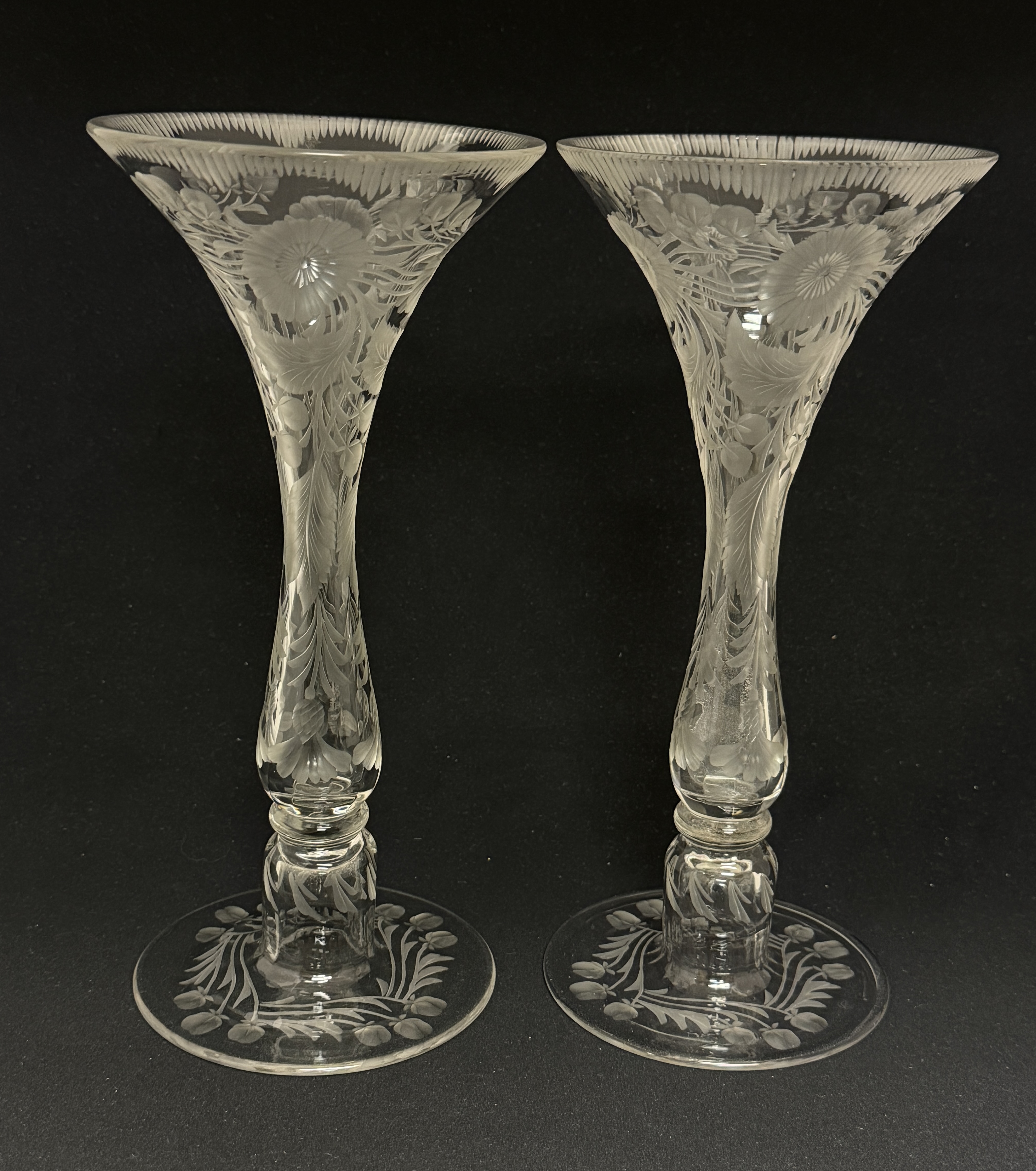 2 etched crystal trumpet vases; ht 9 7/8″. CONDITION: no chips, cracks, repairs, or material defects found, Jaremos attempts to call any material flaw that affects the price, but minor scratches and color variances are inherent to glass and antiques.