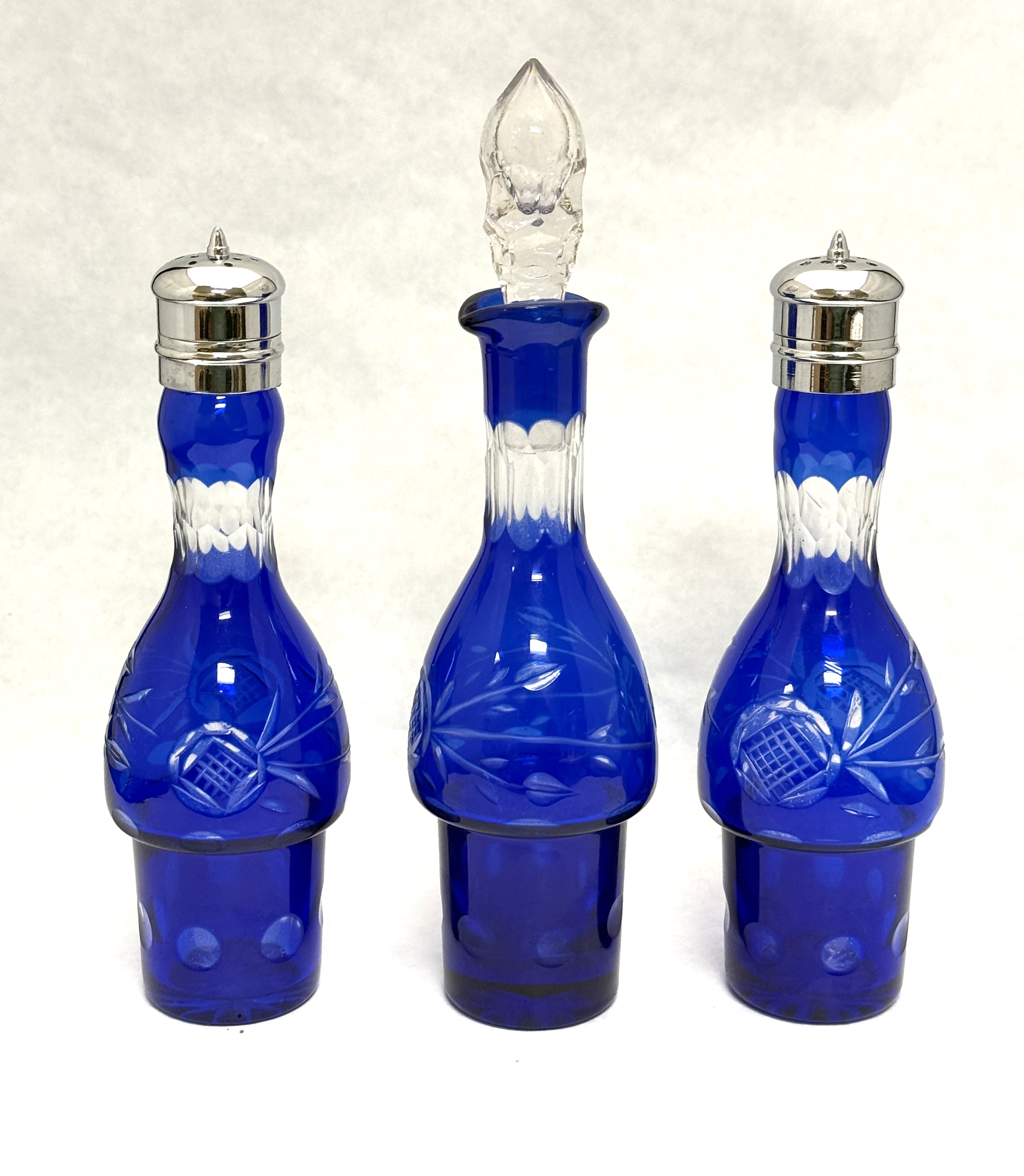 3 cobalt cut to clear condiment bottles, 2 shakers, 1 oil/vinegar; tallest 8 7/8″. CONDITION: no chips, cracks, repairs, or material defects found, Jaremos attempts to call any material flaw that affects the price, but minor scratches and color variances are inherent to glass and antiques.