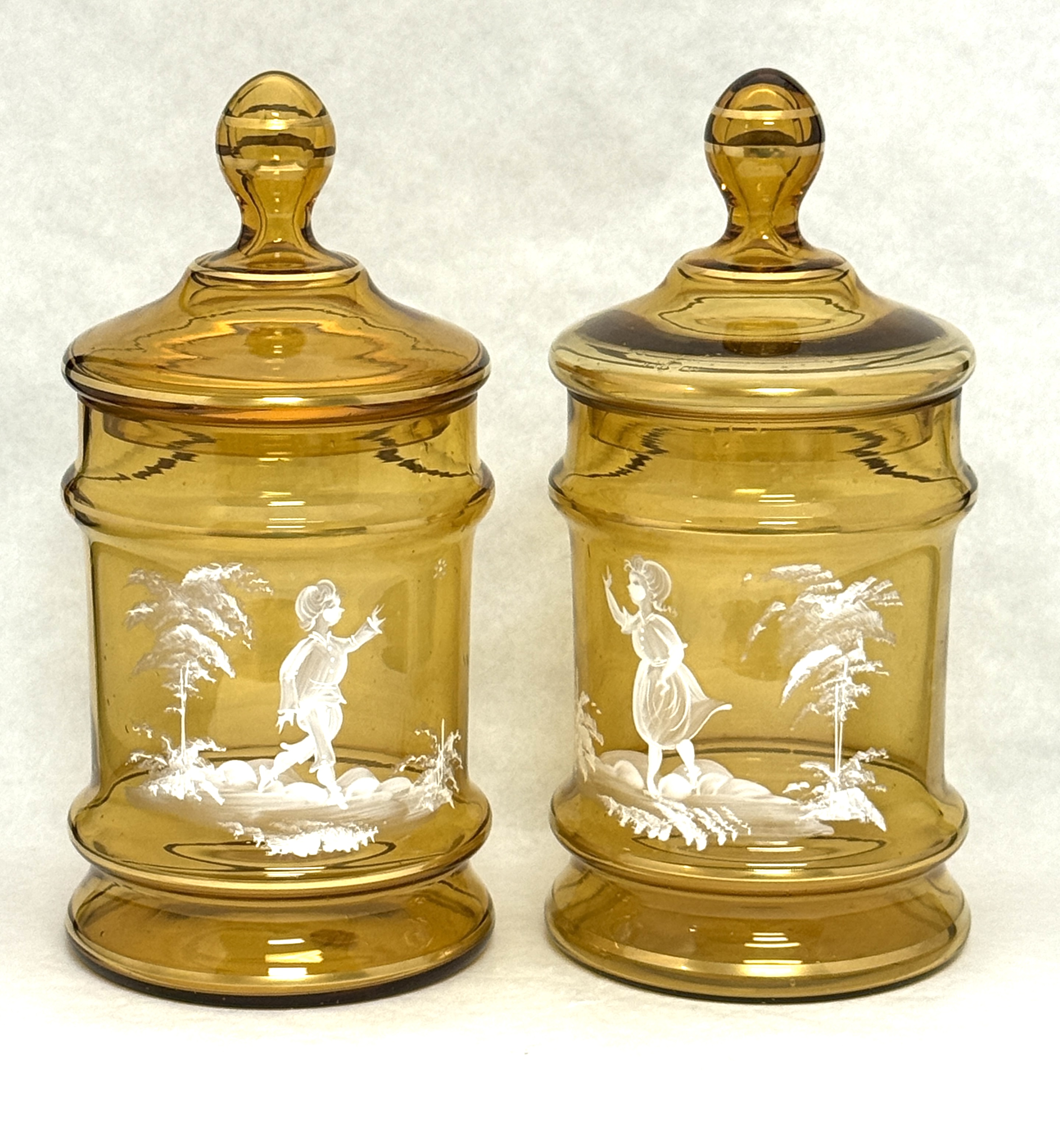 2 amber Mary Gregory biscuit jars; ht. 10″. CONDITION: no chips, cracks, repairs, or material defects found, Jaremos attempts to call any material flaw that affects the price, but minor scratches and color variances are inherent to glass and antiques.