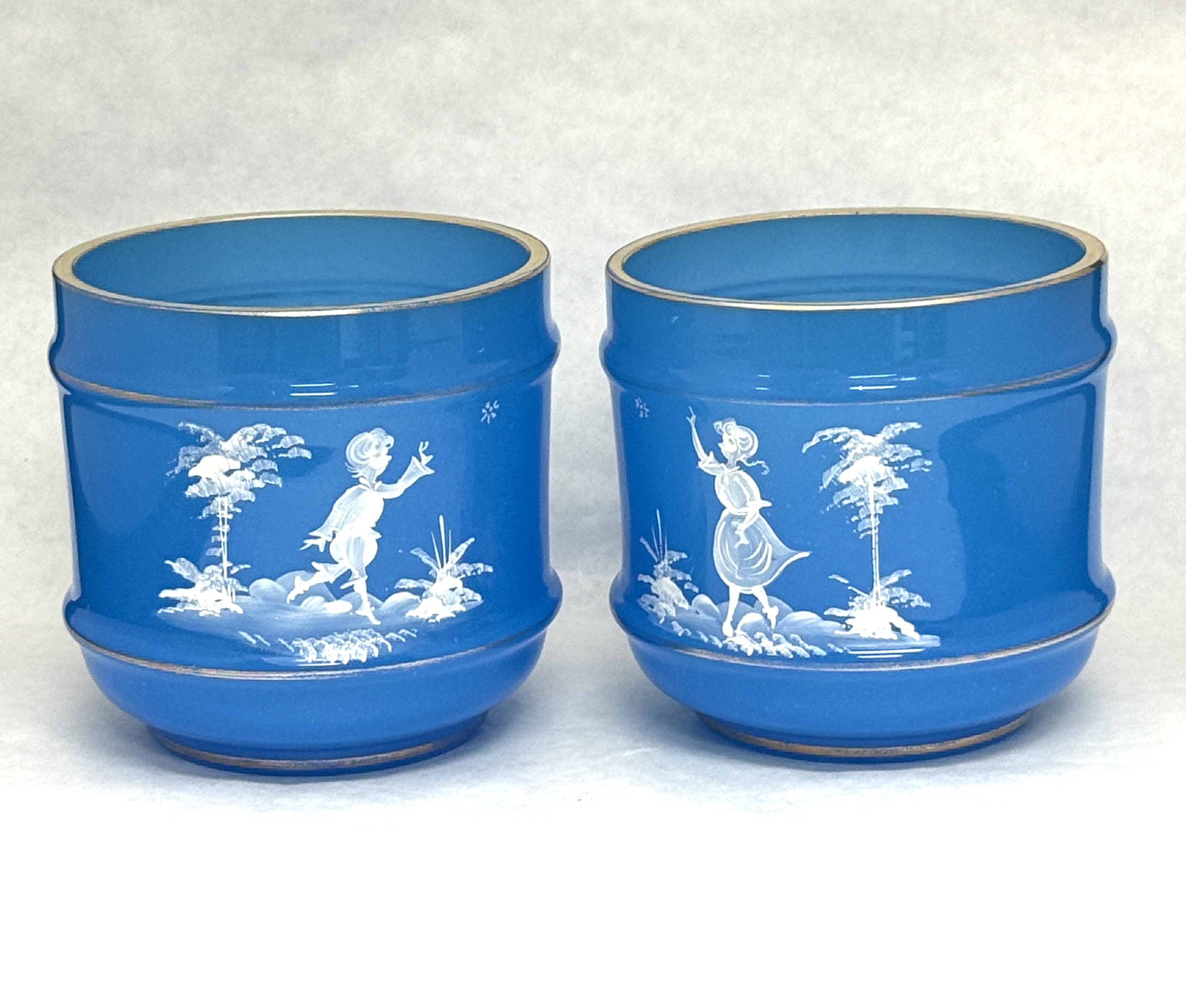 2 blue Mary Gregory cache jars; ht. 5″. CONDITION: no chips, cracks, repairs, or material defects found, Jaremos attempts to call any material flaw that affects the price, but minor scratches and color variances are inherent to glass and antiques.