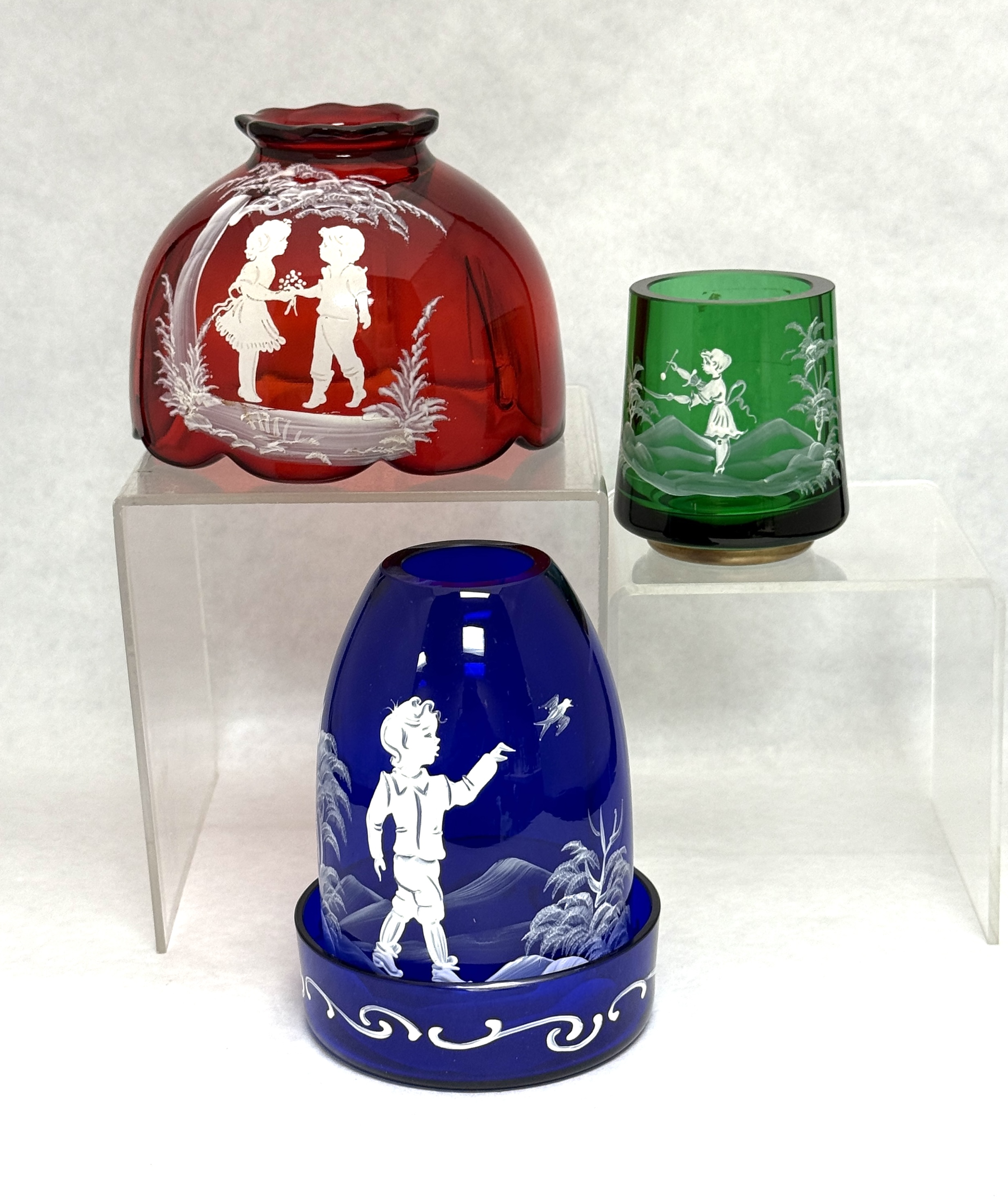 3 miscellaneous Mary Gregory items, including a votive, a fairy lamp, and a shade; tallest 5″. CONDITION: no chips, cracks, repairs, or material defects found, Jaremos attempts to call any material flaw that affects the price, but minor scratches and color variances are inherent to glass and antiques.