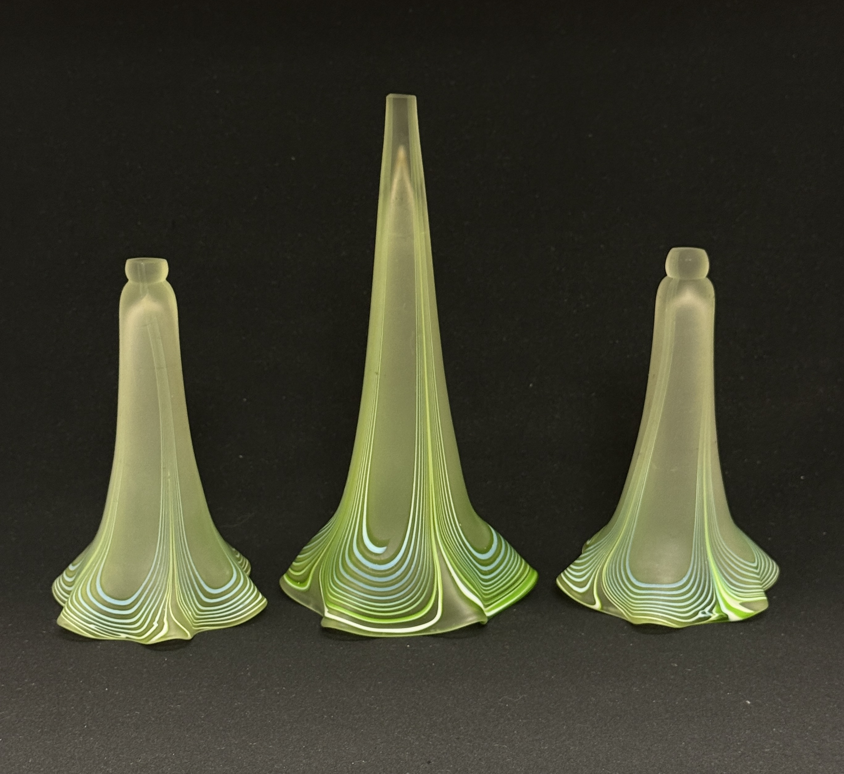 3 green with white swirls epergne trumpets, one large and 2 small; tallest 8 3/4″. CONDITION: no chips, cracks, repairs, or material defects found, Jaremos attempts to call any material flaw that affects the price, but minor scratches and color variances are inherent to glass and antiques.