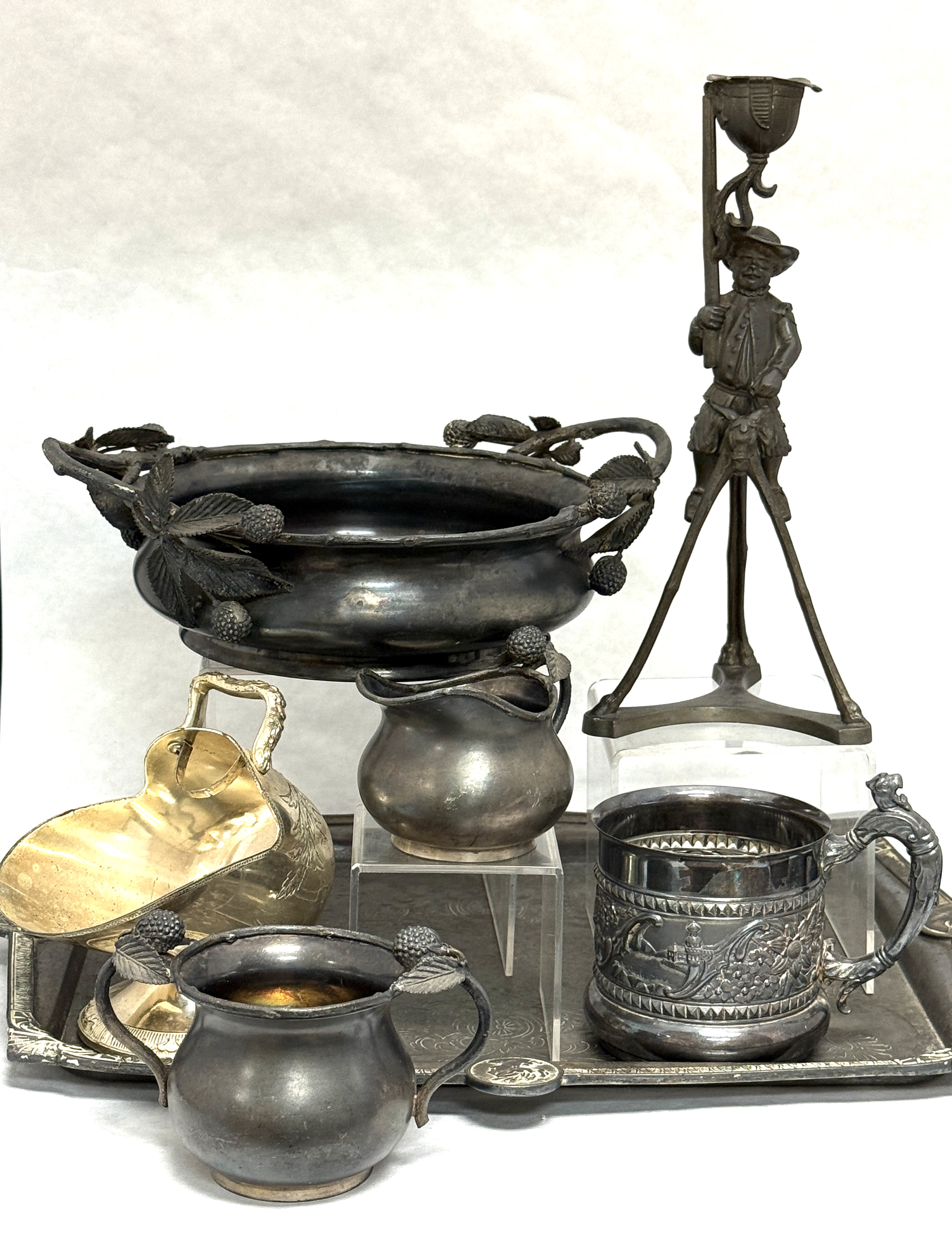 7 silver plate items including Reed & Barton figural candlestick, Hartford berry set, Pairpoint mug and more; tray 15″ length. CONDITION: no chips, cracks, repairs, or material defects found, Jaremos attempts to call any material flaw that affects the price, but minor scratches and color variances are inherent to glass and antiques.